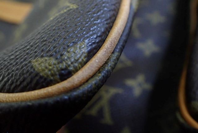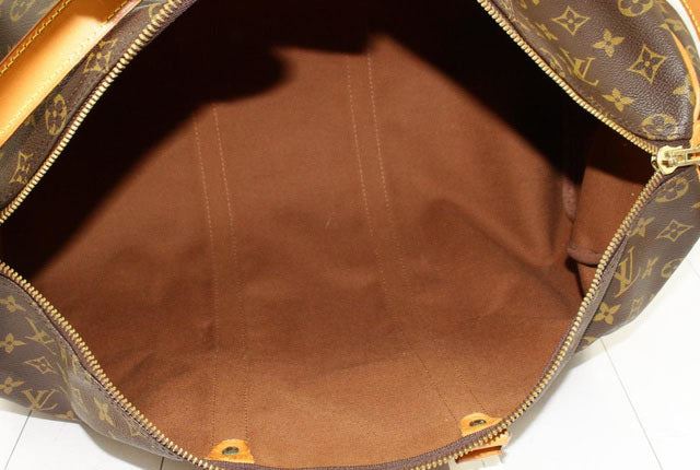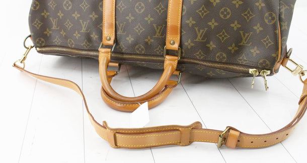 Brown and tan Monogram coated canvas Louis Vuitton Keepall Bandouliere with gold-tone hardware, tan vachetta leather trim, dual rolled top handles, brown canvas lining, single interior compartment and two-way zip closure at top. Detachable shoulder strap.