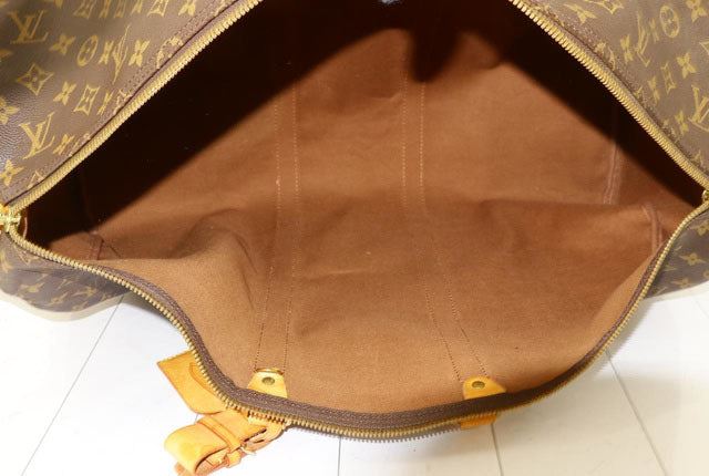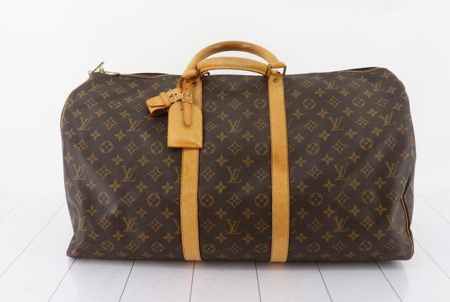 Brown and tan monogram coated canvas Louis Vuitton Keepall th gold-tone hardware, tan vachetta leather trim featuring yellow contrast stitching, dual rolled top handles, luggage tag, brown canvas lining and zip closure at top. 22"x10"x12"xBag Dro