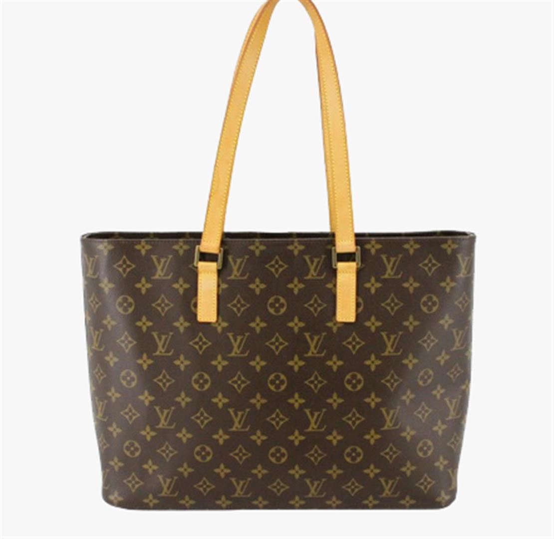 Brown and tan monogram coated canvas Louis Vuitton Luco tote with gold-tone hardware, tan vachetta leather trim, dual flat shoulder straps, beige Alcantara lining, five pockets at interior walls, single zip pocket and zip closure at top. 15.5"x3.5"x12"