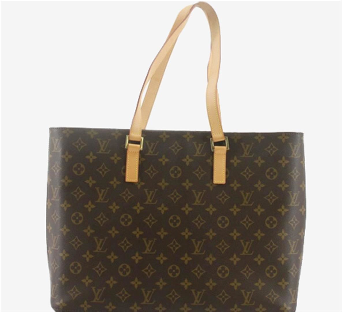 Brown and tan monogram coated canvas Louis Vuitton Luco tote with gold-tone hardware, tan vachetta leather trim, dual flat shoulder straps, beige Alcantara lining, five pockets at interior walls, single zip pocket and zip closure at top. 15.5"x3.5"x12"xB