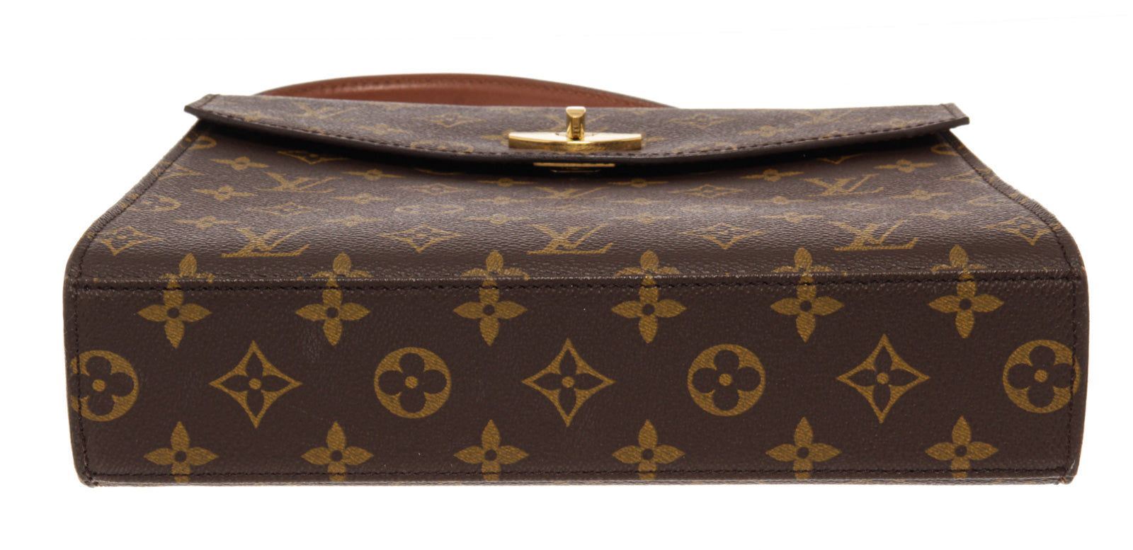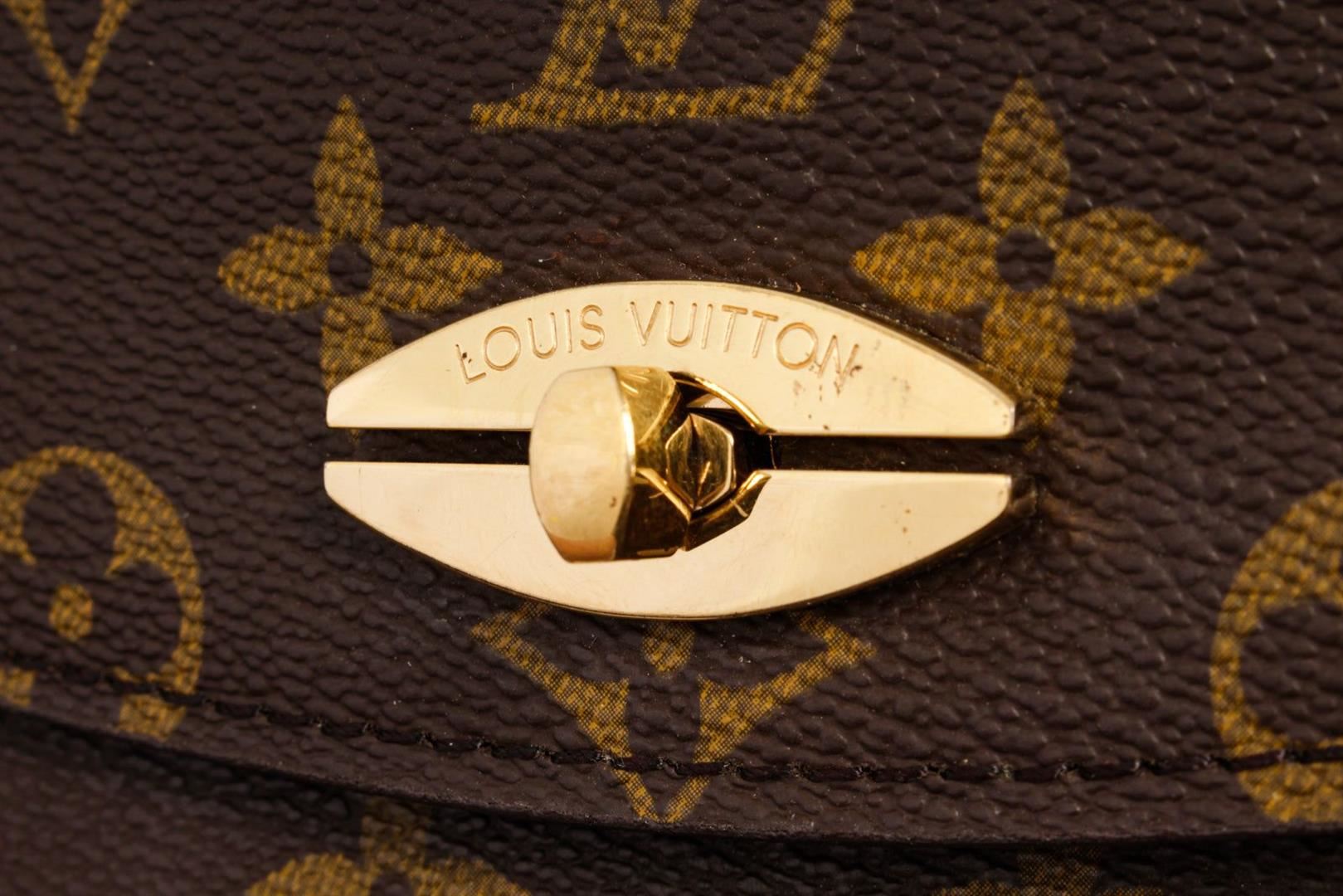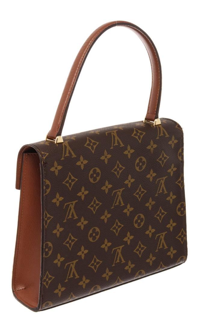 Brown monogram canvas leather Louis Vuitton Malesherbes handbag with a twist lock on the font, brown lining interior with one open pocket and one zipper pocket, and gold-tone hardware.