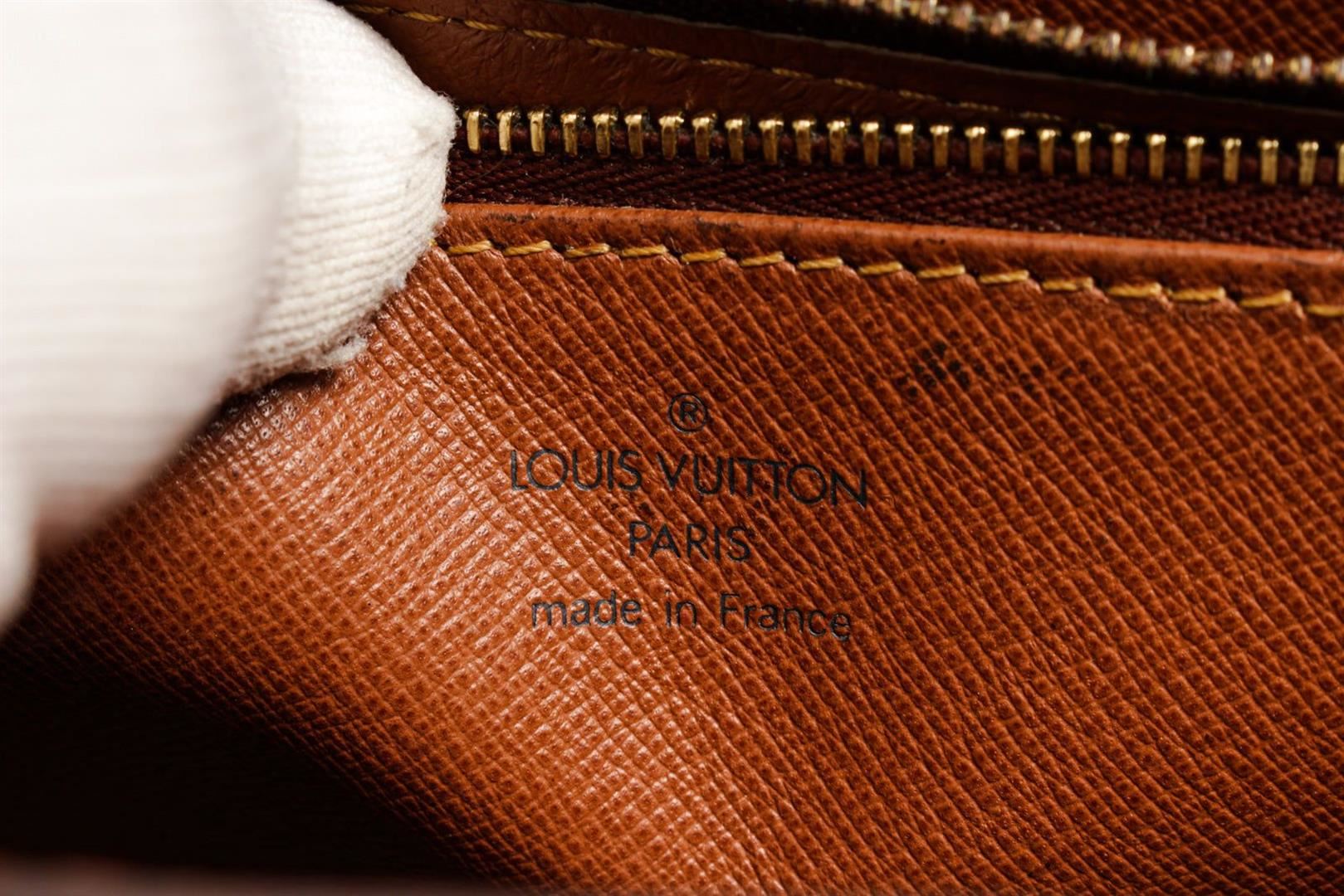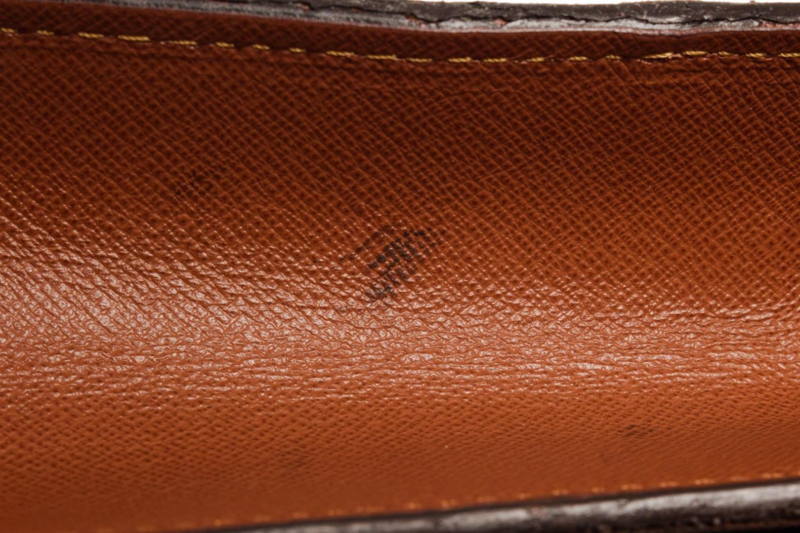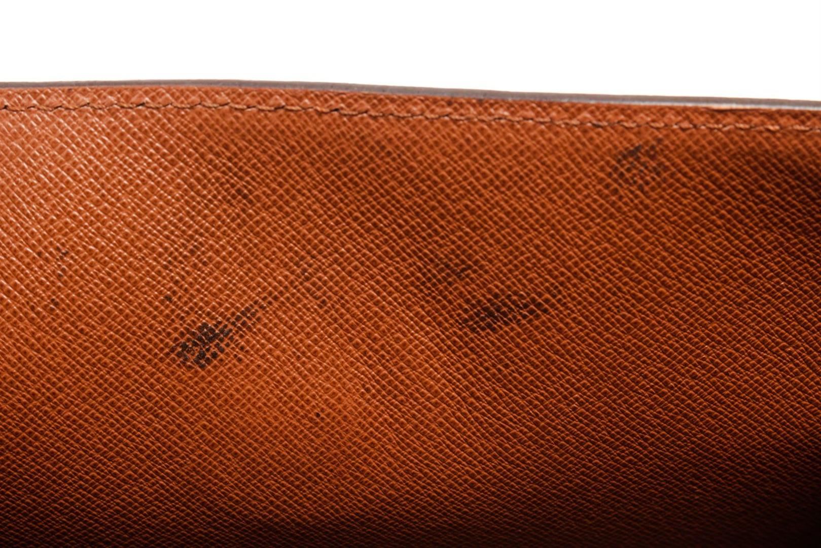 Brown monogram canvas leather Louis Vuitton Malesherbes handbag with a twist lock on the font, brown lining interior with one open pocket and one zipper pocket, and gold-tone hardware.