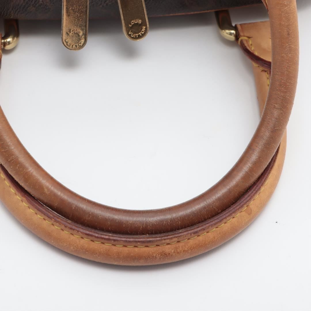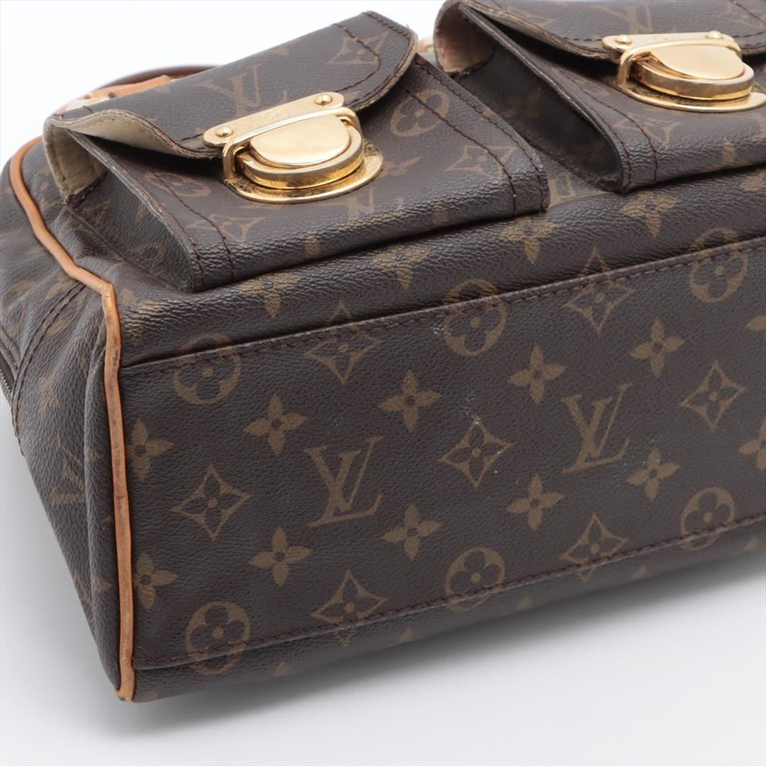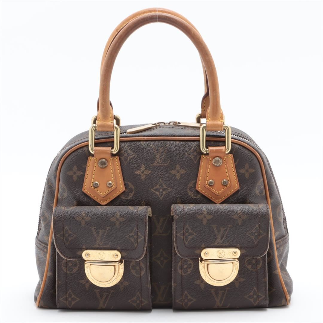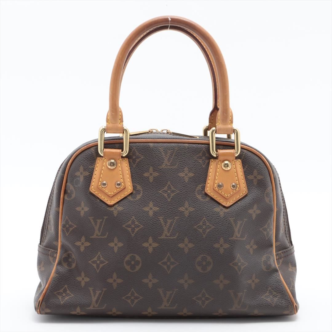 Brown and tan monogram coated canvas Louis Vuitton Manhattan PM with gold-tone hardware, tan vachetta leather trim, dual rolled handles, dual exterior pockets with push-lock closures, beige Alcantara lining, single open pocket at interior wall and two-way