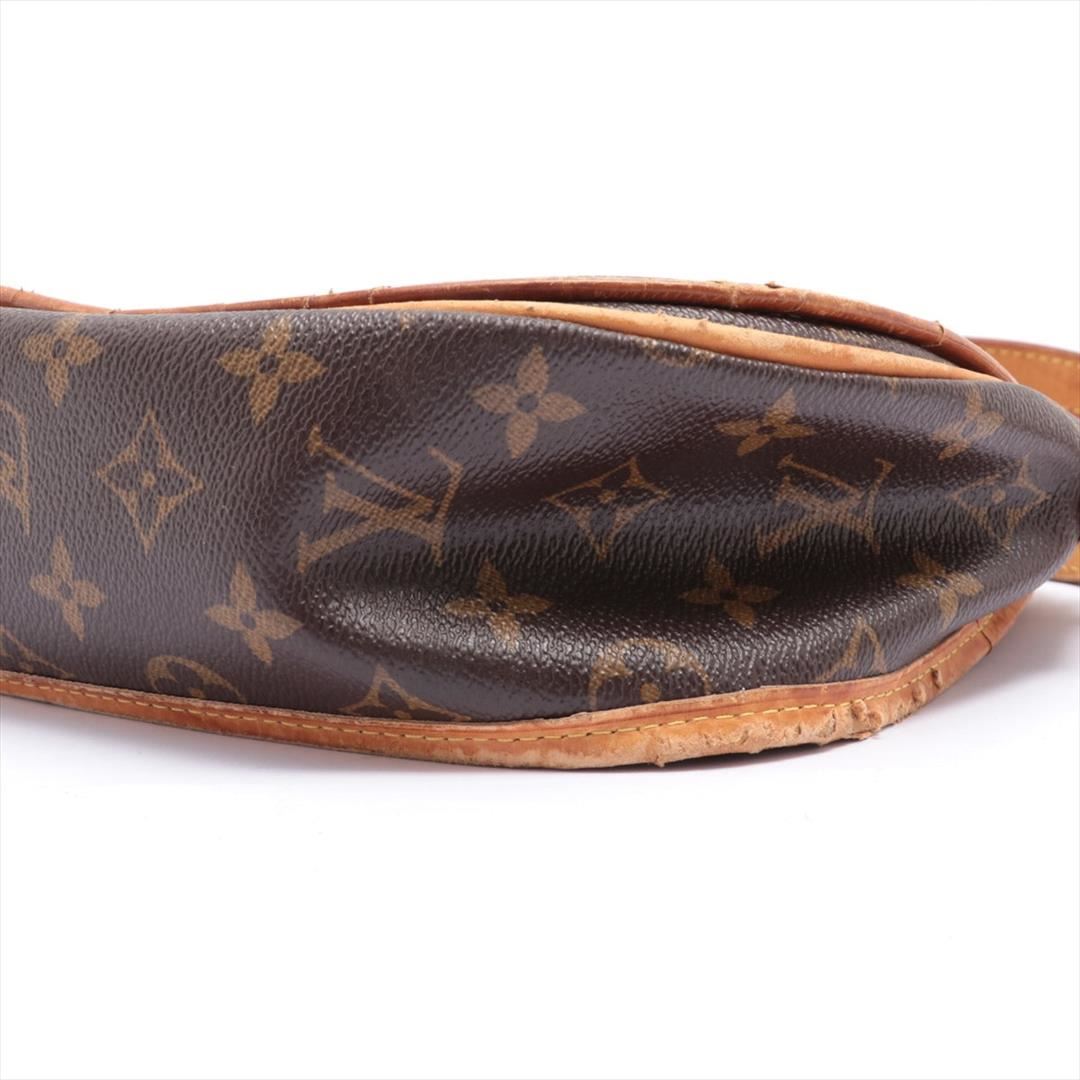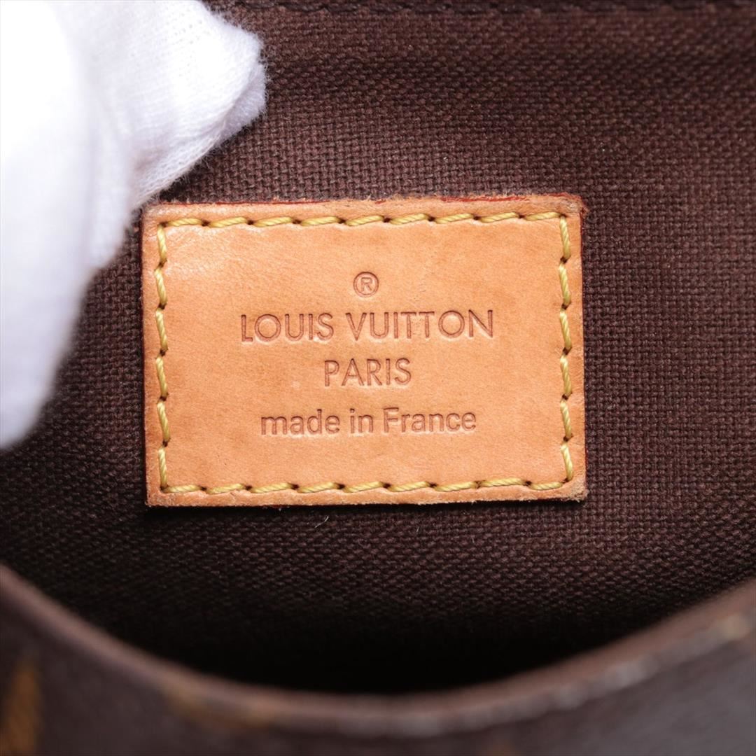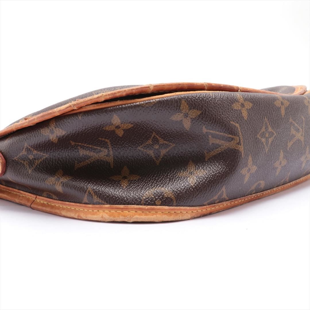 Brown and tan monogram coated canvas Louis Vuitton Menilmontant PM Shoulder Bag with leather trim shoulder bag with gold-tone hardware featuring two flat pockets under the flap, one large zip pocket and flat leather handles with hidden magnetic snap closu