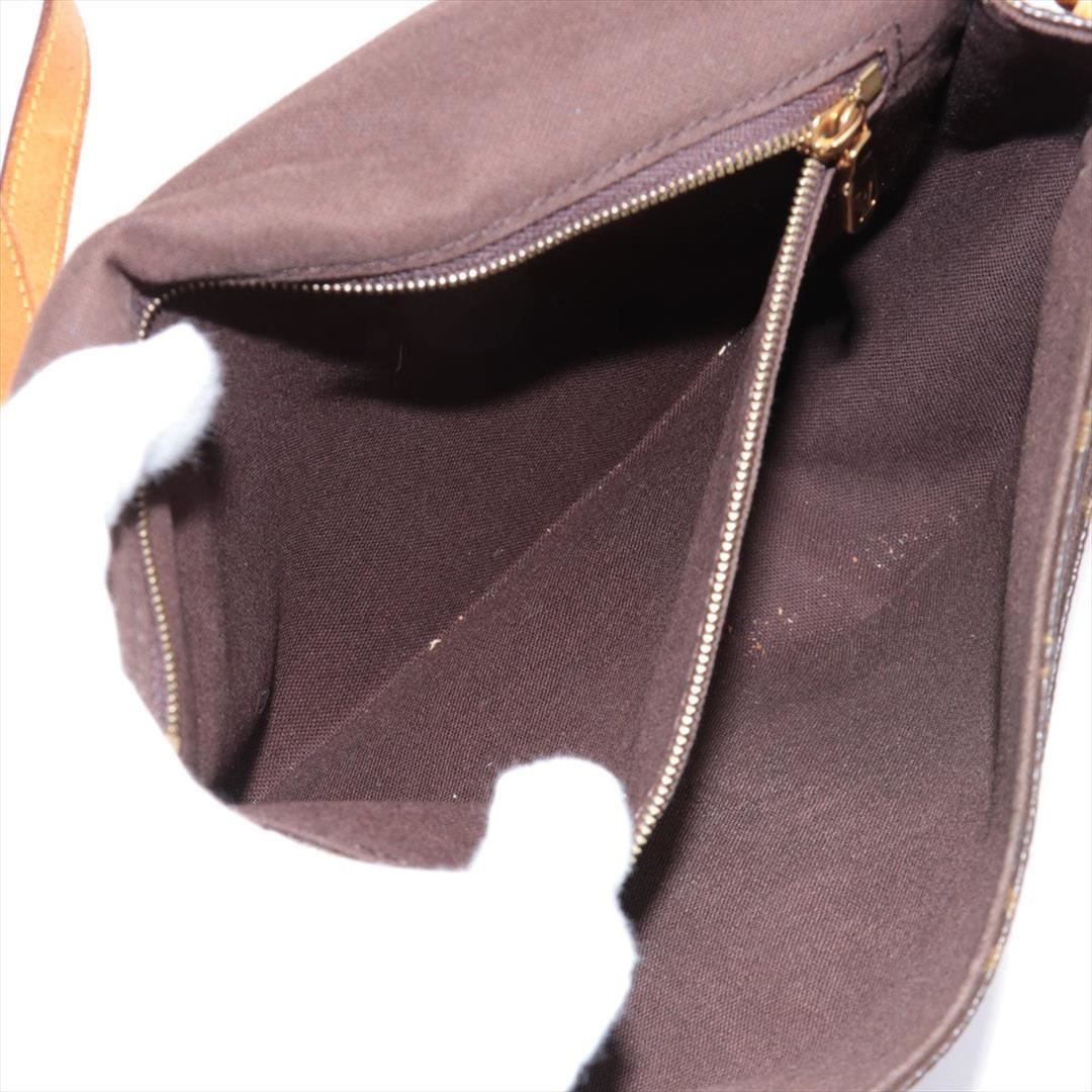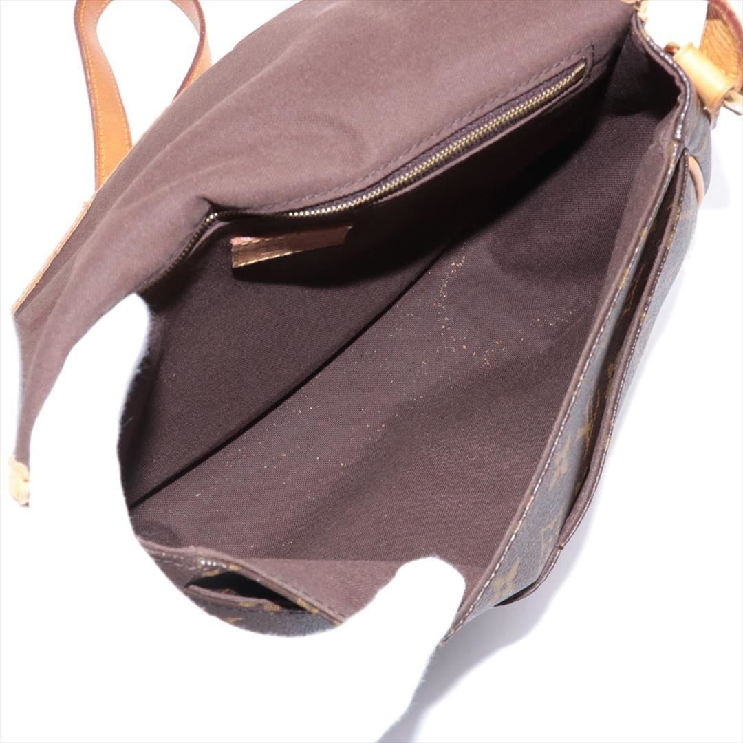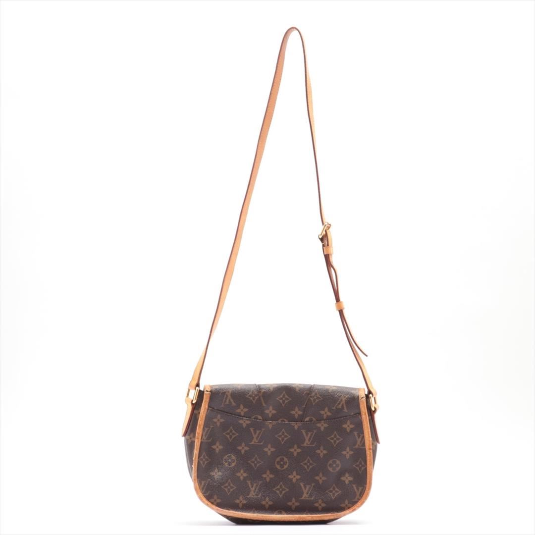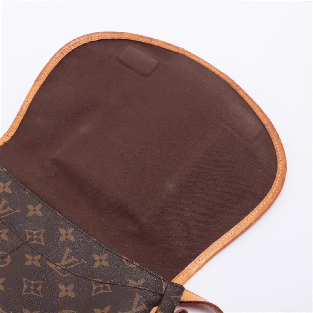 Brown and tan monogram coated canvas Louis Vuitton Menilmontant PM Shoulder Bag with leather trim shoulder bag with gold-tone hardware featuring two flat pockets under the flap, one large zip pocket and flat leather handles with hidden magnetic snap closu