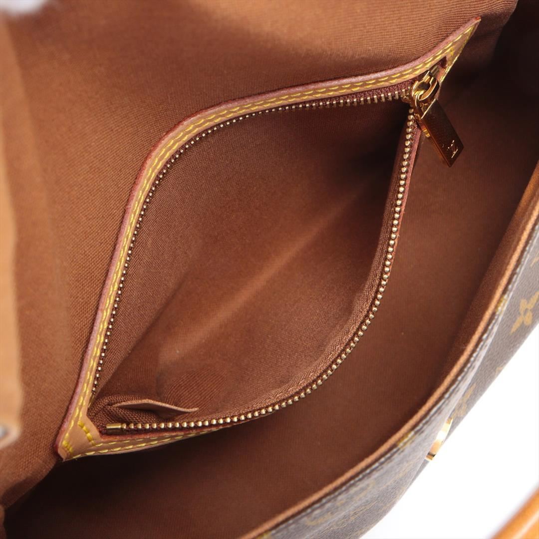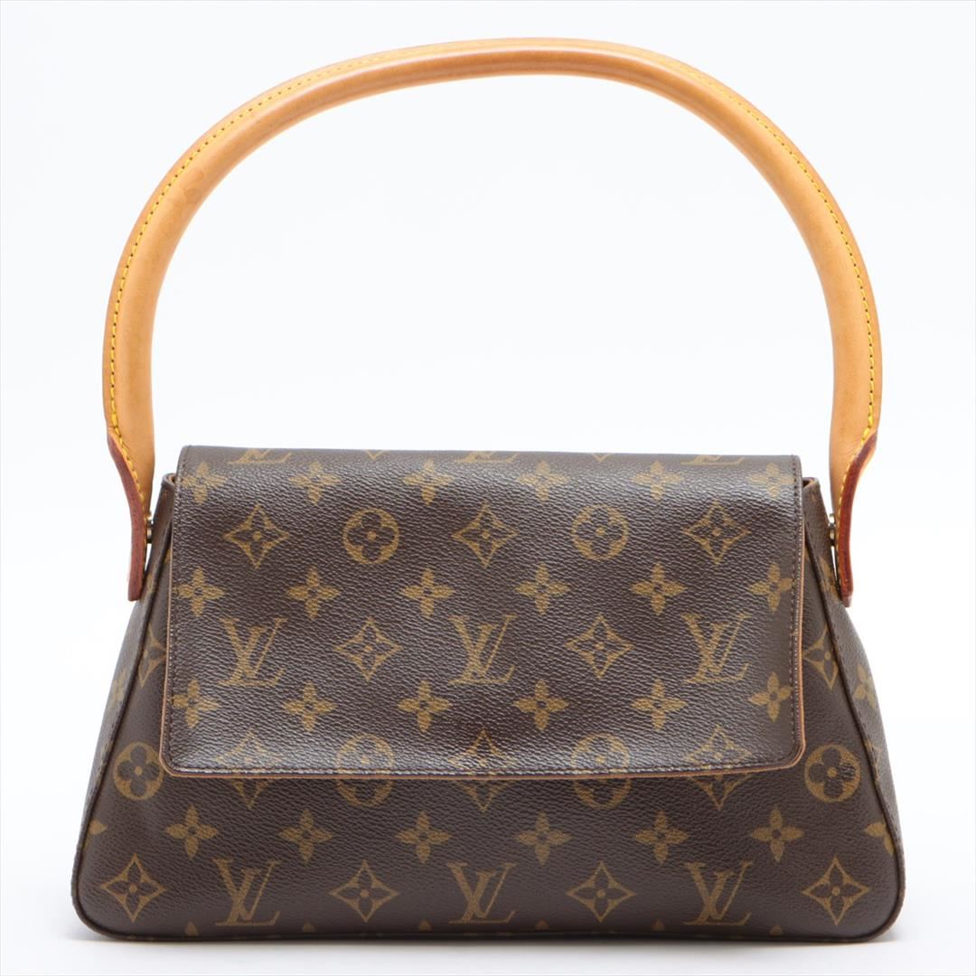 Brown and tan monogram coated canvas Louis Vuitton Mini Looping bag with gold-tone hardware, tan vachetta leather trim, single rolled handle, brown woven lining, single zip pocket at interior wall and snap closure at front flap. 12"x2"x7" Handle Drop:6