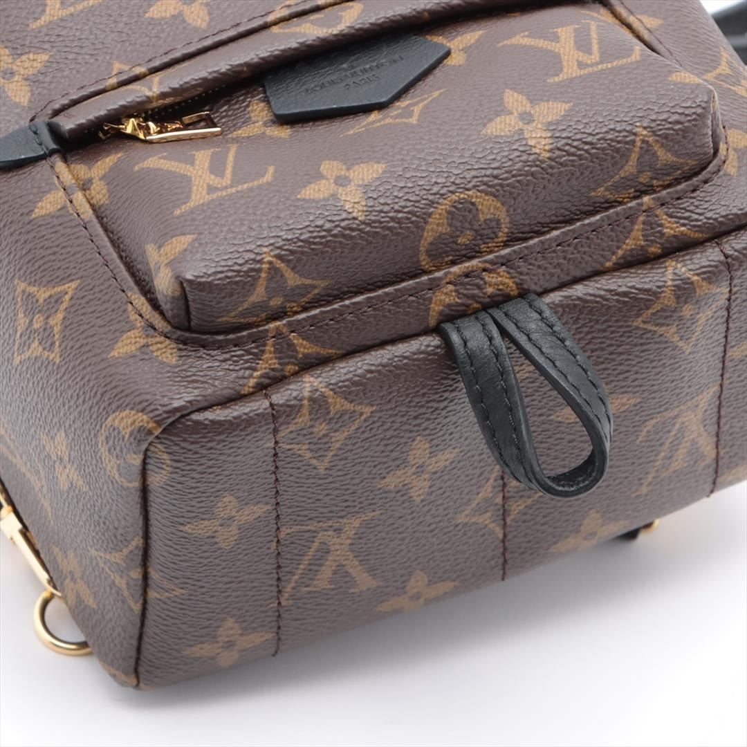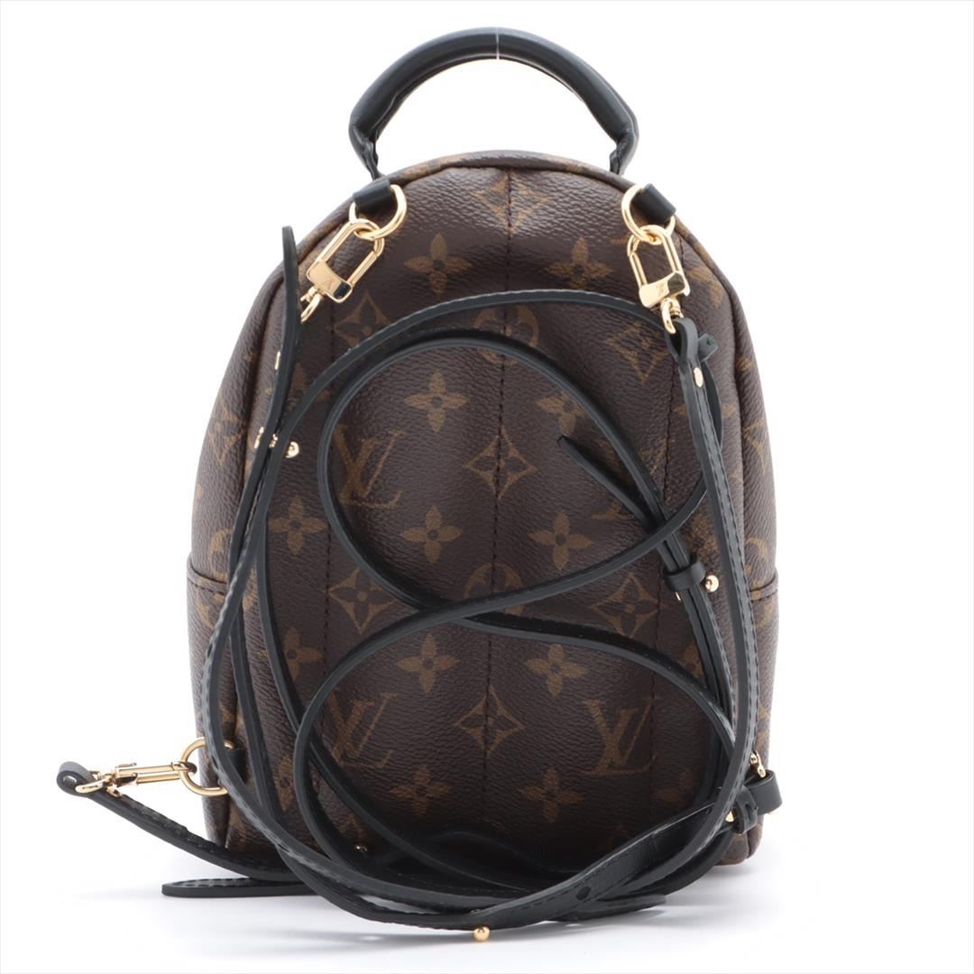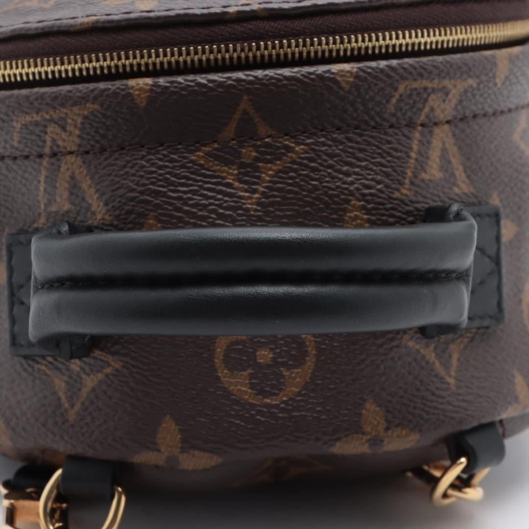 Brown and tan monogram coated canvas Louis Vuitton Mini Palm Springs backpack with gold-tone hardware, single flat top handle, dual adjustable shoulder straps, single zip pocket at front, black nylon lining, single slit pocket at interior wall and zip clo