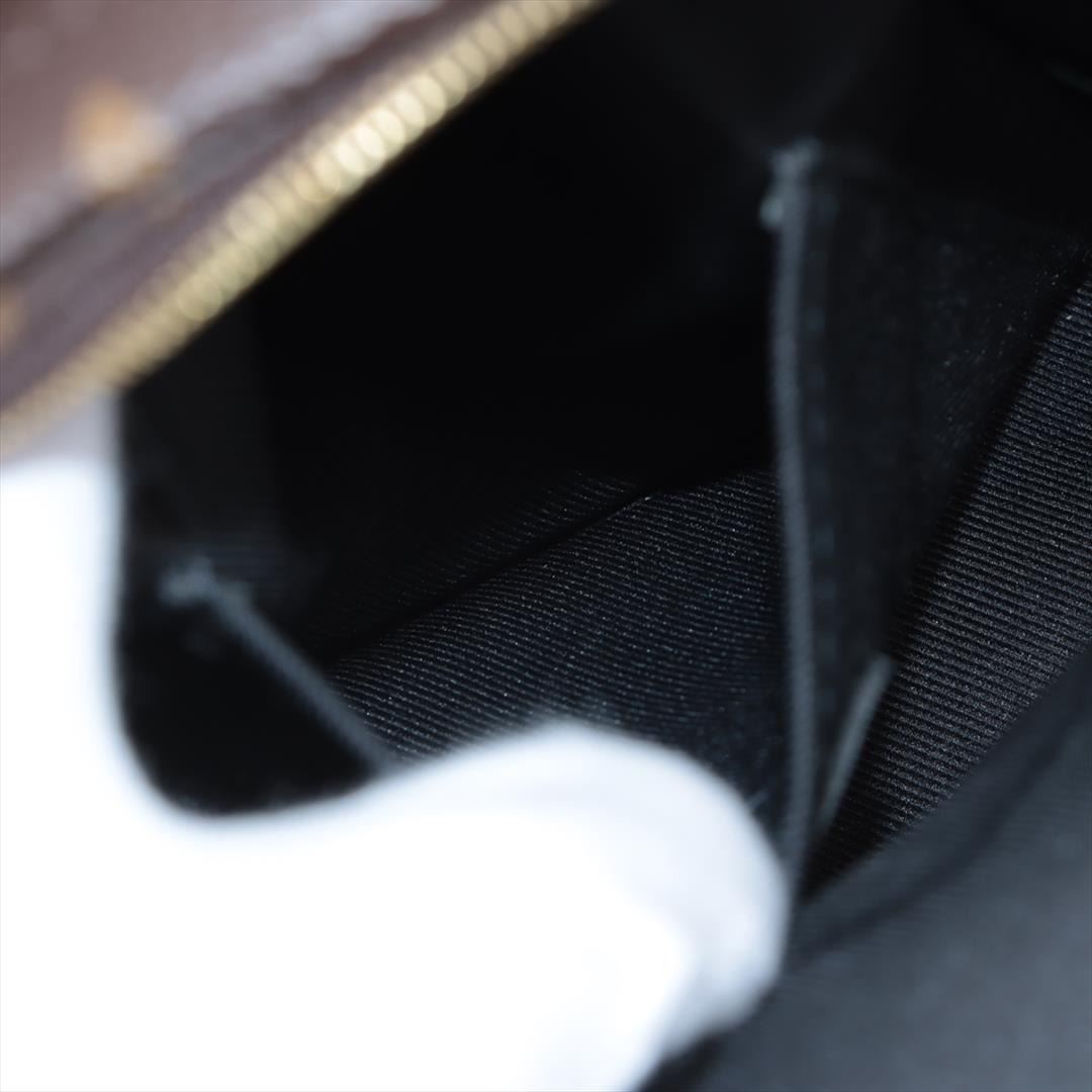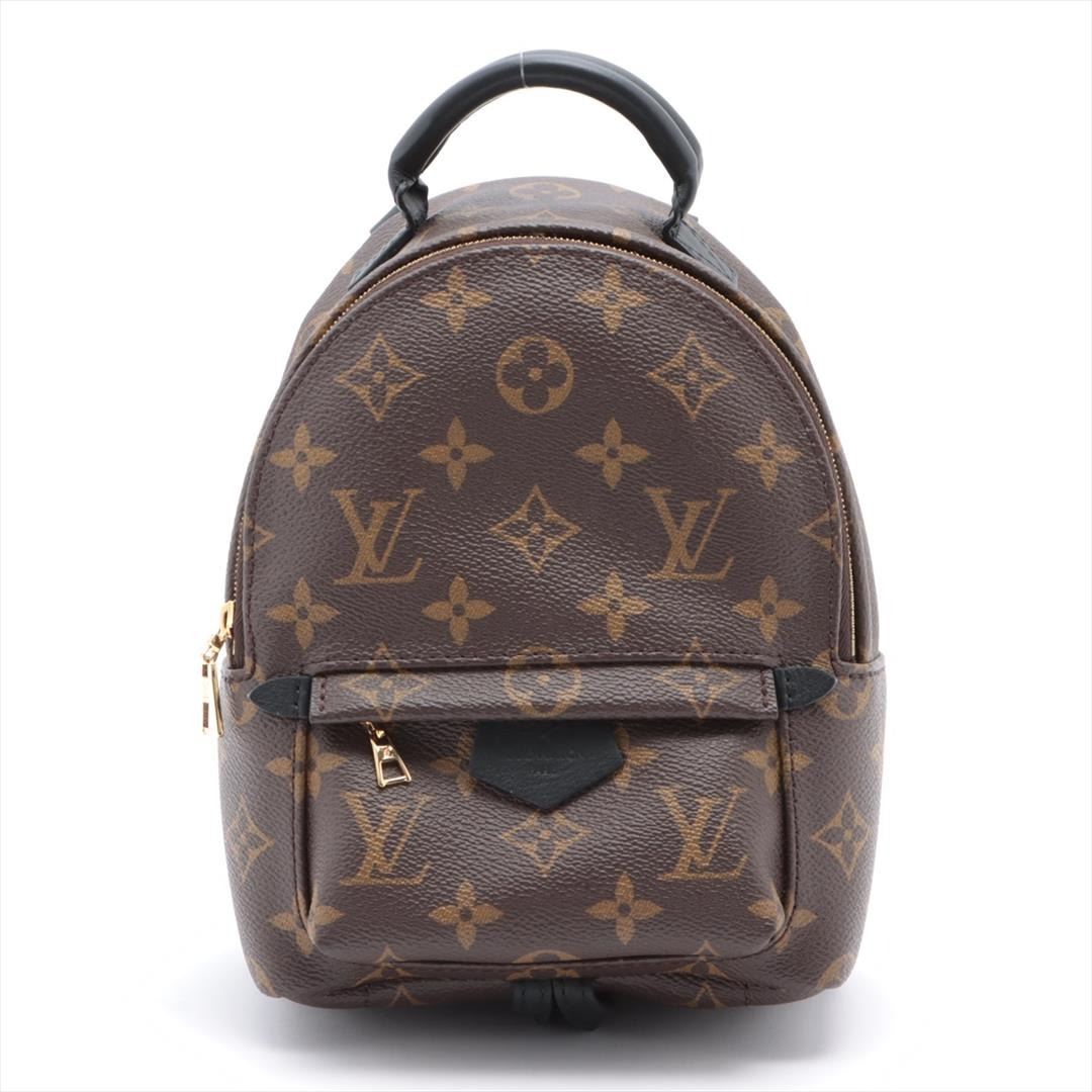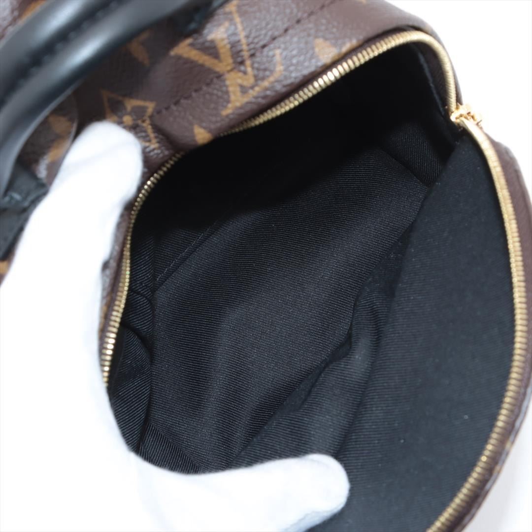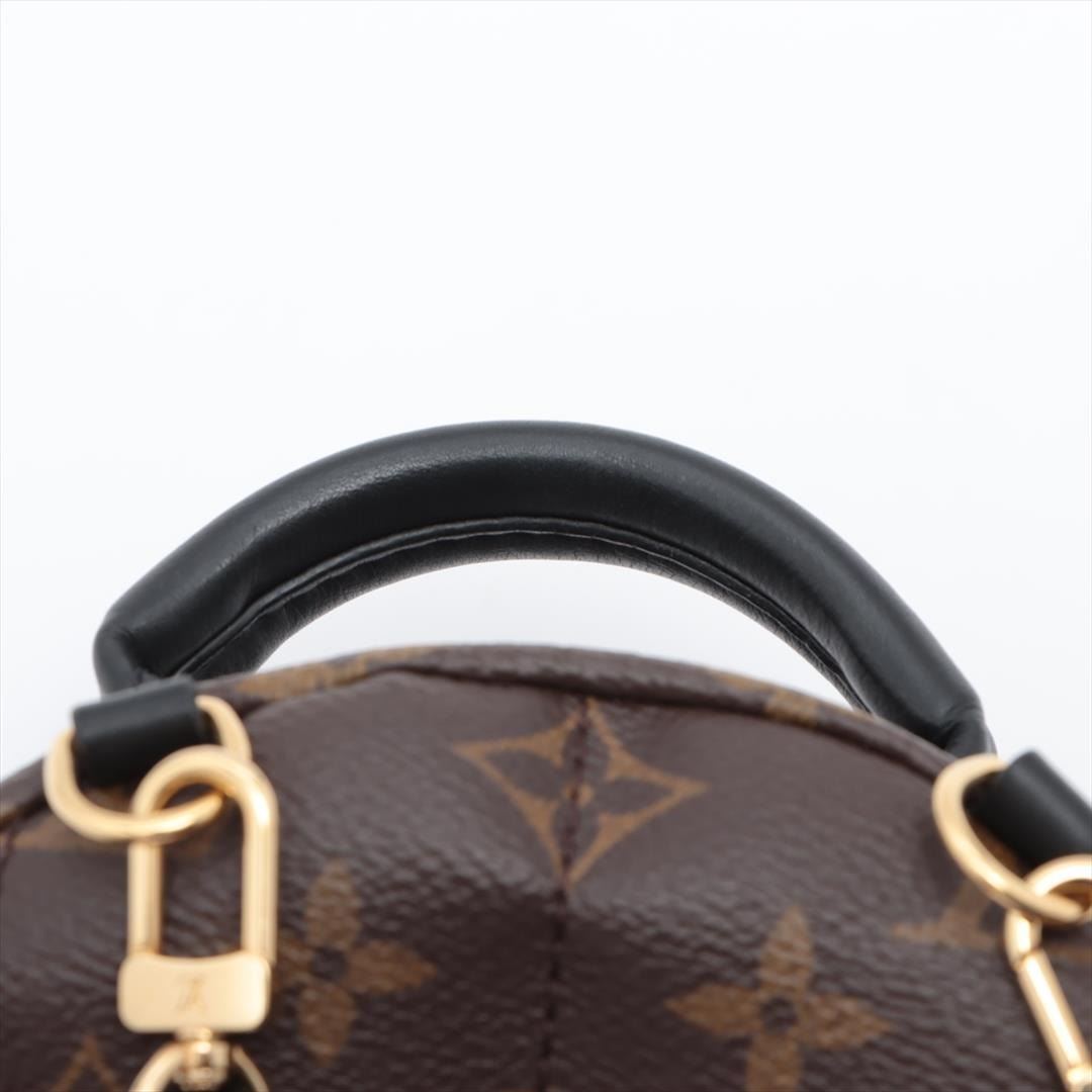 Brown and tan monogram coated canvas Louis Vuitton Mini Palm Springs backpack with gold-tone hardware, single flat top handle, dual adjustable shoulder straps, single zip pocket at front, black nylon lining, single slit pocket at interior wall and zip clo