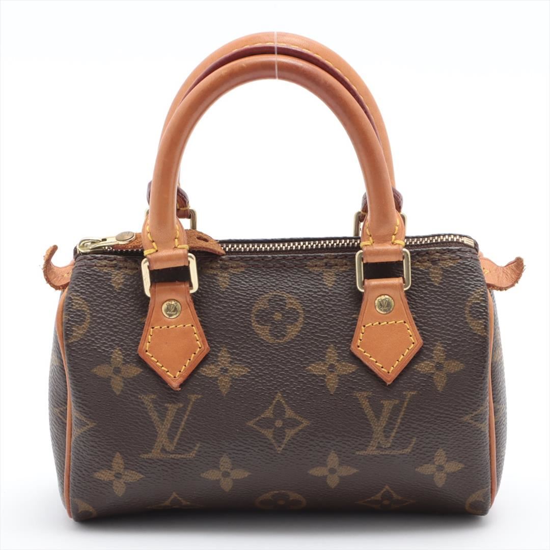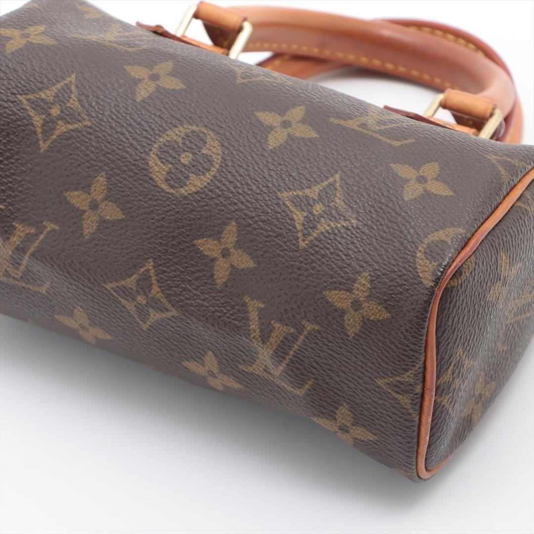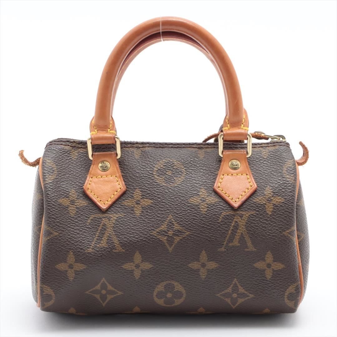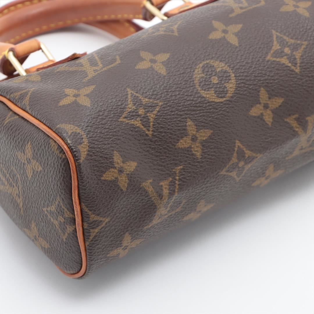 Brown and tan monogram coated canvas Louis Vuitton Mini Speedy with gold-tone hardware, tan vachetta leather trim, dual rolled top handles, brown canvas lining and zip closure at top. 6"x3"x4"xHandle Drop:3"/15.2cmx7.6cmx10.1cmxBag Drop:7.6cm