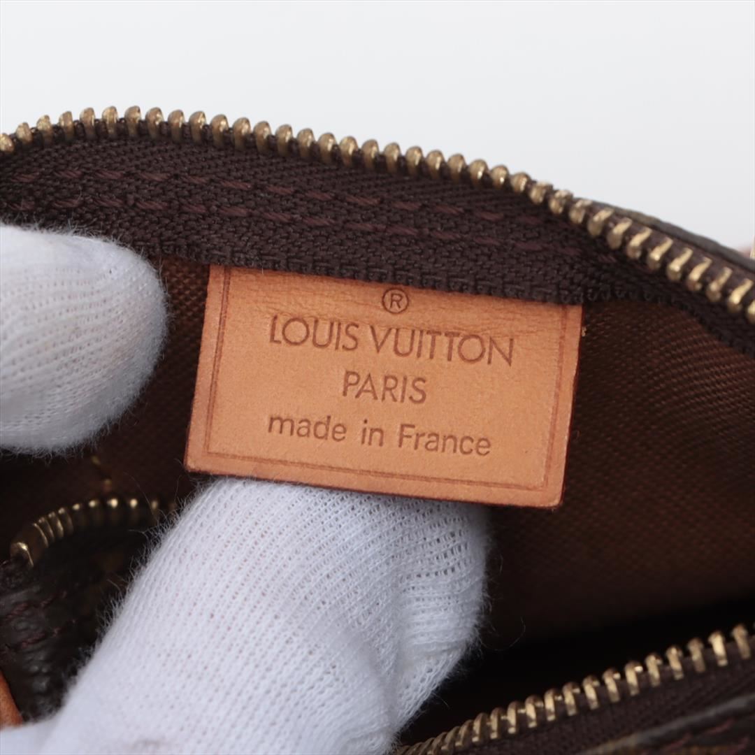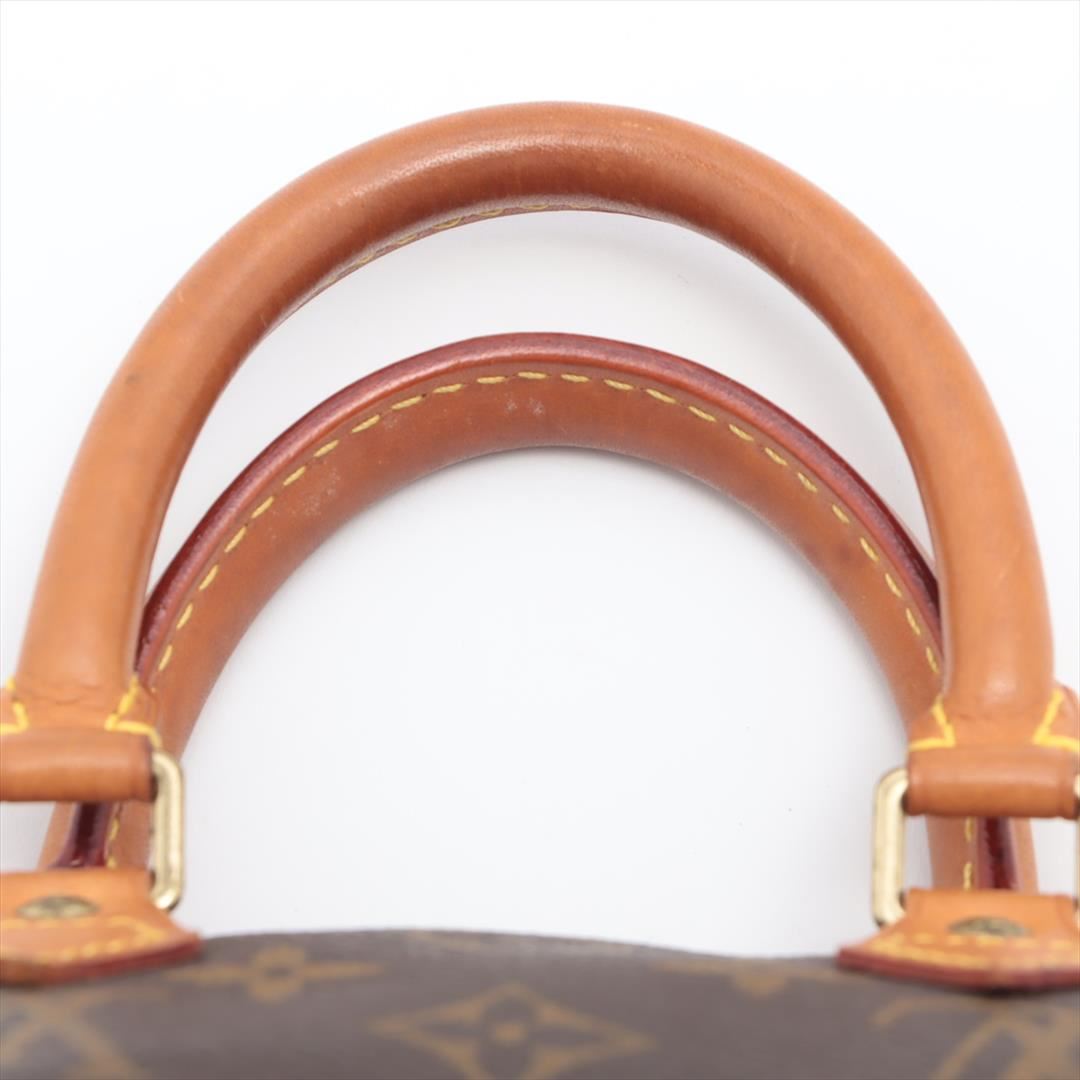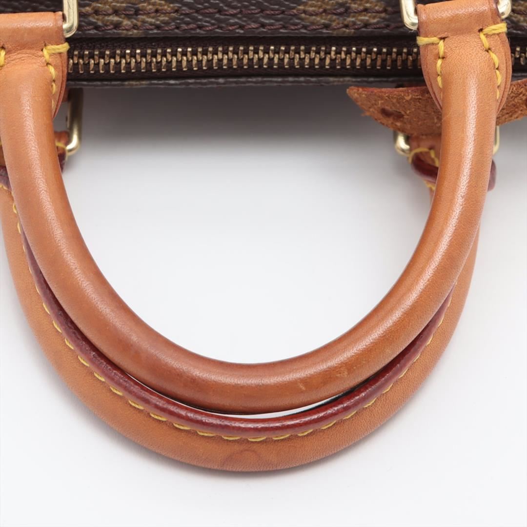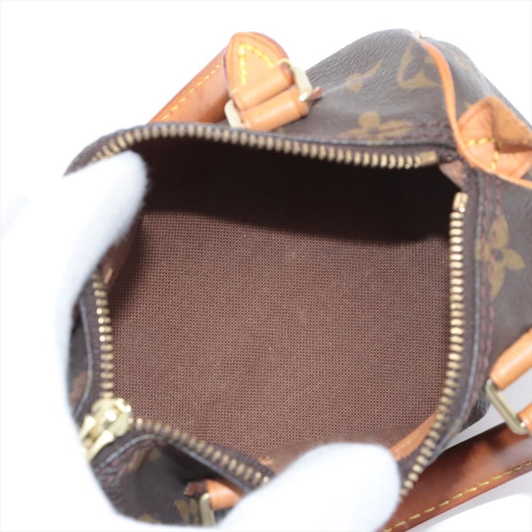 Brown and tan monogram coated canvas Louis Vuitton Mini Speedy with gold-tone hardware, tan vachetta leather trim, dual rolled top handles, brown canvas lining and zip closure at top. 6"x3"x4"xHandle Drop:3"/15.2cmx7.6cmx10.1cmxBag Drop:7.6cm