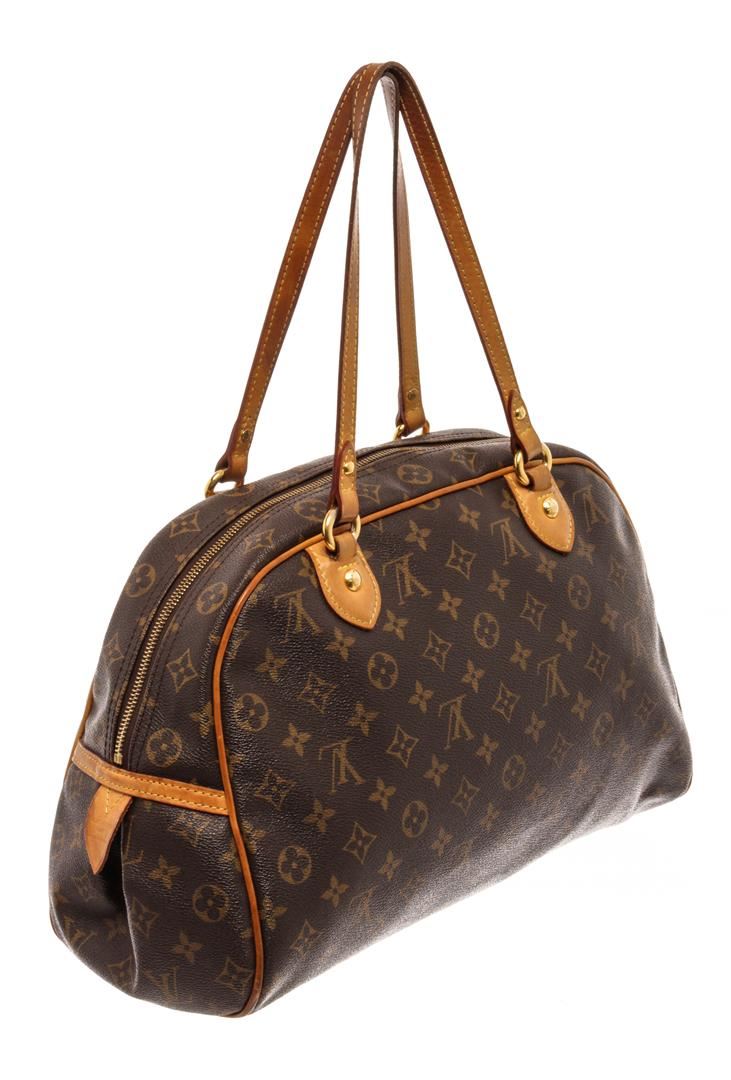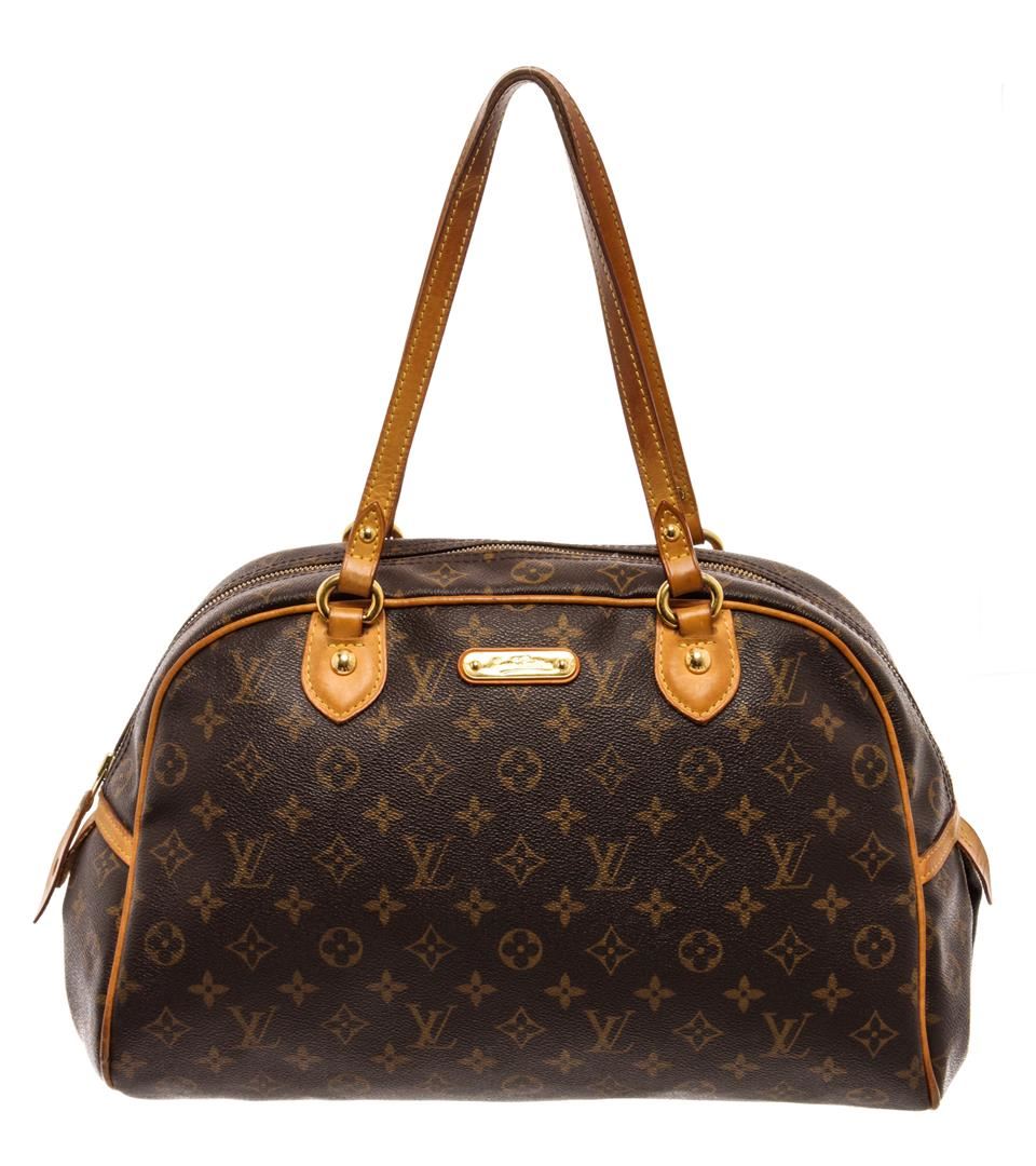 Louis Vuitton Brown Monogram Canvas Leather Montorgueil GM Shoulder Bag. All available information is listed in the description and shown in the photos. Louis Vuitton Brown Monogram Canvas Leather Montorgueil GM Shoulder Bag with brass hardware, leather trim, dual shoulder straps, canvas lining & single interior pocket, zipper closure at top. Height: 9.75" Width: 14.75" Depth: 5.75", Shoulder Strap Drop: 8.25" / 24.76 x 37.46 x 14.60 Cm