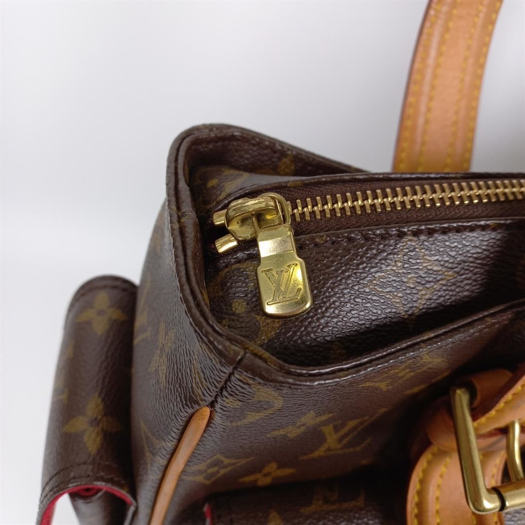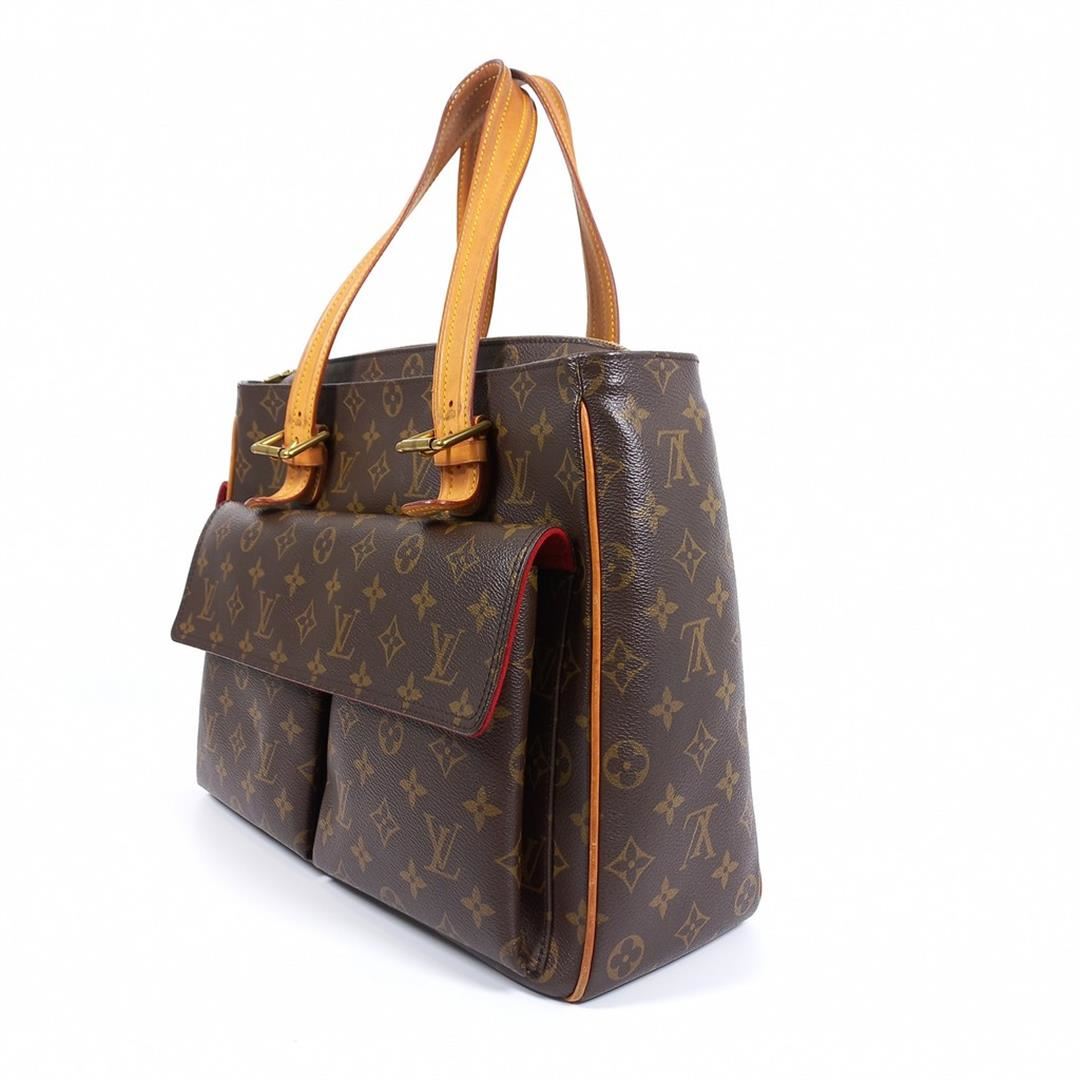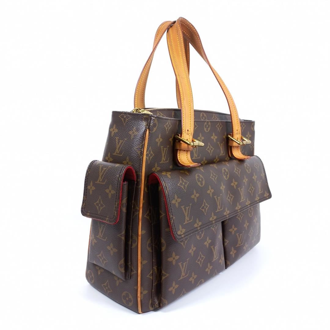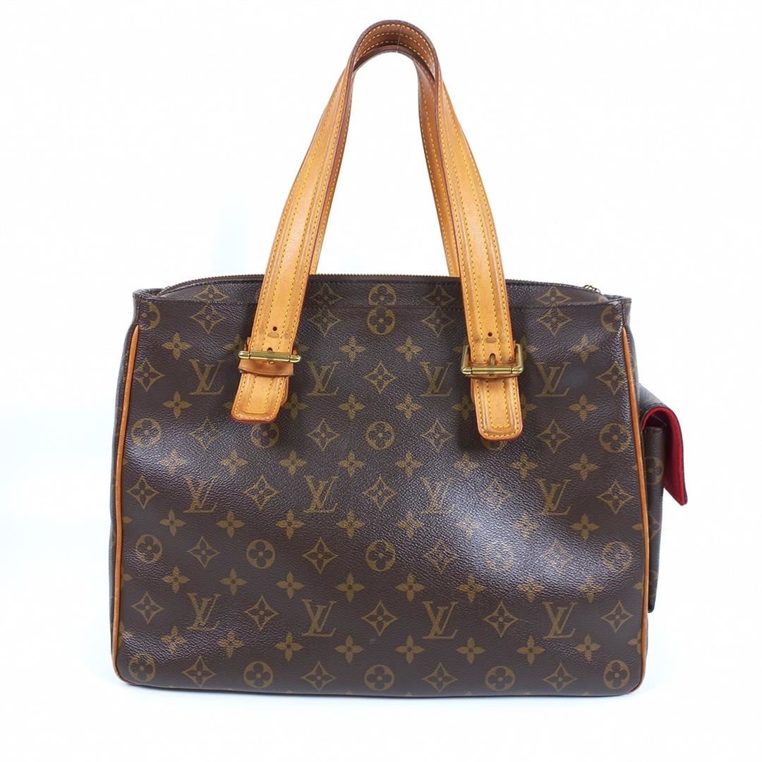 Brown and tan Monogram coated canvas Louis Vuitton Multipli Cite tote bag with gold-tone hardware, tan leather trim, dual flat shoulder straps, three exterior pockets, red Alcantara lining & dual interior pockets and zip closure at top. Height: 11.5" W