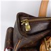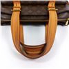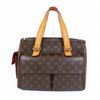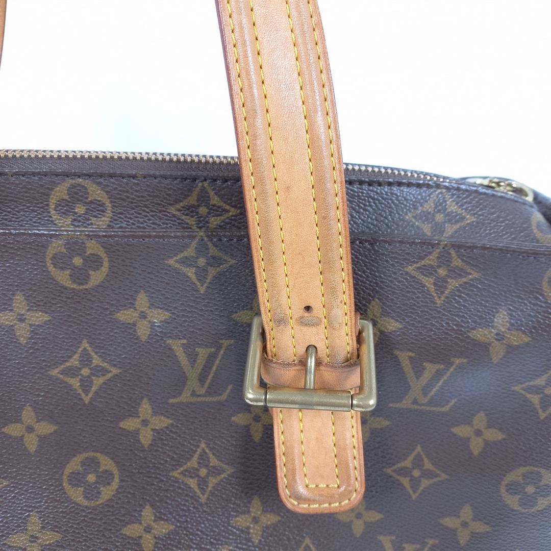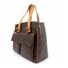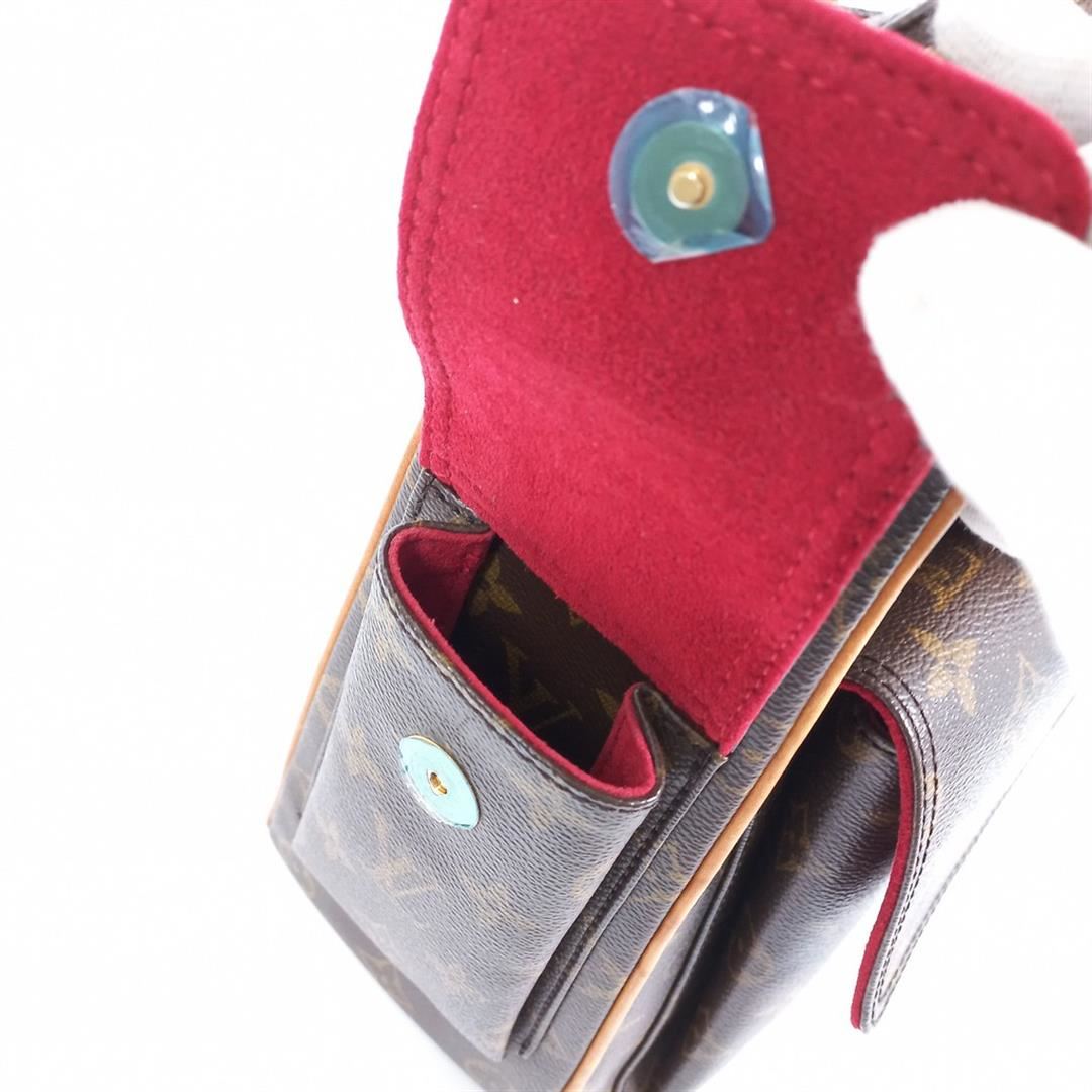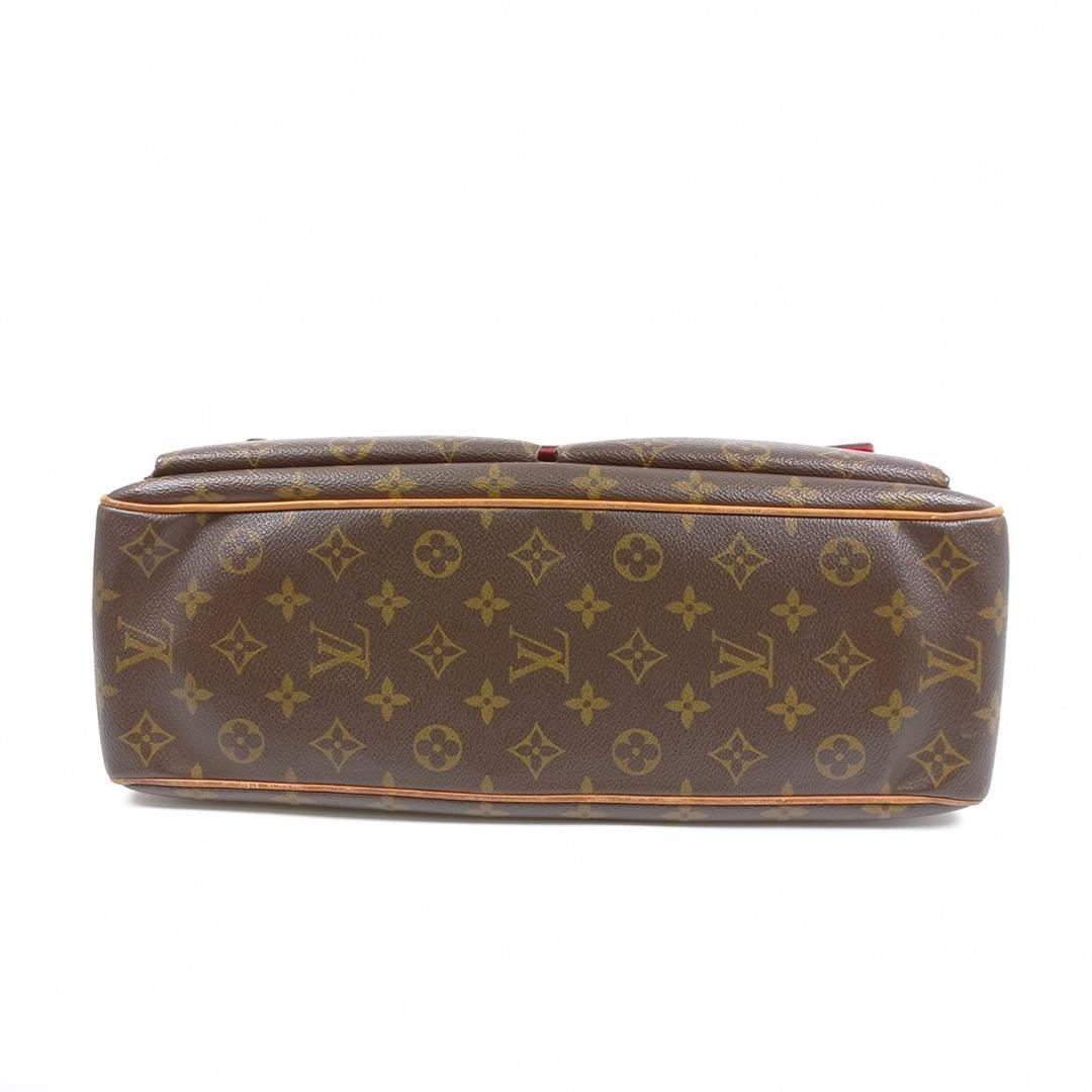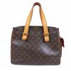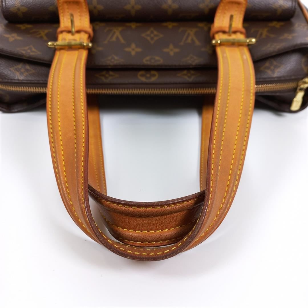 Brown and tan Monogram coated canvas Louis Vuitton Multipli Cite tote bag with gold-tone hardware, tan leather trim, dual flat shoulder straps, three exterior pockets, red Alcantara lining & dual interior pockets and zip closure at top. Height: 11.5" W