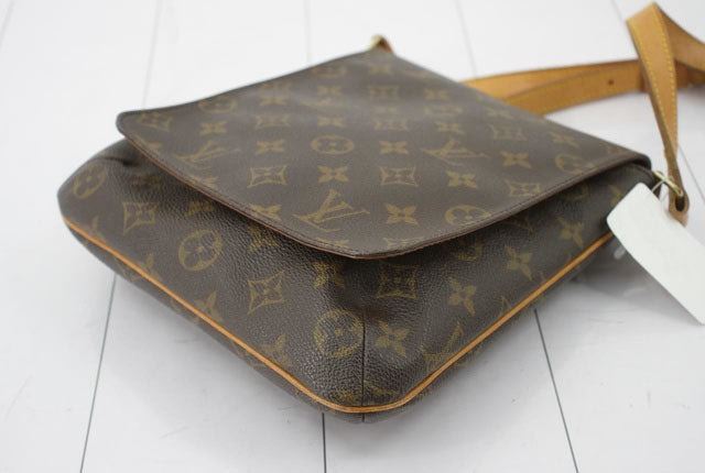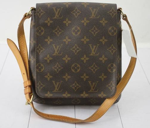 Brown and tan monogram coated canvas Louis Vuitton Musette Salsa short shoulder strap bag with gold-tone hardware, tan vachetta leather accents, single flat shoulder strap, cinnamon Alcantara lining, single slit pocket at interior wall and snap closure at front flap. Height: 9" Width: 9" Depth: 1" Shoulder Strap Drop: 11.75"
