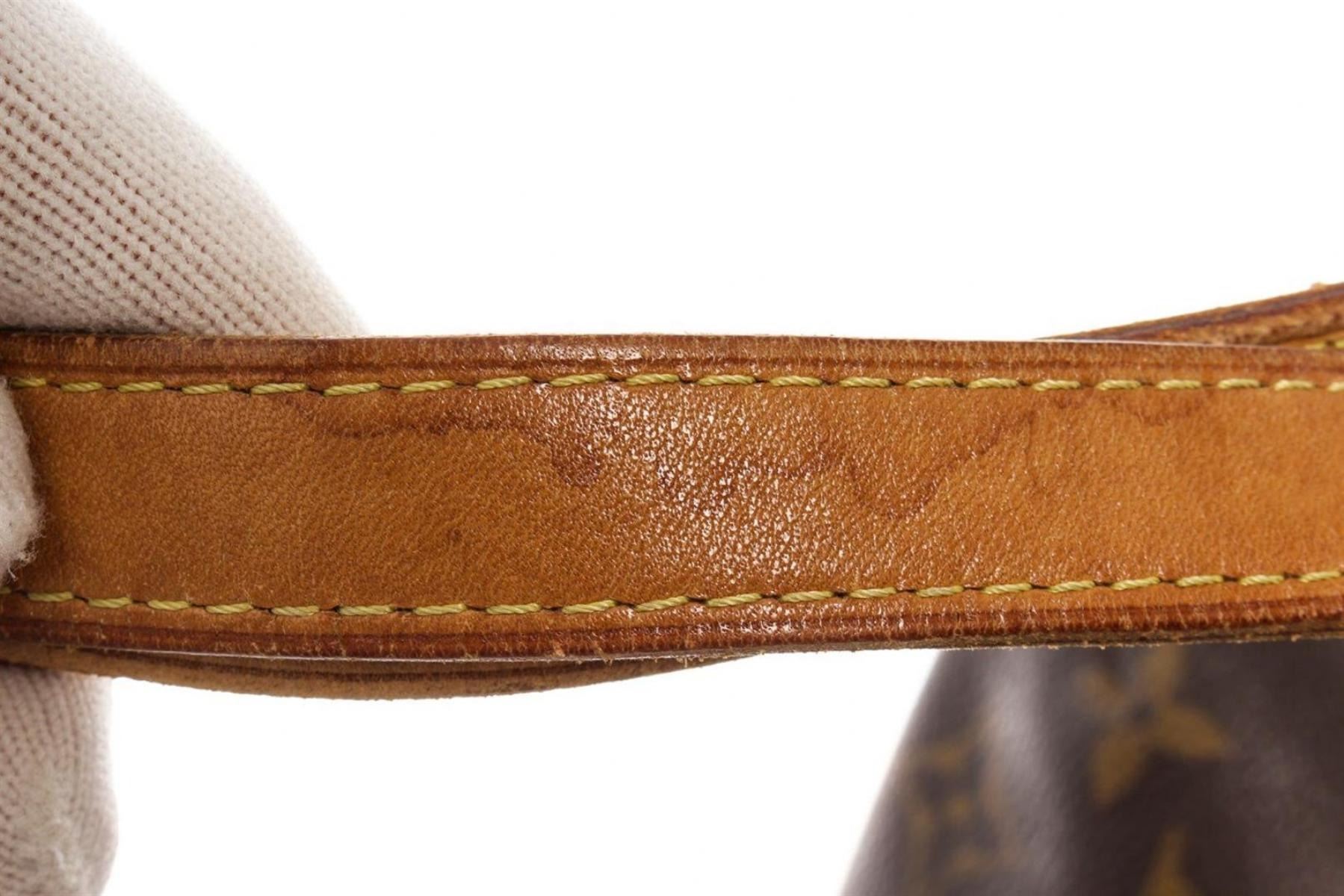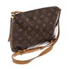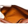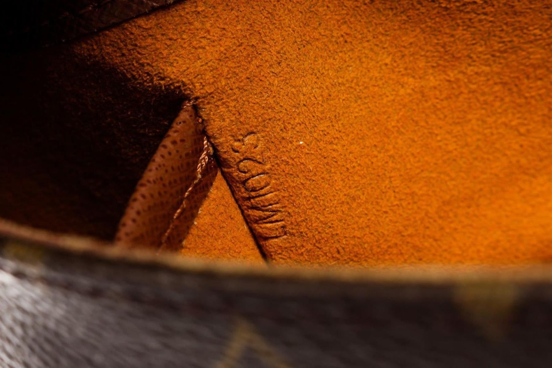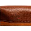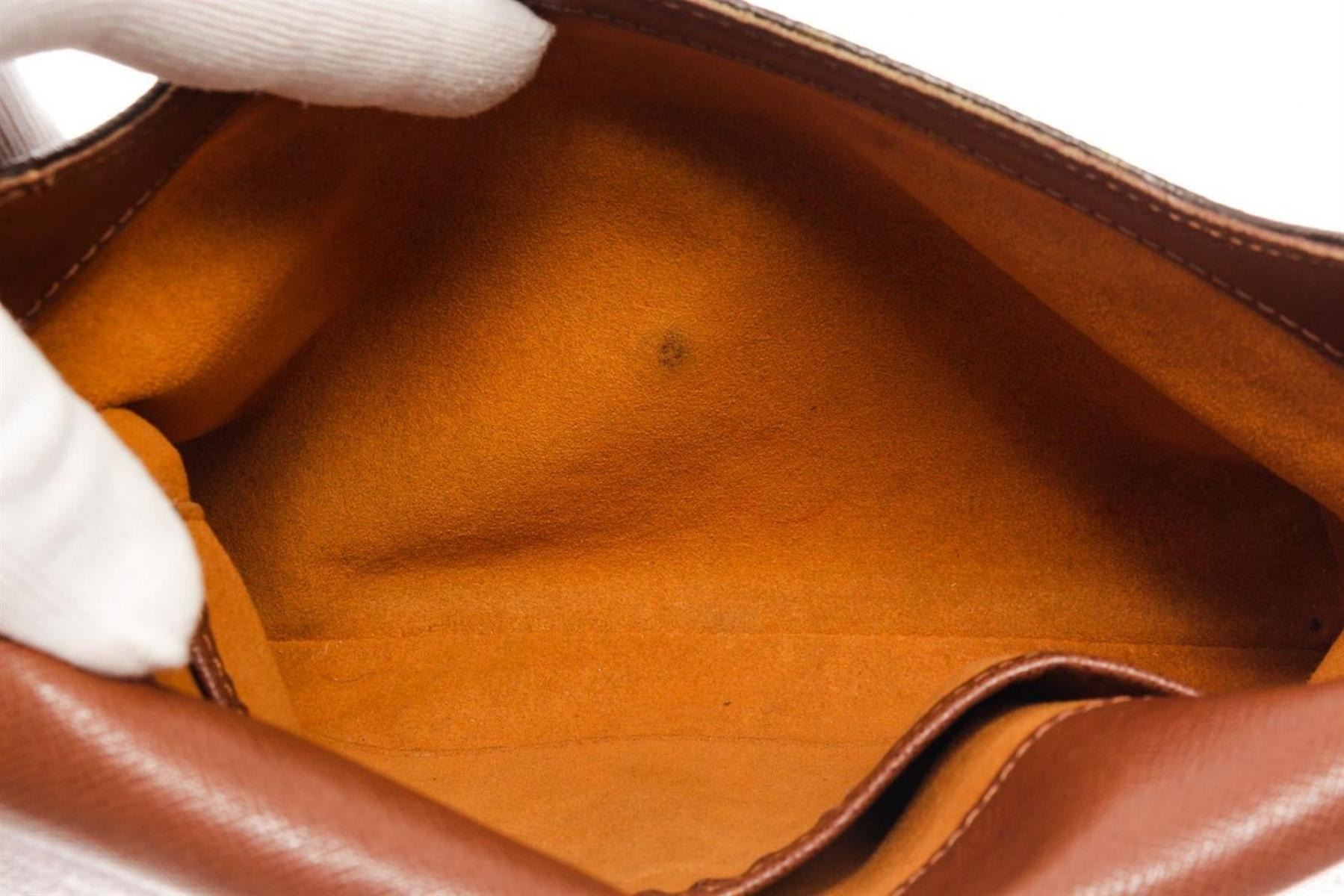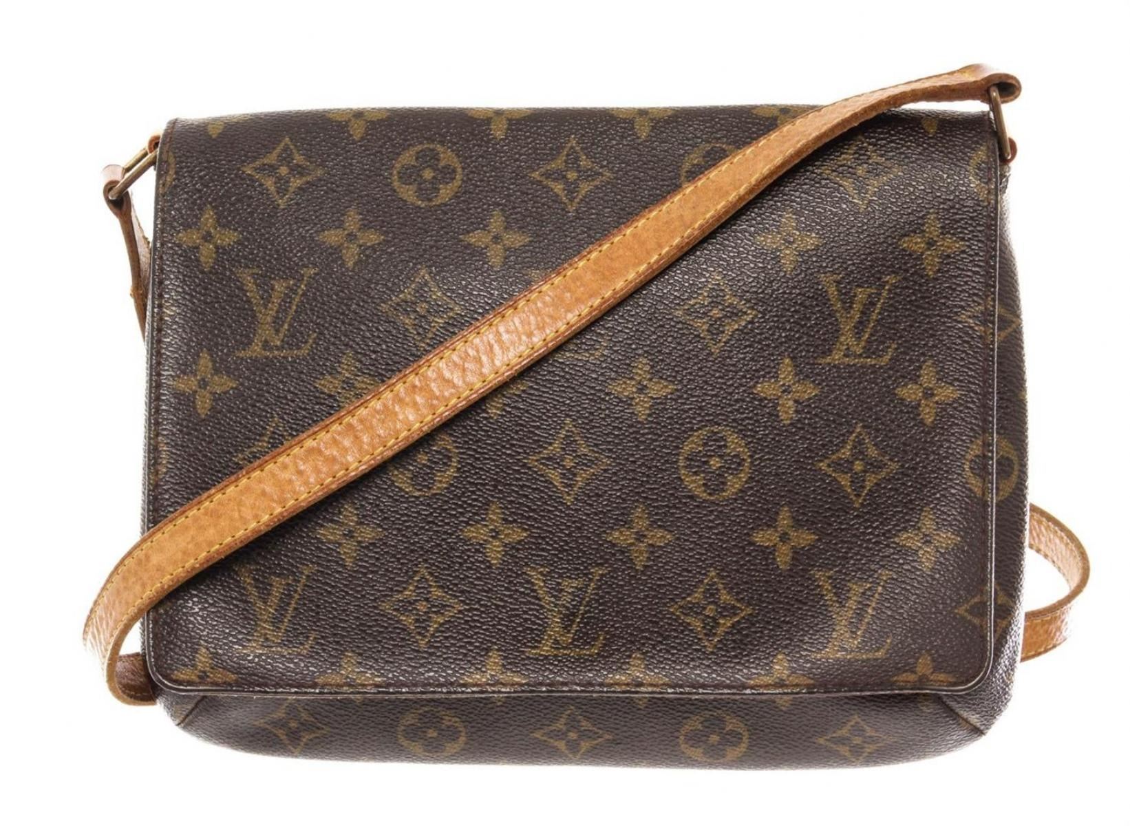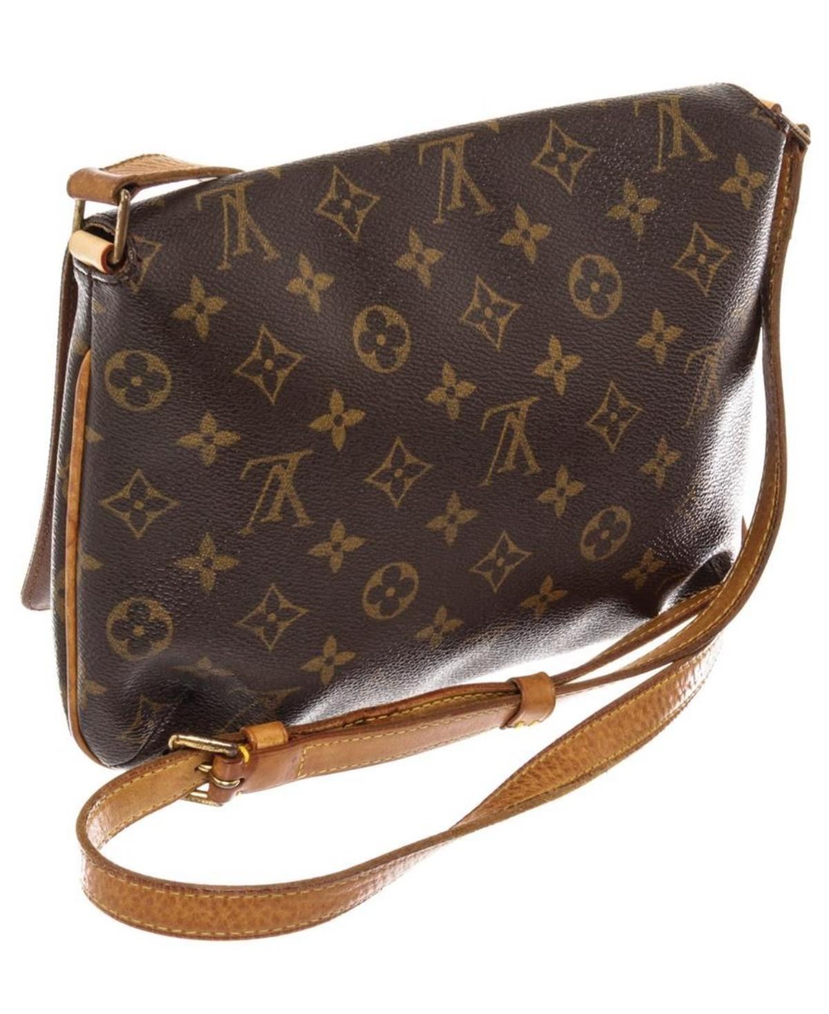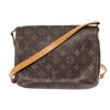 Brown and tan monogram coated canvas Louis Vuitton Musette Tango bag with gold-tone hardware, tan vachetta leather trim, single flat shoulder strap, marigold Alcantara lining, single pocket at interior wall and magnetic snap closure at front flap.