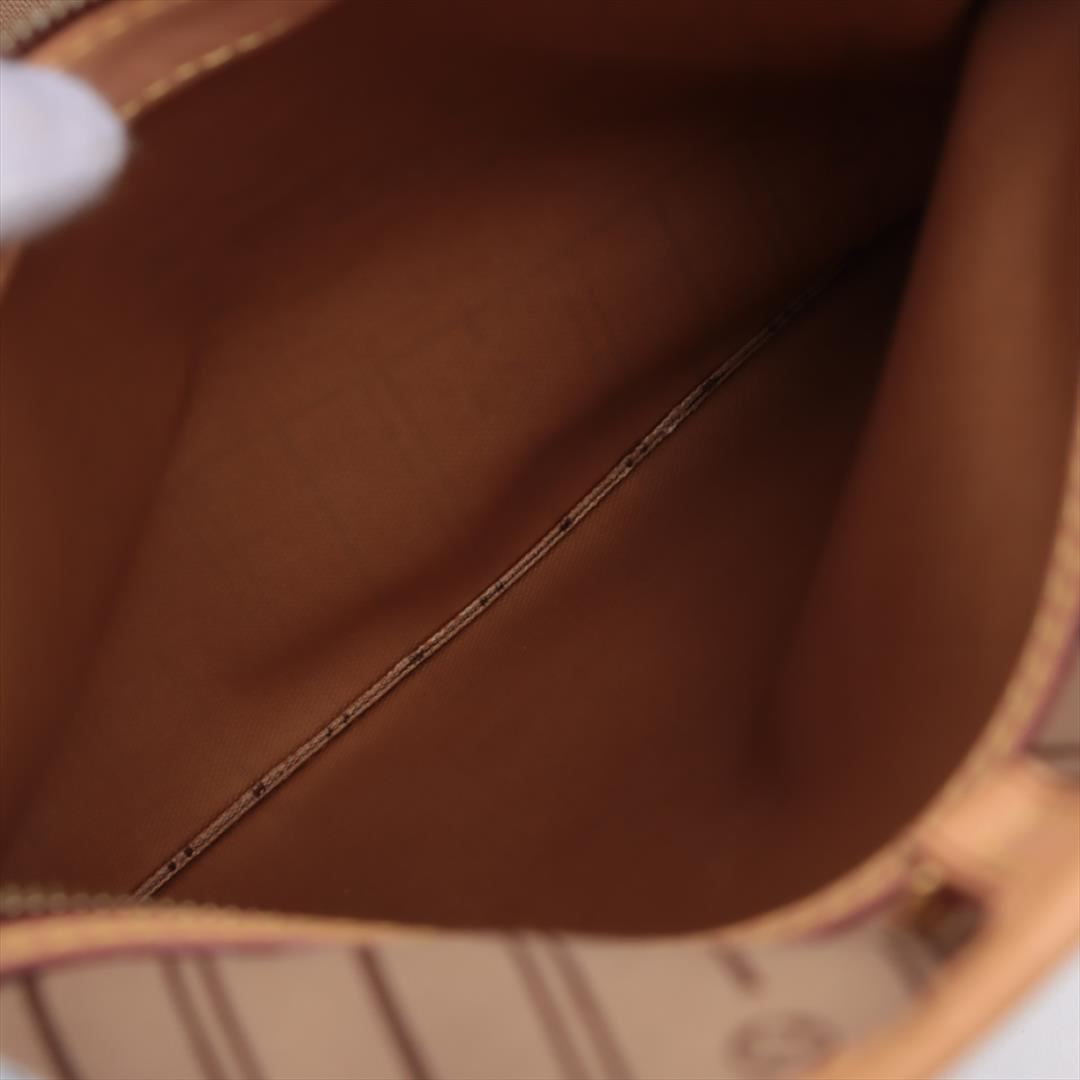 Brown and tan monogram coated canvas Louis Vuitton Neverfull MM with gold-tone hardware, tan vachetta leather trim, brown and tan printed canvas interior lining, single pocket at interior wall with zip closure, clasp closure at top and drawstring closures