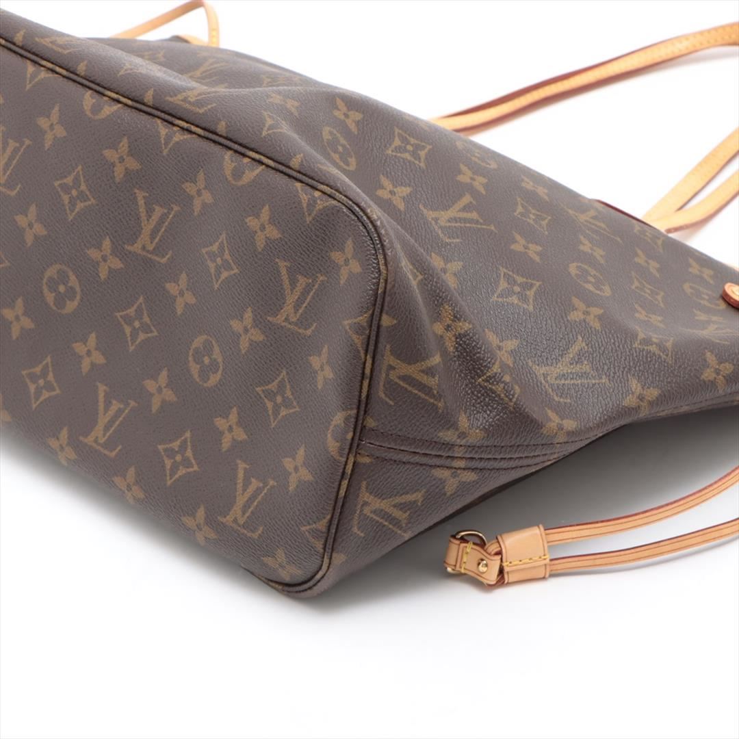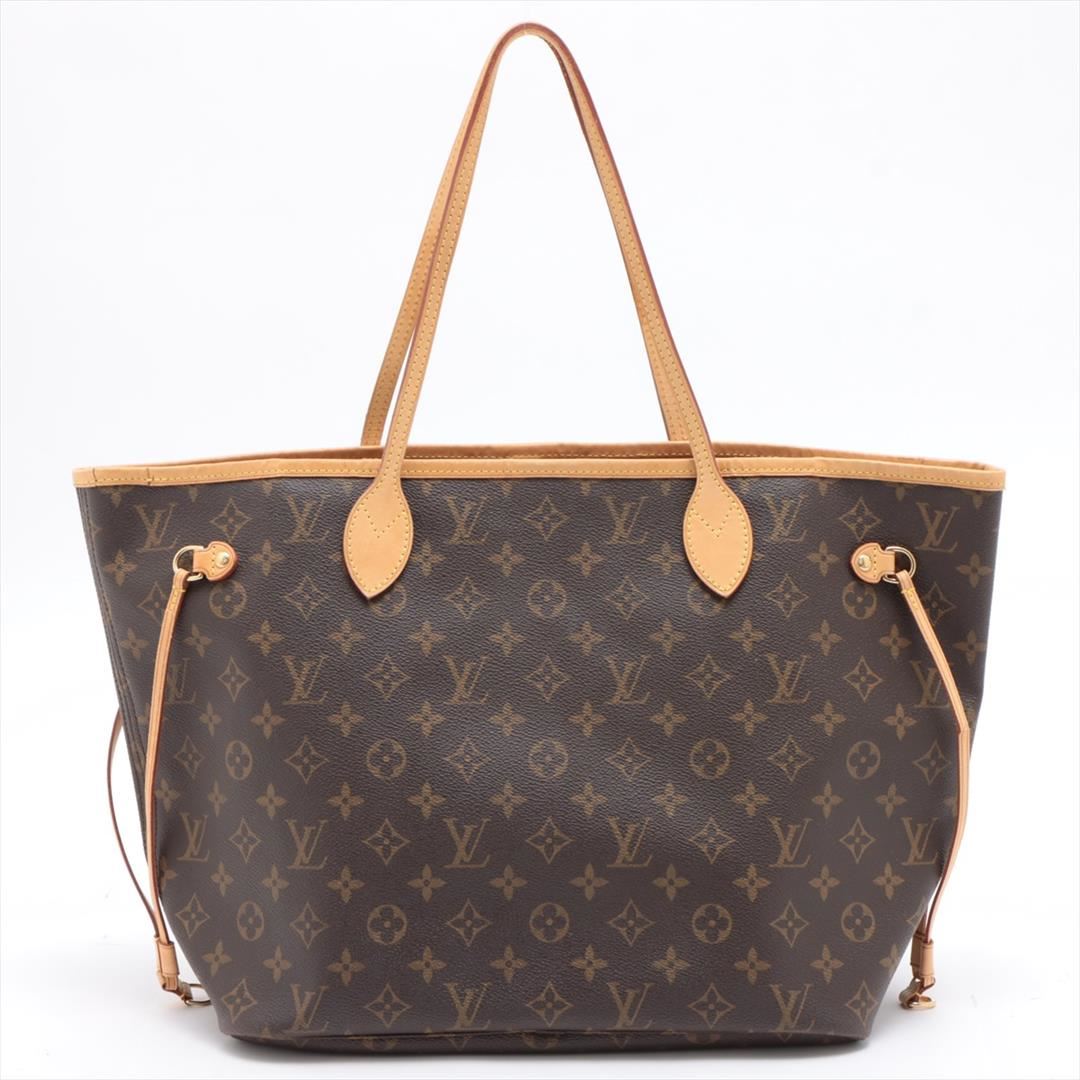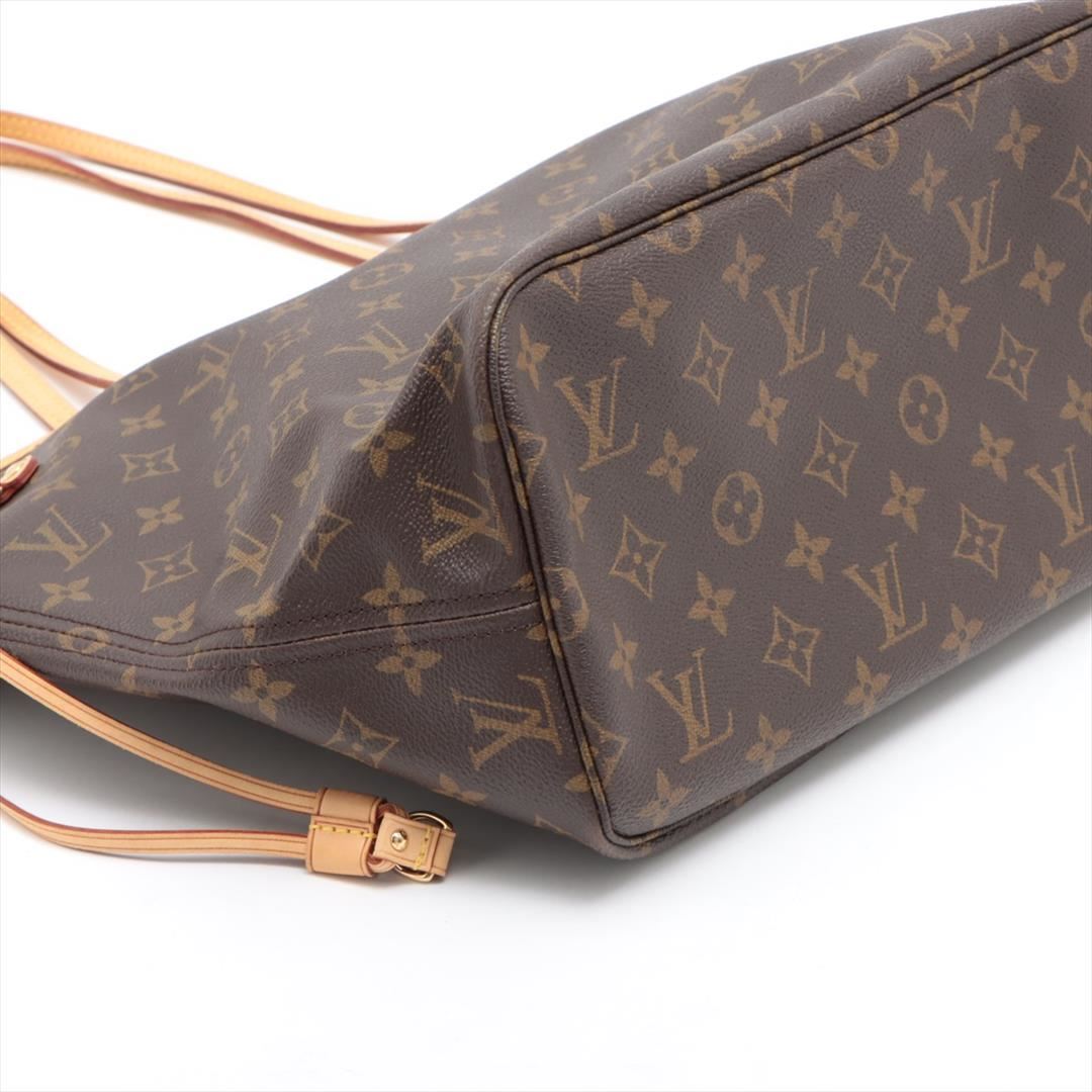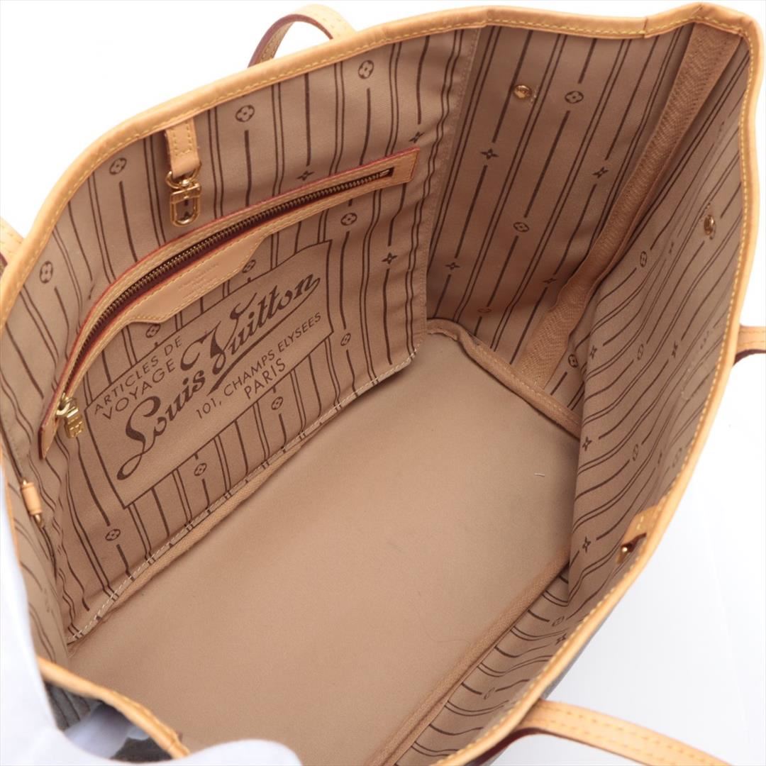 Brown and tan monogram coated canvas Louis Vuitton Neverfull MM with gold-tone hardware, tan vachetta leather trim, dual flat shoulder straps, dual drawstring adornments at sides, brown and tan striped canvas lining, single zip pocket at interior wall and
