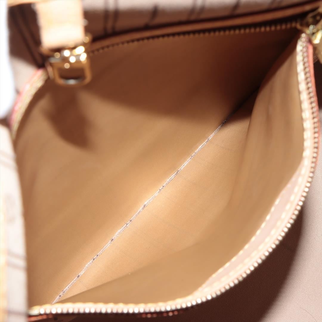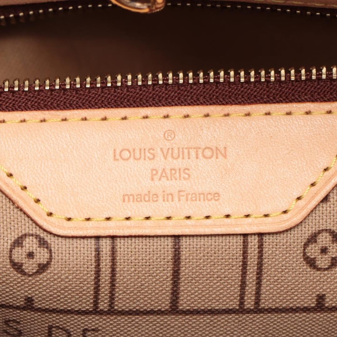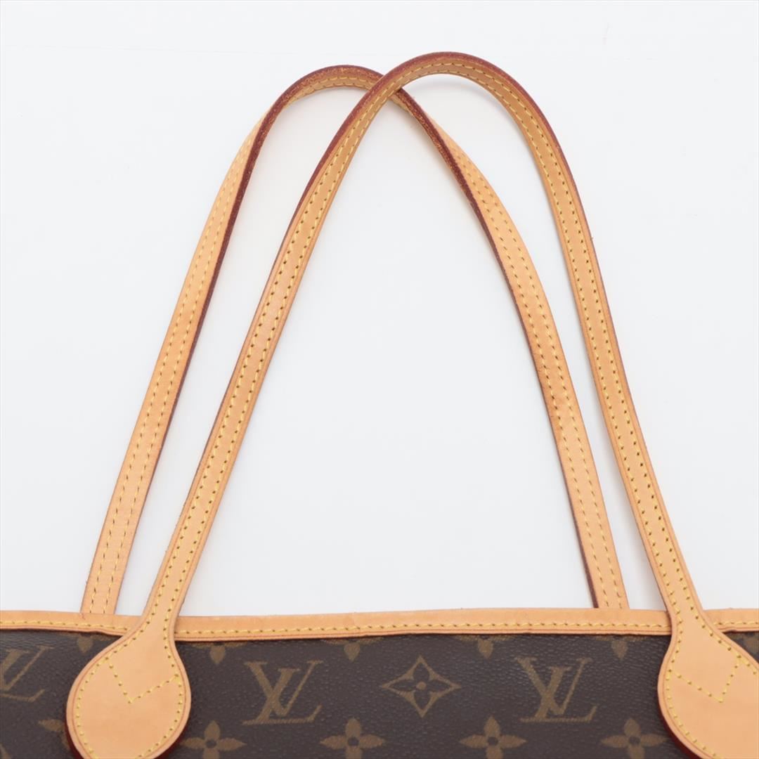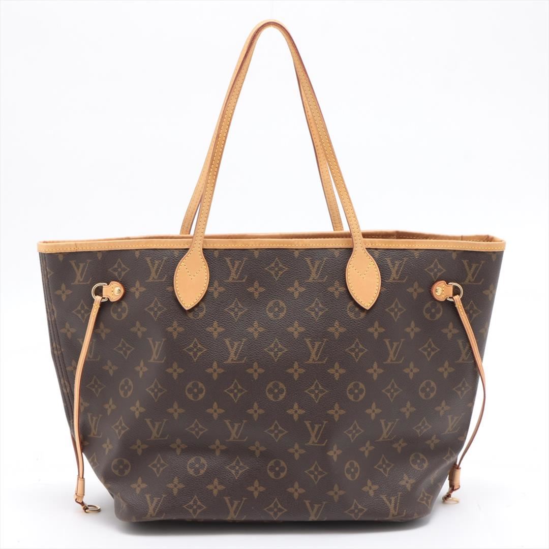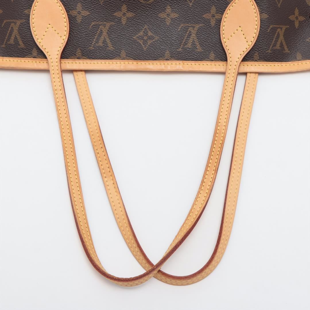 Brown and tan monogram coated canvas Louis Vuitton Neverfull MM with gold-tone hardware, tan vachetta leather trim, dual flat shoulder straps, dual drawstring adornments at sides, brown and tan striped canvas lining, single zip pocket at interior wall and