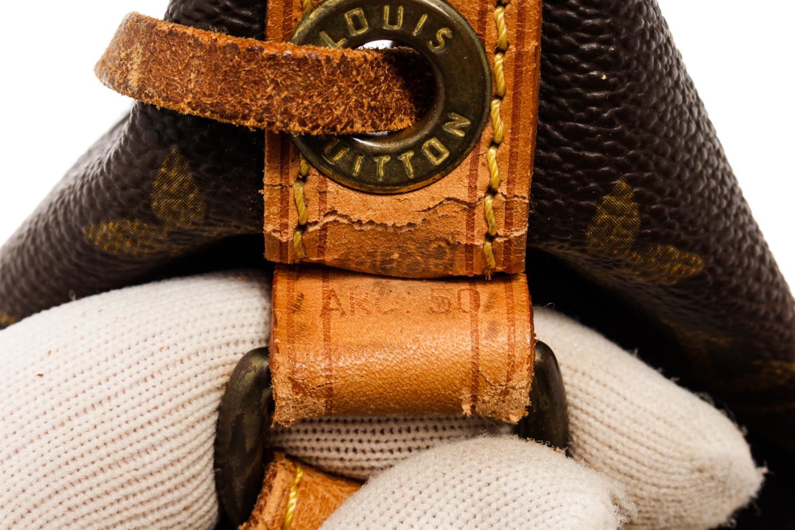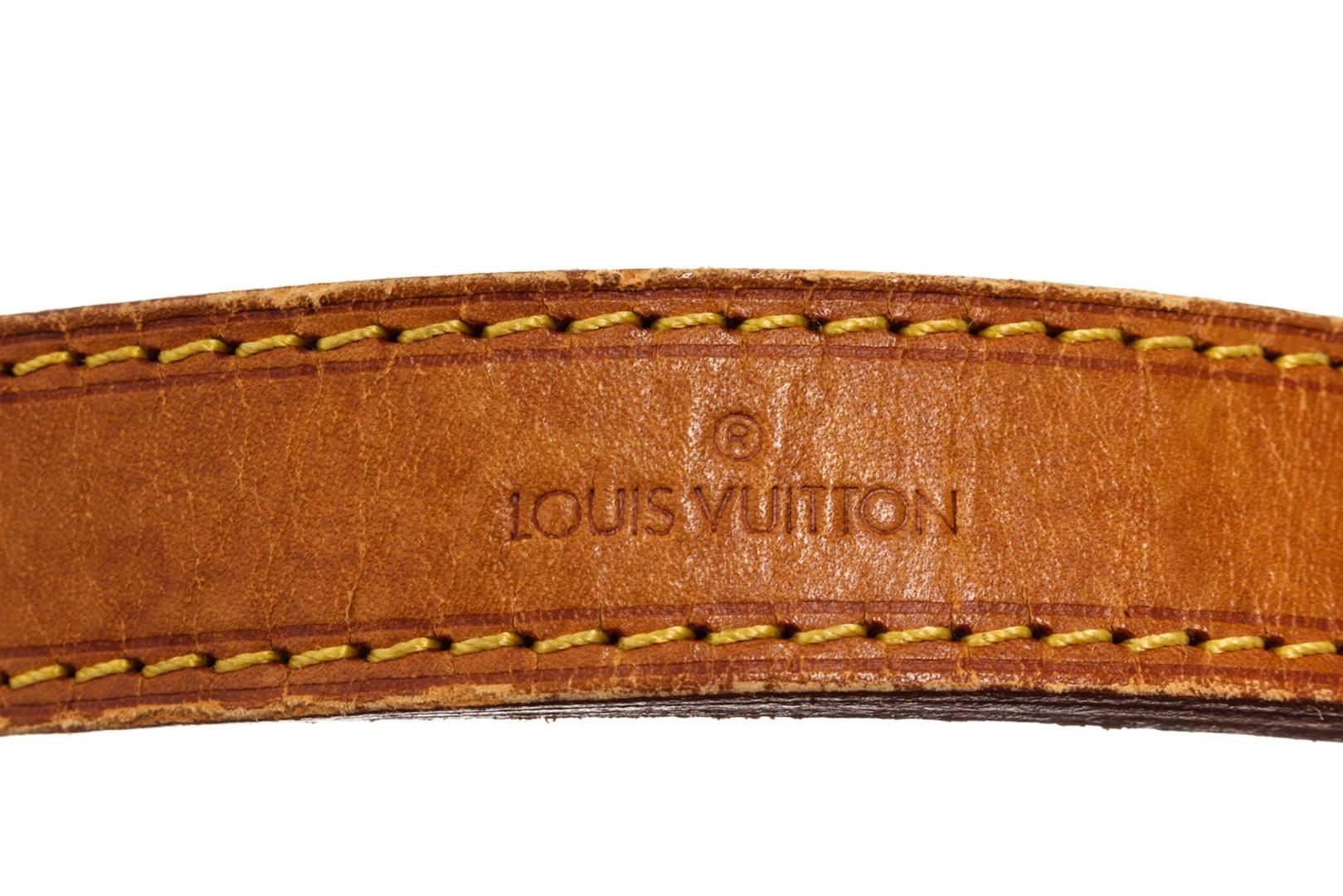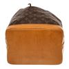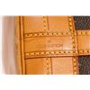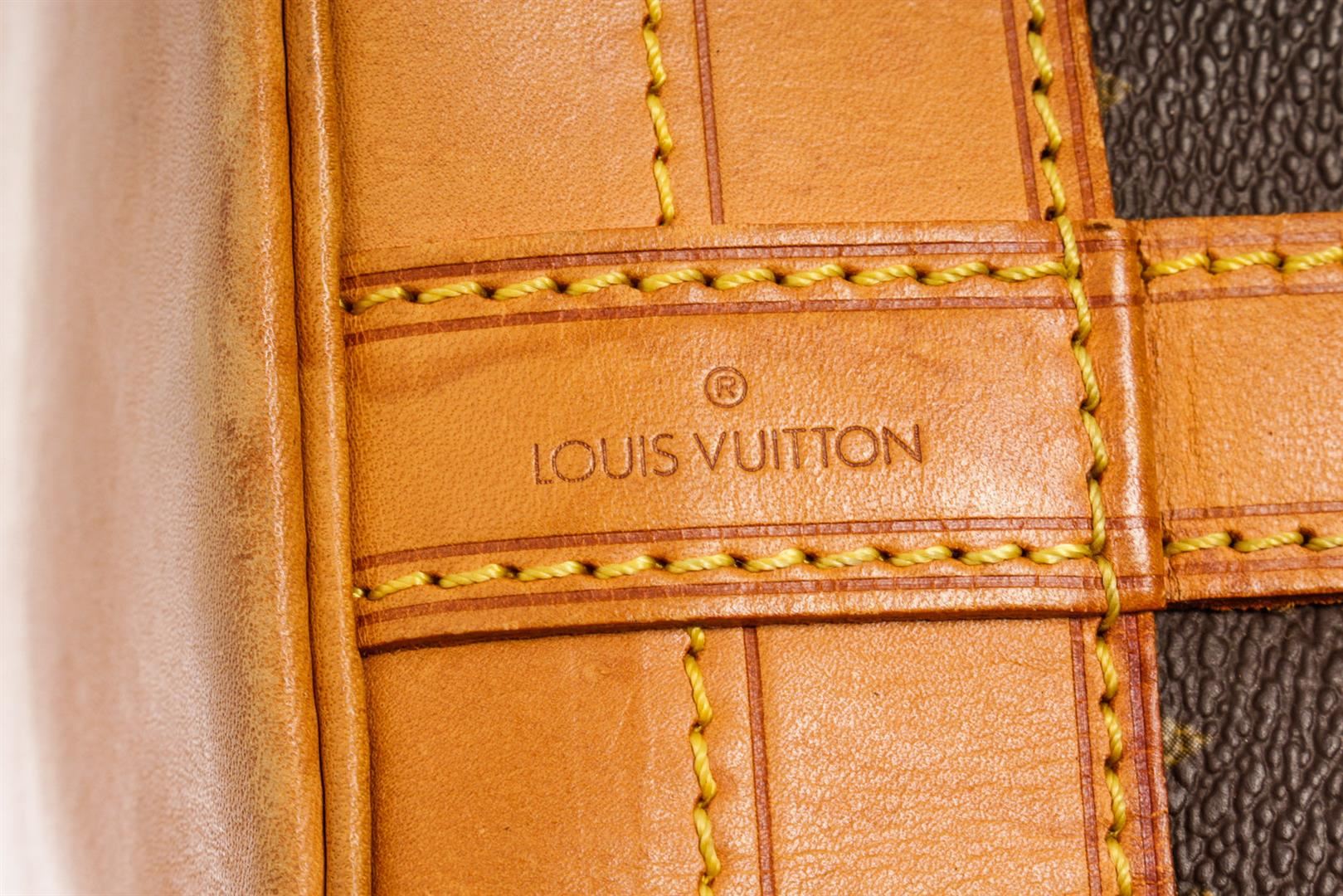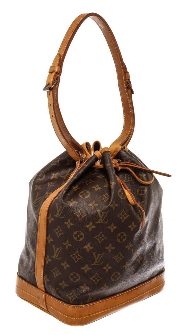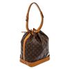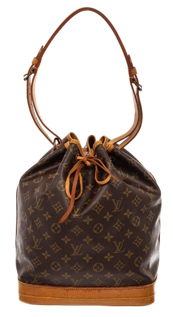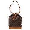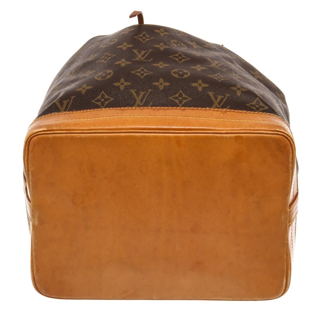 Brown and tan monogram coated canvas Louis Vuitton Noe GM with gold-tone hardware, tan vachetta leather trim, single adjustable flat shoulder strap, brown canvas lining and drawstring closure at top. 6.5"x7.5"x13.trap Drop:13"/mx19cmxmxStrap Drop:33c