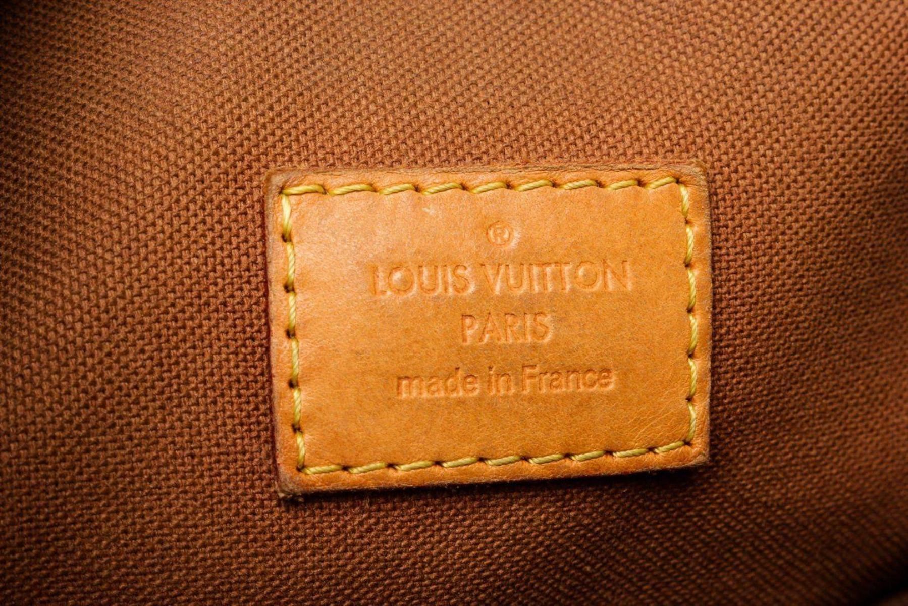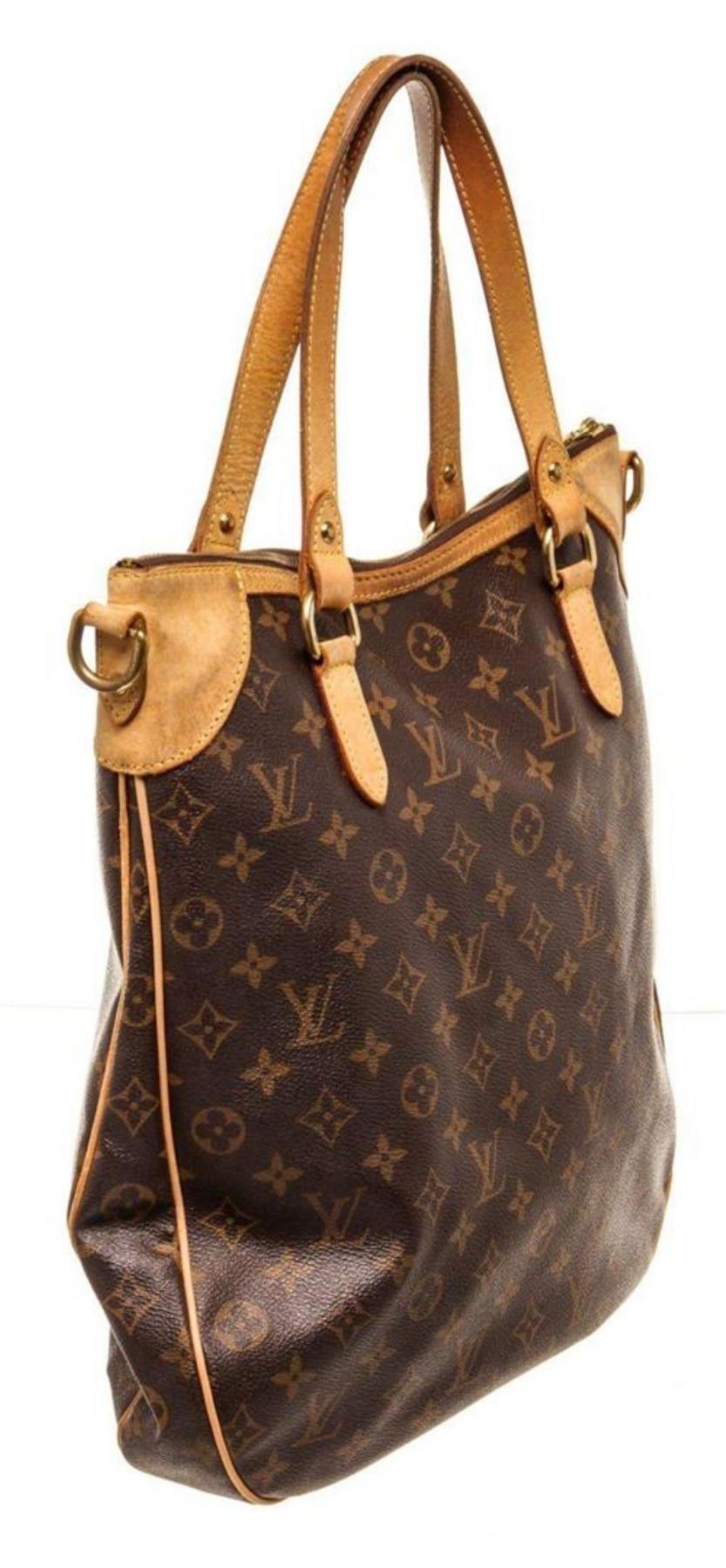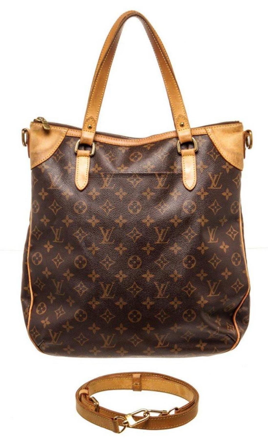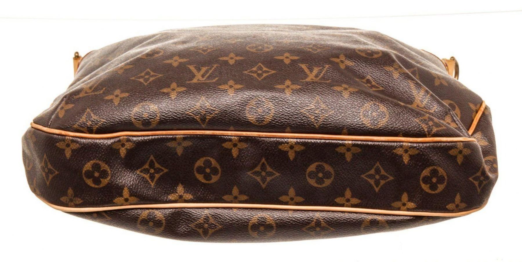 Louis Vuitton Brown Monogram Canvas Leather Odeon GM Crossbody Bag with monogram canvas, brass hardware, tan vachetta leather trim, single flat adjustable flat shoulder strap, single pocket at front, brown canvas lining, dual pockets at interior wall and zip closure at top.
