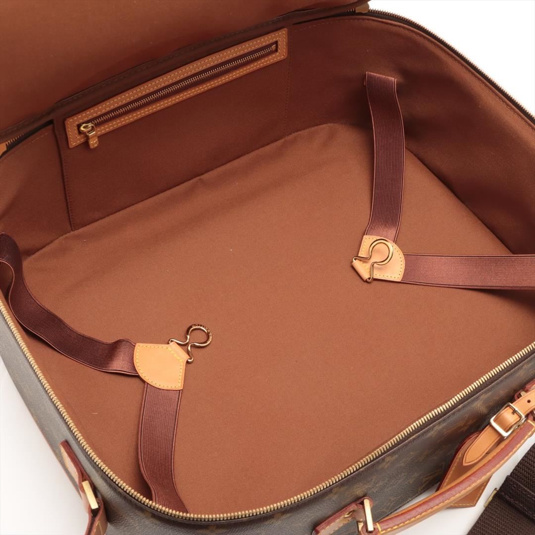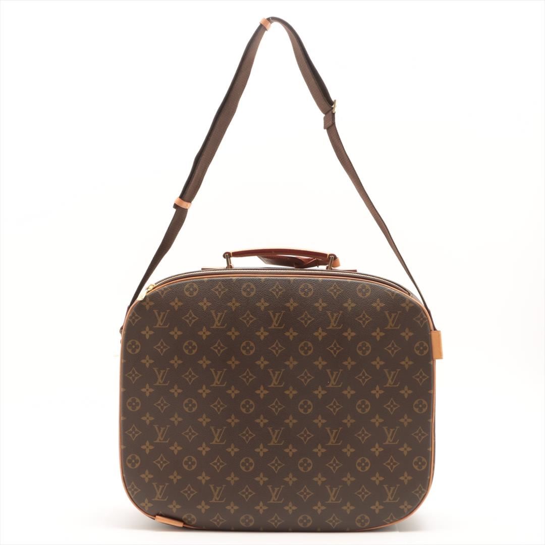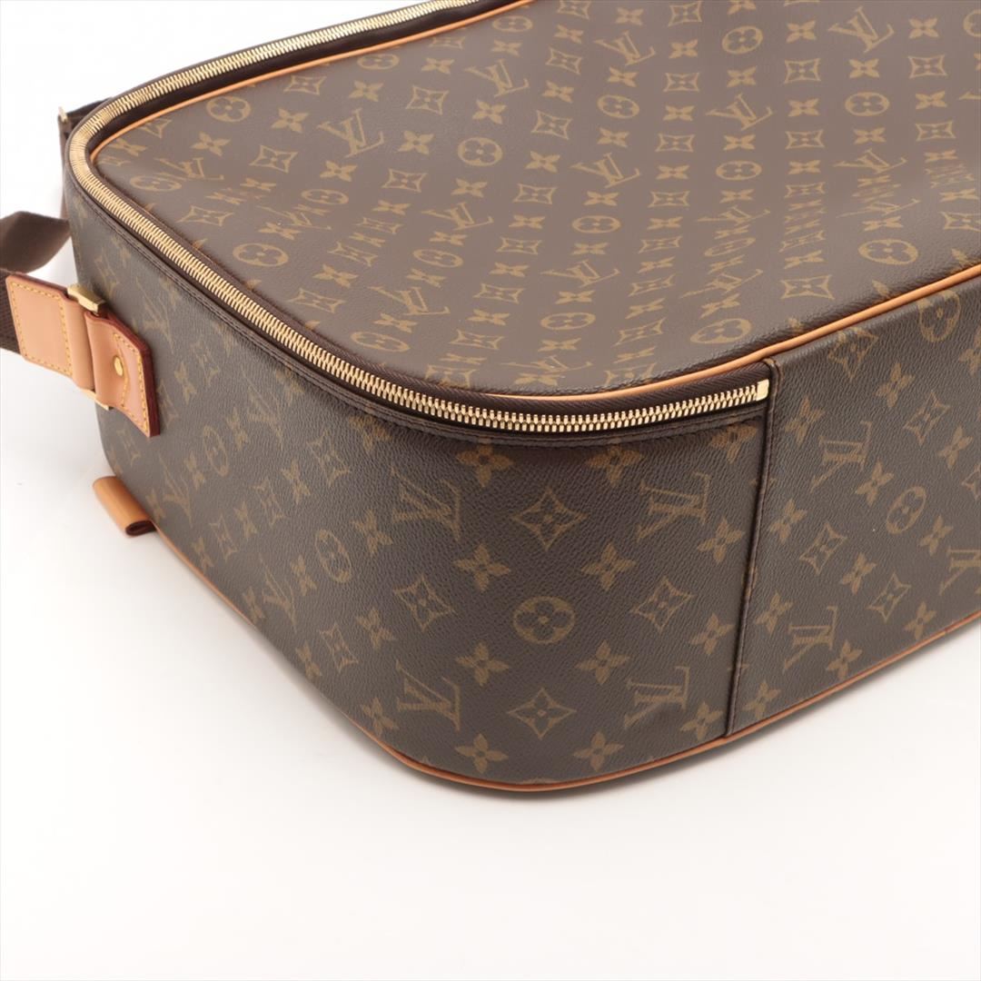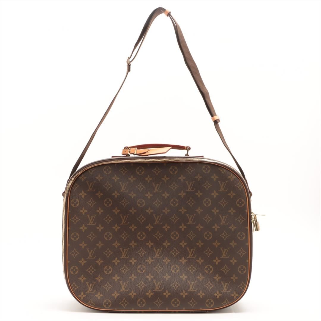 Brown and tan coated canvas Louis Vuitton Monogram Packall PM with gold-tone hardware, tan vachetta leather trim featuring yellow contrast stitching, adjustable canvas shoulder strap, single flat top handles featuring ID tag, brown woven lining, dual pock