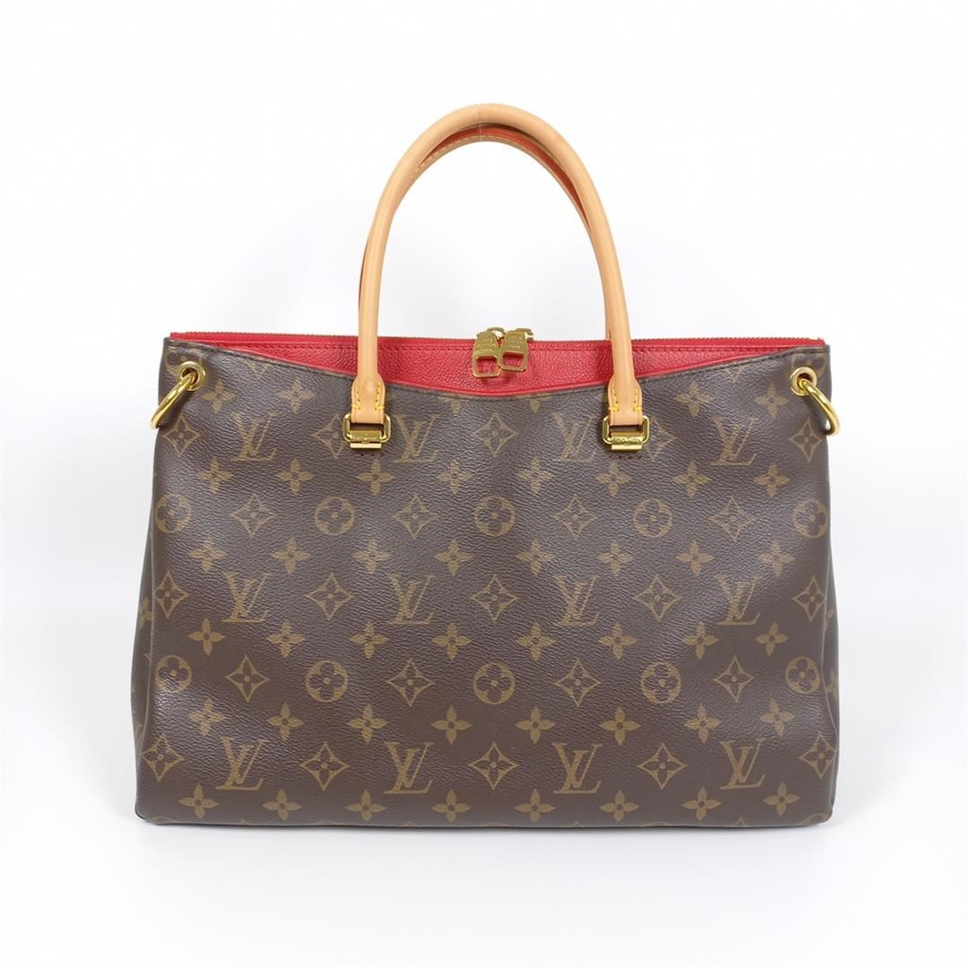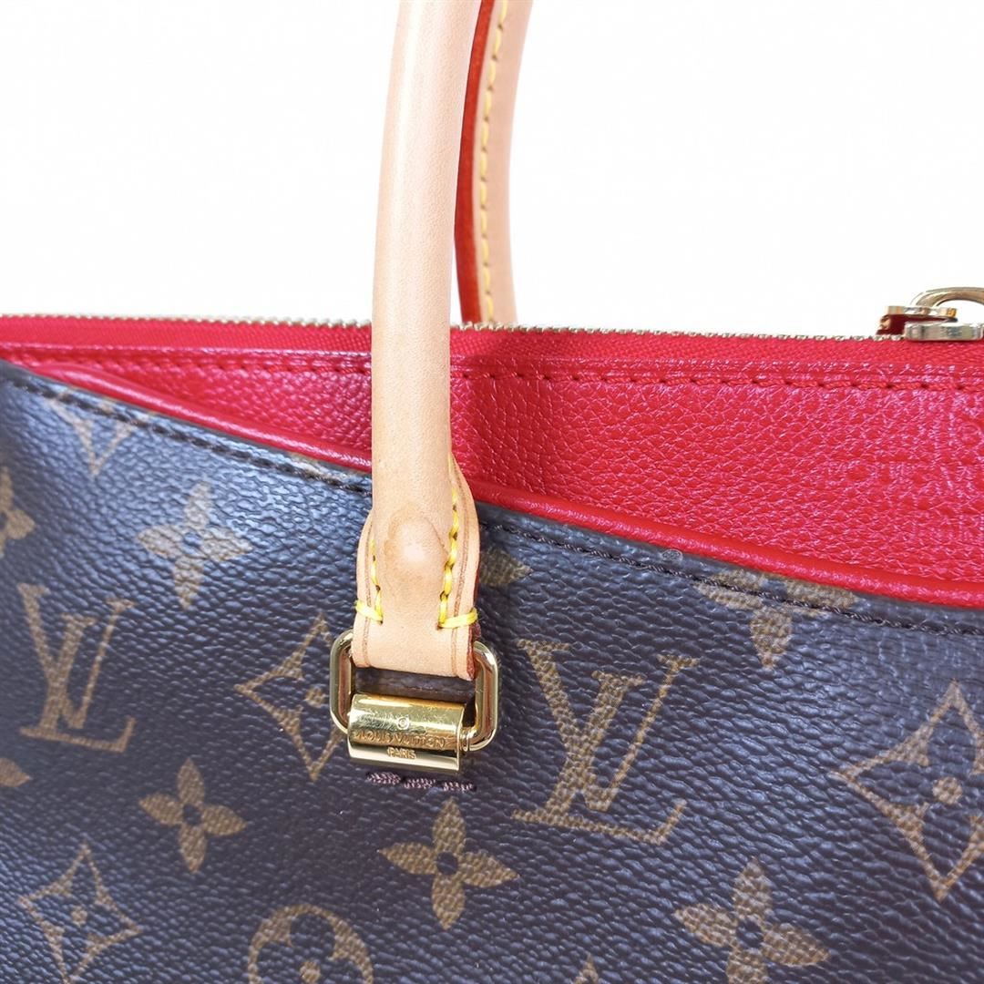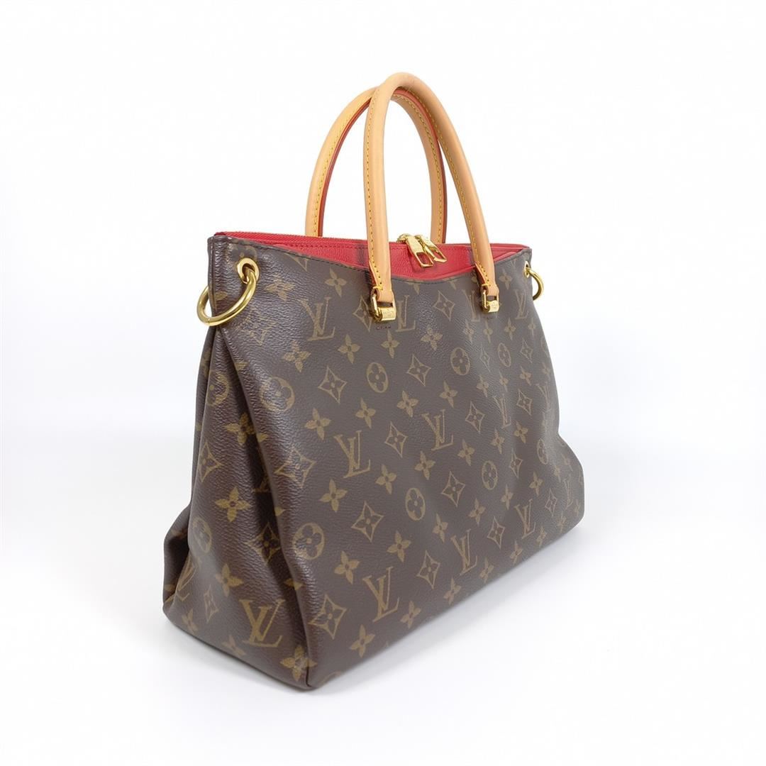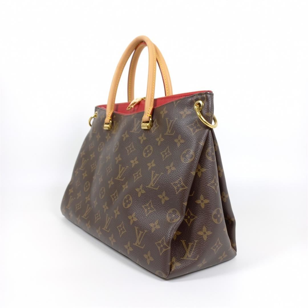 Brown and tan monogram coated canvas Louis Vuitton Pallas MM bag with gold-tone hardware, tan leather trim, red leather embellishment, dual rolled handles & single adjustable shoulder strap that can be detached from the bag, dual exterior pockets, red Alc