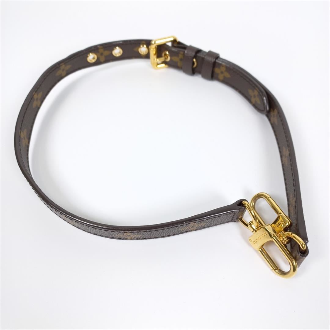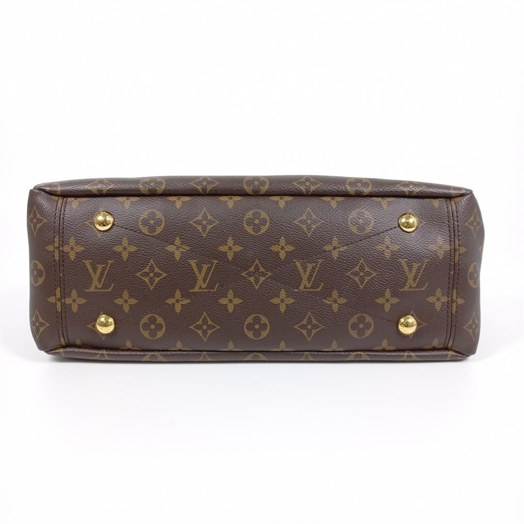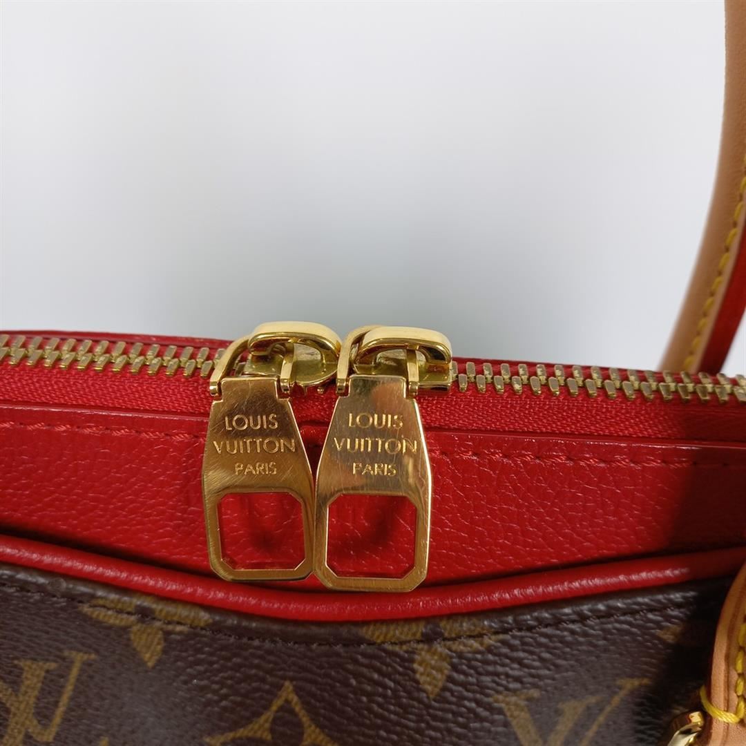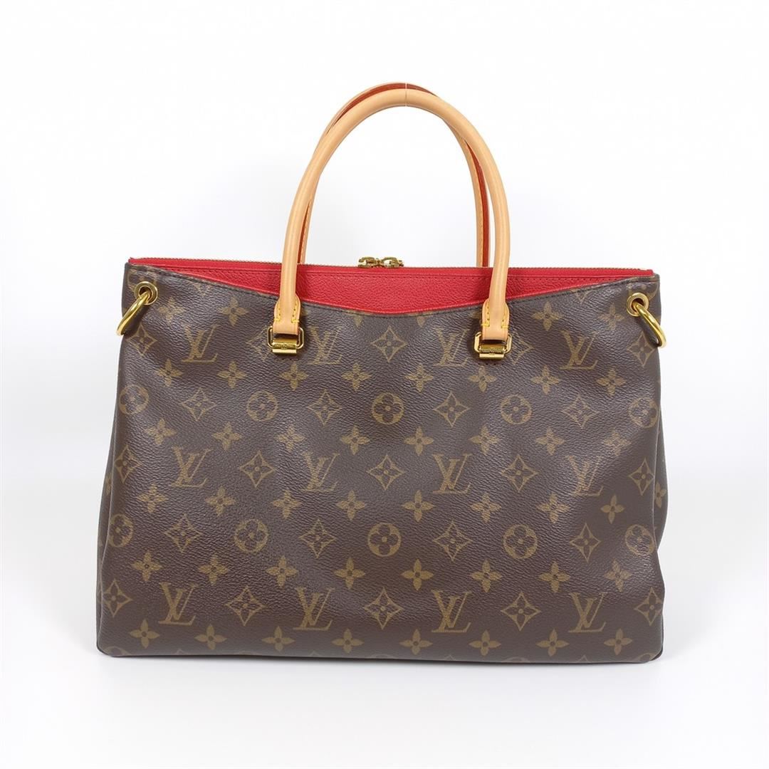 Brown and tan monogram coated canvas Louis Vuitton Pallas MM bag with gold-tone hardware, tan leather trim, red leather embellishment, dual rolled handles & single adjustable shoulder strap that can be detached from the bag, dual exterior pockets, red Alc