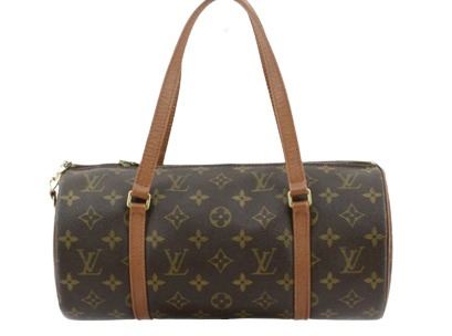 Brown and tan monogram coated canvas Louis Vuitton Papillon 30 cm with gold-tone hardware, brown leather trim, dual flat handles, brown Taiga leather interior and zip closure at top. 12"x6"x6"xBag Drop:6"/30cmx15.2cmx15.2cmxBag Drop:15.2cm