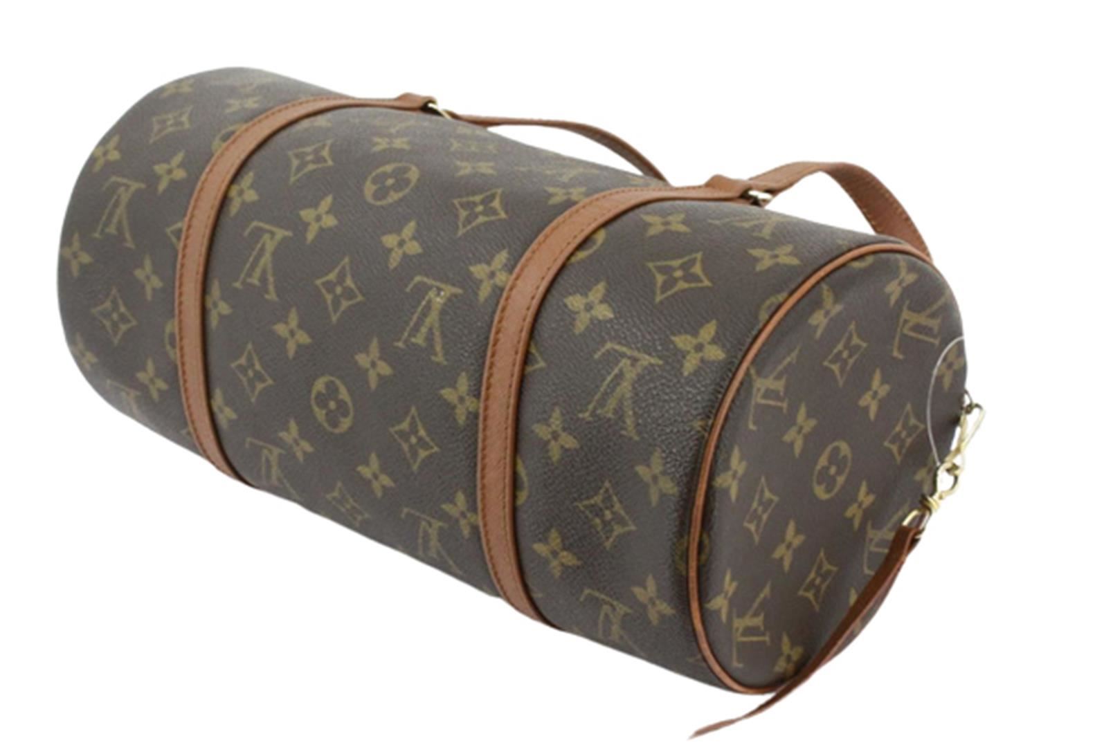 Louis Vuitton Brown Monogram Canvas Leather Papillon 30 cm Shoulder Bag. All available information is listed in the description and shown in the photos. Brown and tan monogram coated canvas Louis Vuitton Papillon 30 cm with gold-tone hardware, brown leather trim, dual flat handles, brown Taiga leather interior and zip closure at top. 12"x6"x6"xBag Drop:6"/30cmx15.2cmx15.2cmxBag Drop:15.2cm