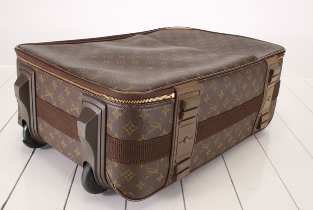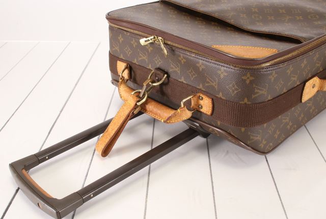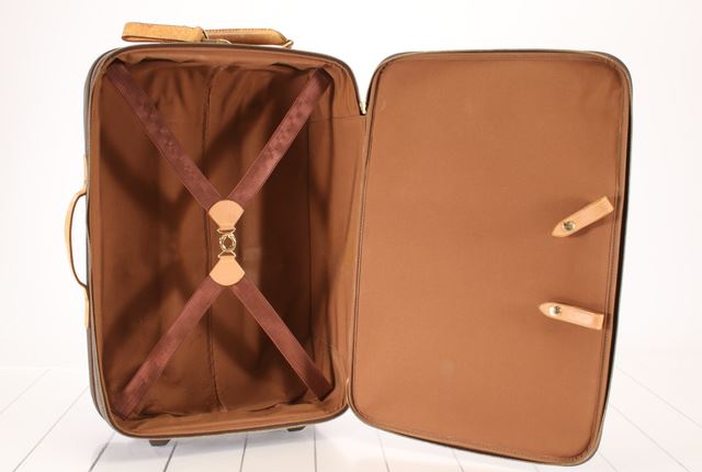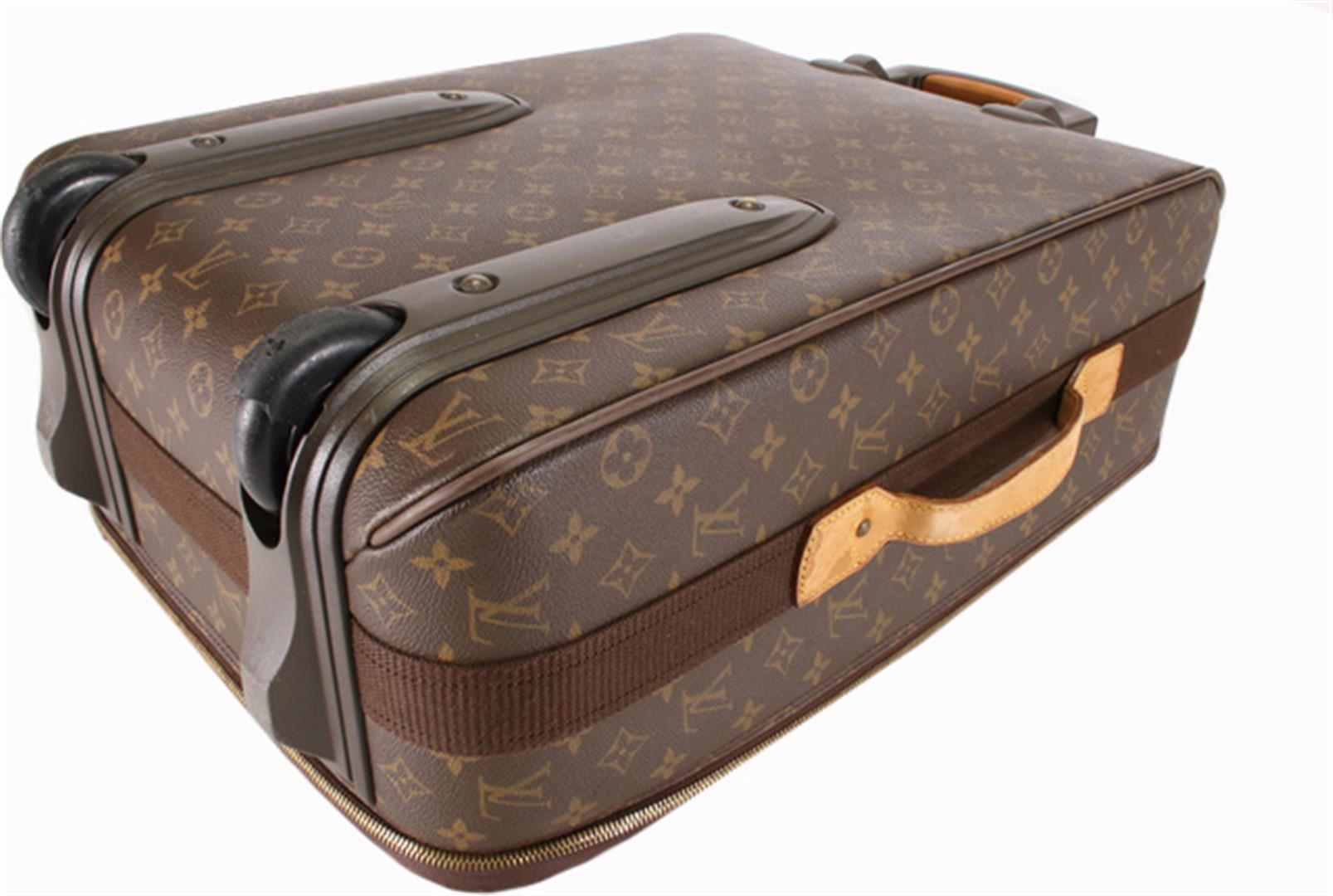 Men's brown and tan monogram coated canvas Louis Vuitton Pegase 60cm with gold-tone hardware, tan vachetta leather trim, dual flat handles at exterior, single telescopic handle, single slit pocket at exterior, brown nylon lining, single interior zip pocke