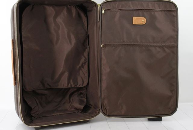 Men's brown and tan monogram coated canvas Louis Vuitton Pegase 70cm with gold-tone hardware, tan vachetta leather trim, dual flat handles at exterior, single telescopic handle, single slit pocket at exterior, brown nylon lining, single interior zip pocke