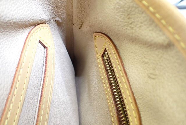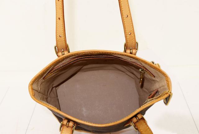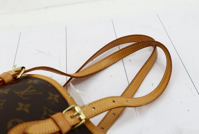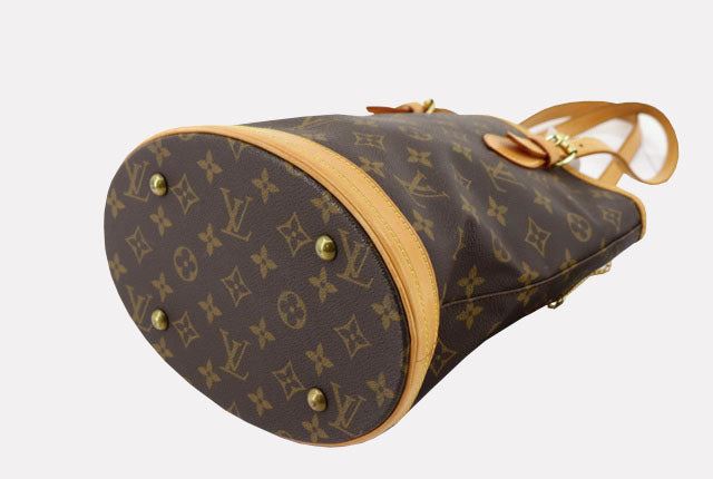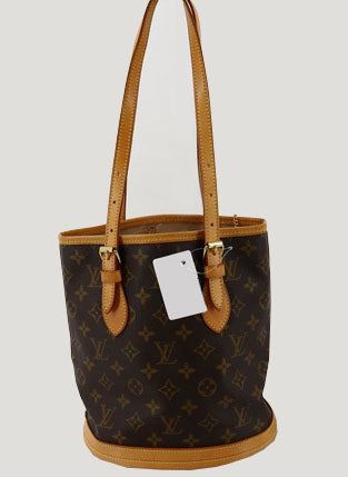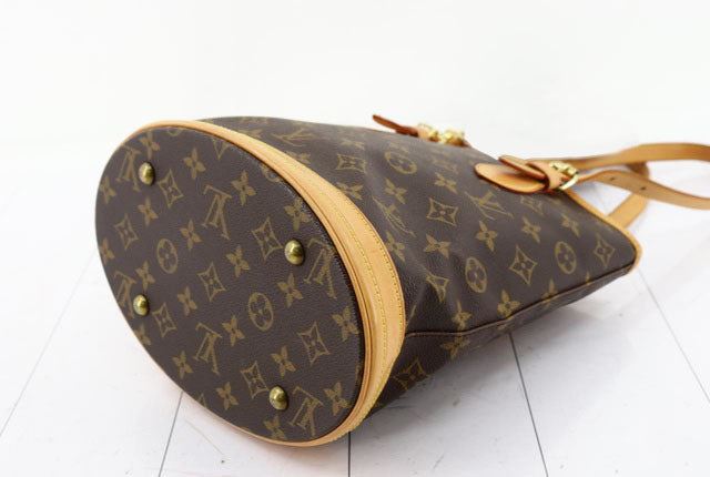 Brown and tan monogram coated canvas Louis Vuitton PM Bucket bag with gold-tone hardware, tan vachetta leather accents throughout, dual adjustable shoulder straps, beige coated lining, dual pockets at interior walls; one with zip closure and open top.