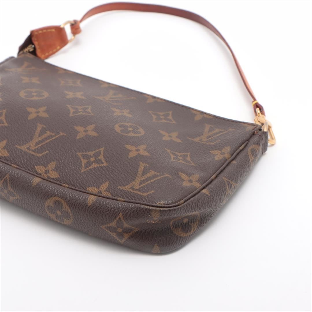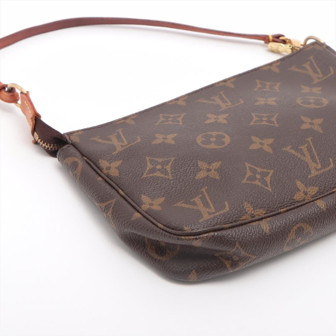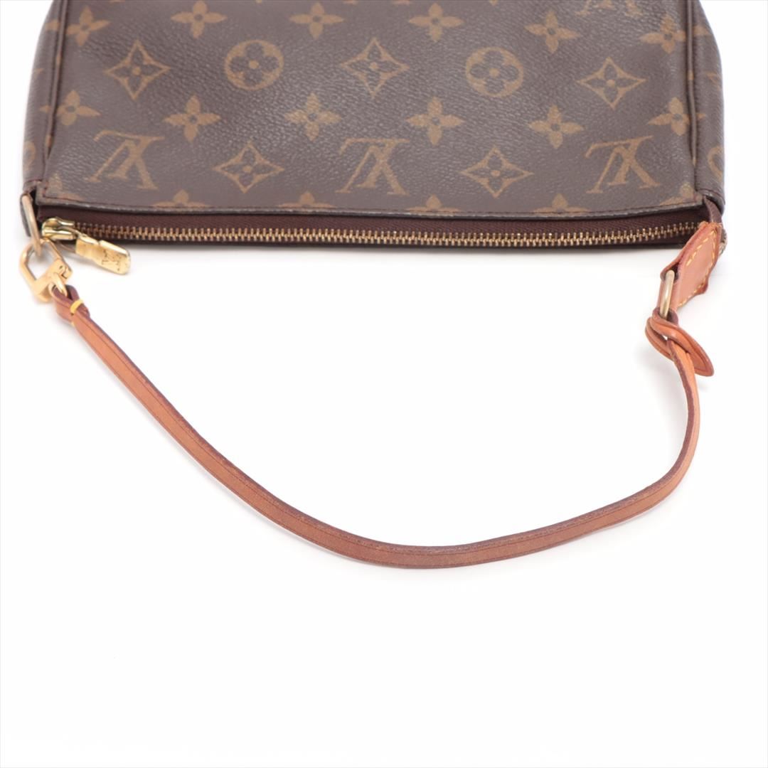 Brown and tan Monogram coated canvas Louis Vuitton Pochette Accessories shoulder bag with gold-tone hardware, tan Vachetta leather trim, a tan leather shoulder strap, brown canvas lining and zip closure at top. 8.5"x 5"x 1.5"xStrap Drop:6"/21.6cmx12.7cmx