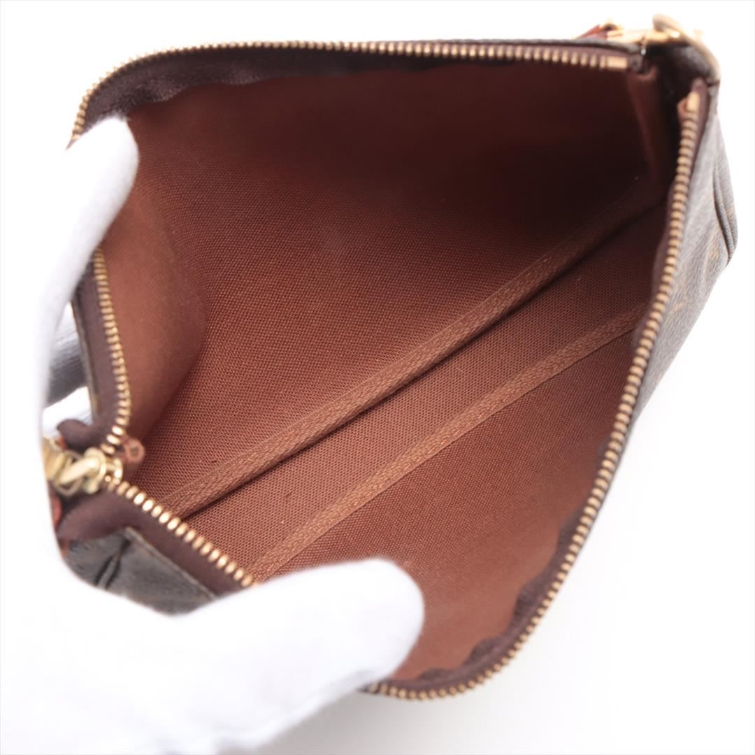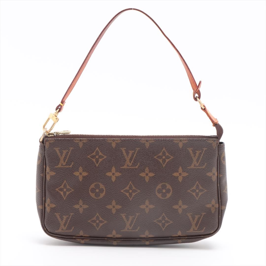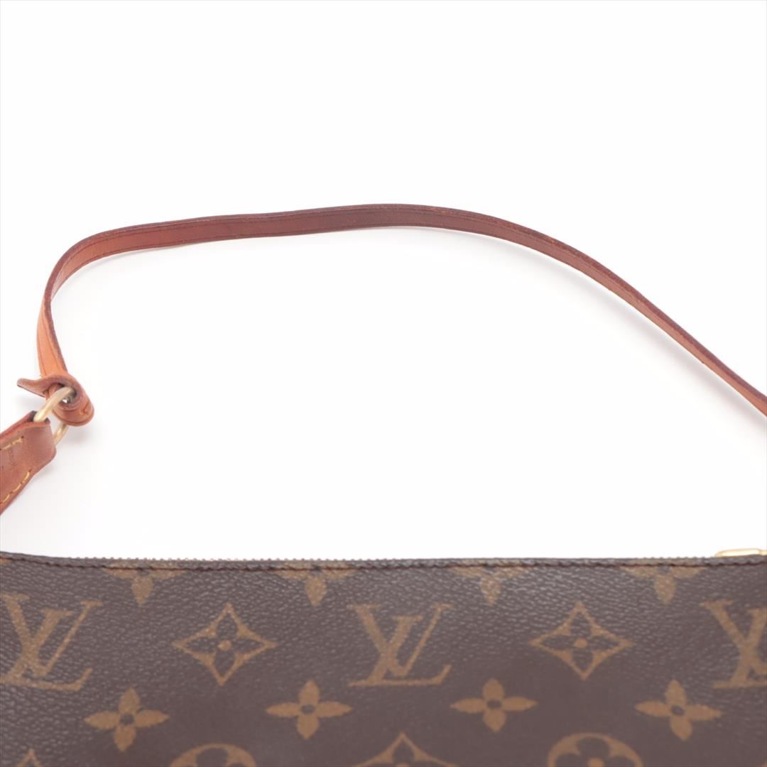 Brown and tan Monogram coated canvas Louis Vuitton Pochette Accessories shoulder bag with gold-tone hardware, tan Vachetta leather trim, a tan leather shoulder strap, brown canvas lining and zip closure at top. 8.5"x 5"x 1.5"xStrap Drop:6"/21.6cmx12.7cmx