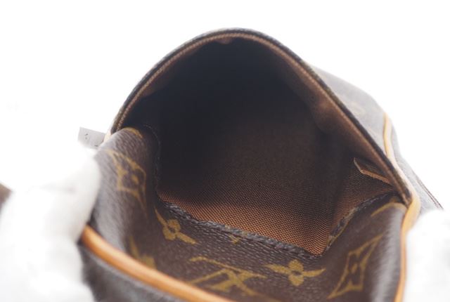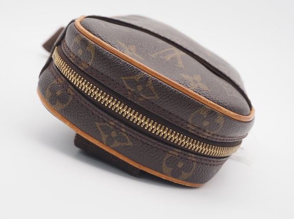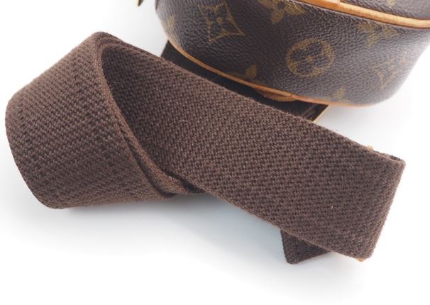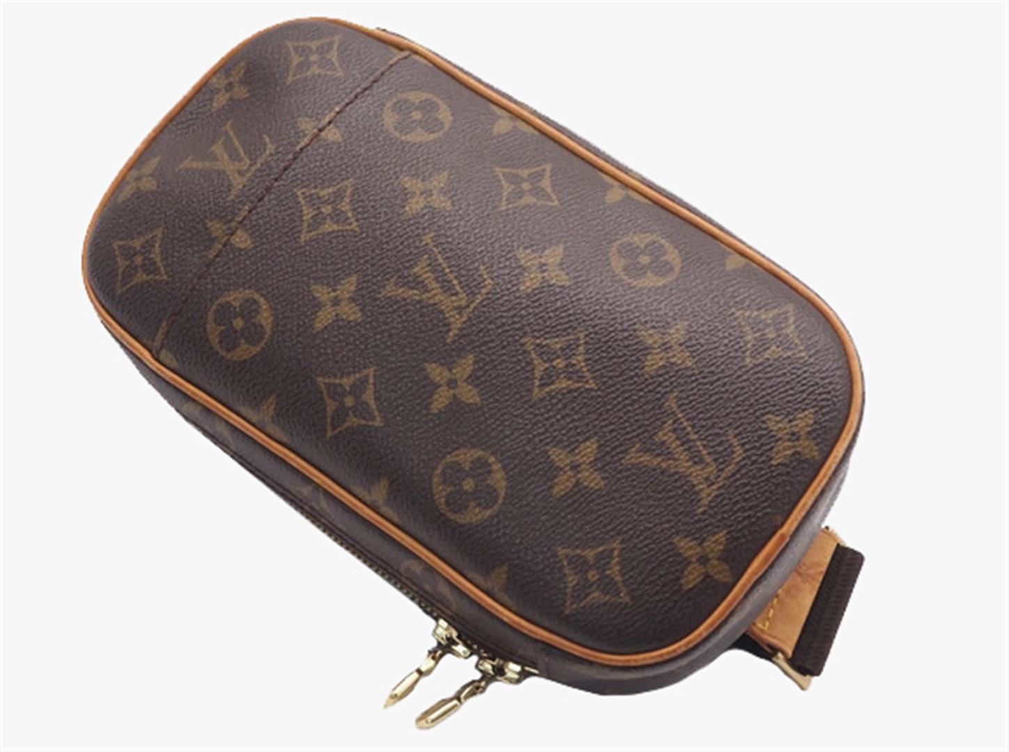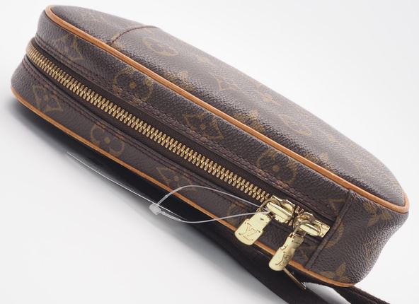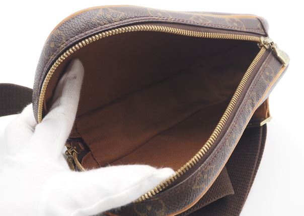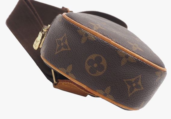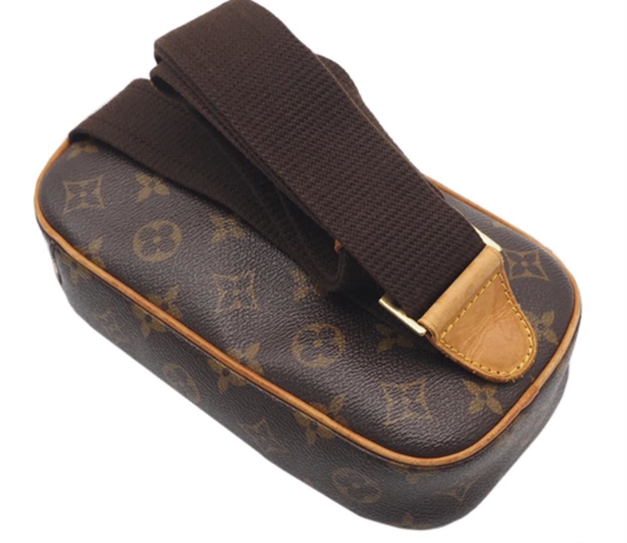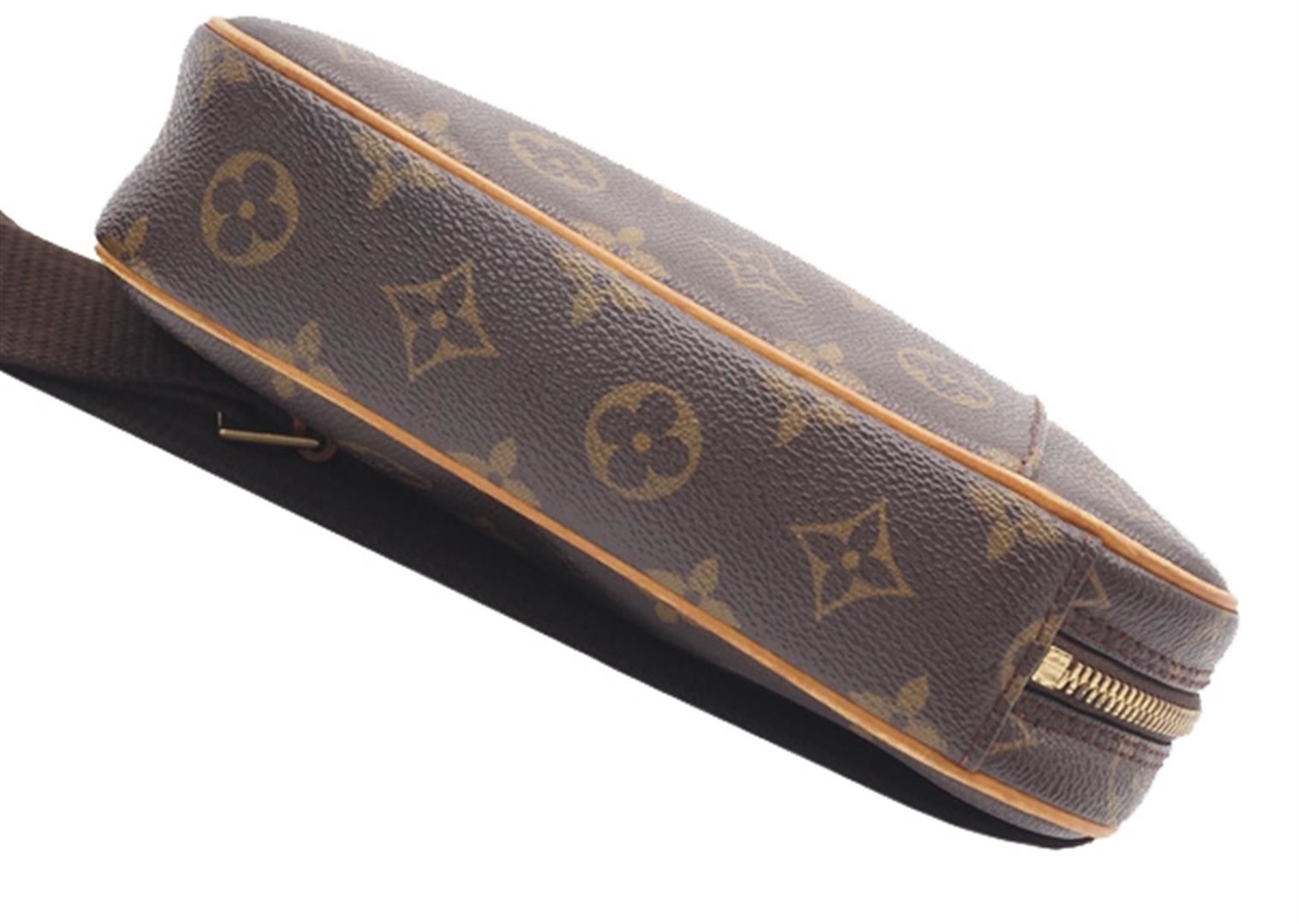 Brown and tan monogram coated canvas Louis Vuitton Pochette Gange bag with gold-tone hardware, tan vachetta leather trim, adjustable woven shoulder strap, slit pocket at front, brown canvas lining, single interior compartment and zip closure at top. 5"