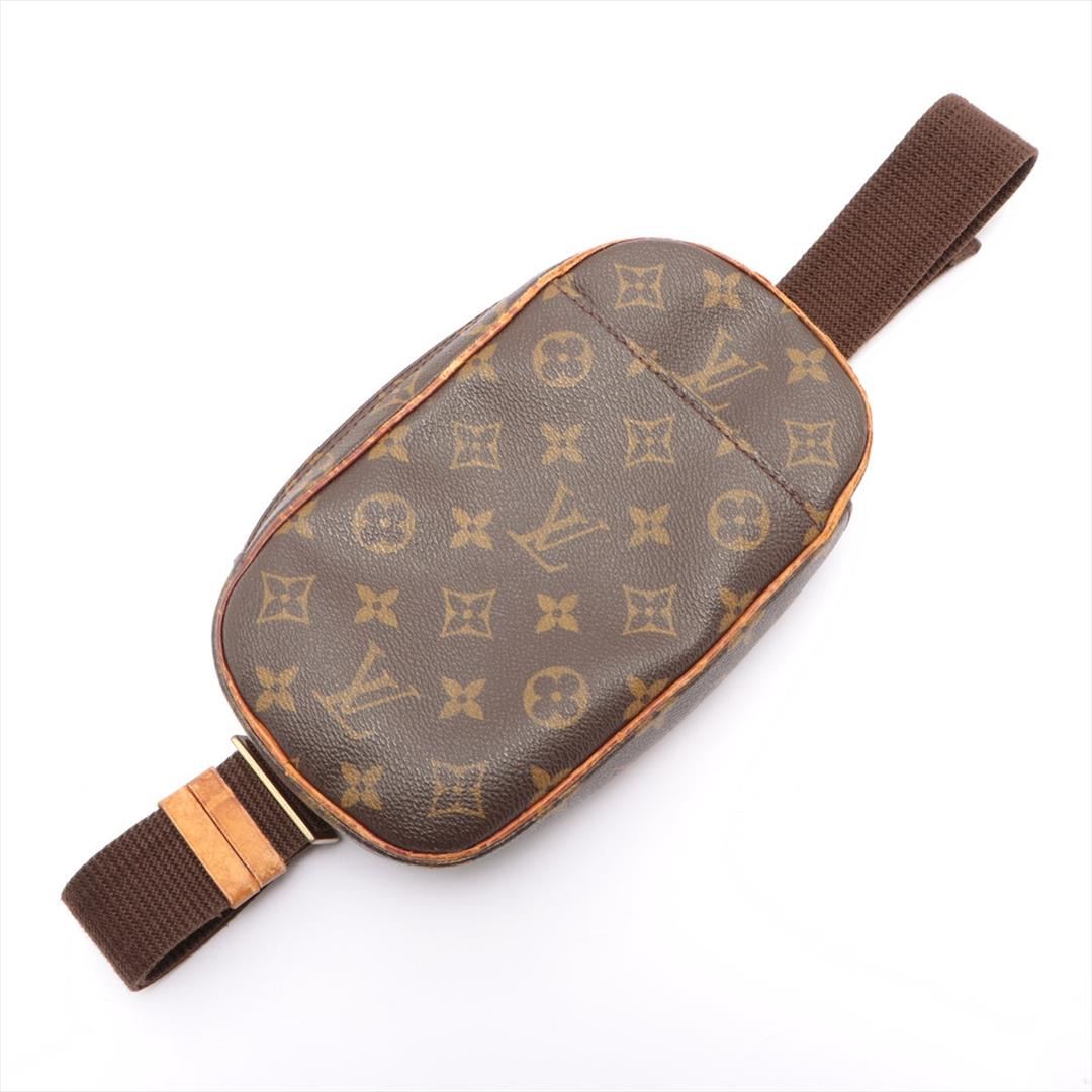 One Louis Vuitton Brown Monogram Canvas Leather Pochette Gange Waist Bag. Item is sold AS-IS. Please check photos and descriptions for all available details. Brown and tan monogram coated canvas Louis Vuitton Pochette Gange bag with gold-tone hardware, tan vachetta leather trim, adjustable woven shoulder strap, slit pocket at front, brown canvas lining, single interior compartment and zip closure at top. 5"x2"x9"xBag Drop:25"/12.7cmx5cmx22.8cmxBag Drop:63.5cm