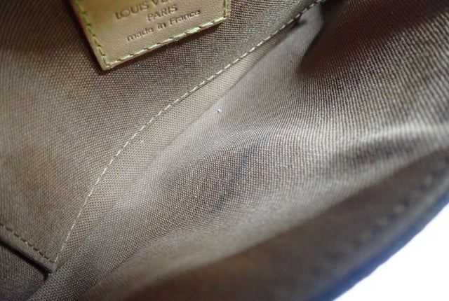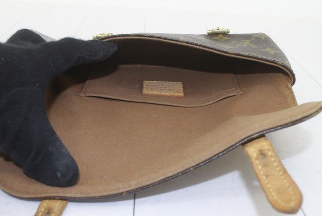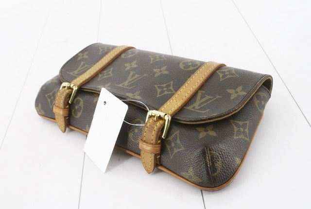 One Louis Vuitton Brown Monogram Canvas Leather Pochette Marelle Waist Bag. Item is sold AS-IS. Please check photos and descriptions for all available details. Brown and tan Monogram coated canvas Louis Vuitton Pochette Marelle waist bag with gold-tone hardware, tan vachetta leather trim, single flat shoulder strap, brown canvas lining, three interior compartments and dual buckle closures at front. 9.8" x 4.1" Handle Drop: 38.5" L end to end, fits waist 28" - 35"