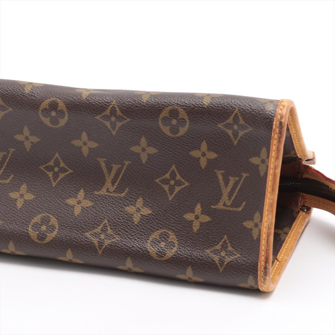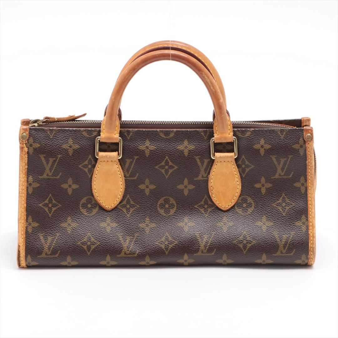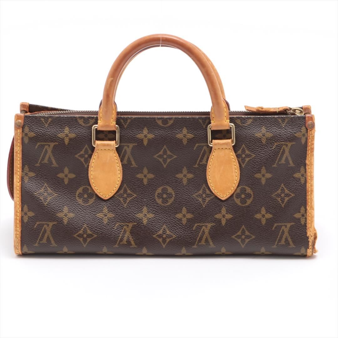 Brown and tan monogram coated canvas Louis Vuitton Popincourt Long handbag with gold-tone hardware, tan vachetta leather trim, tan leather dual rolled handles, brown canvas lining, single slit pocket at interior wall and zip closure at top. 11.5"x4.75"