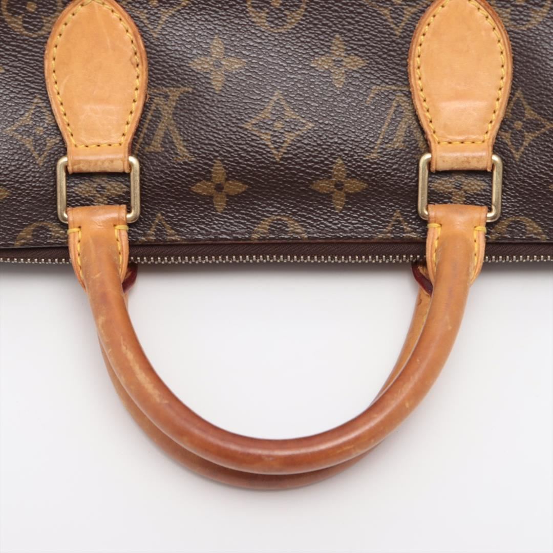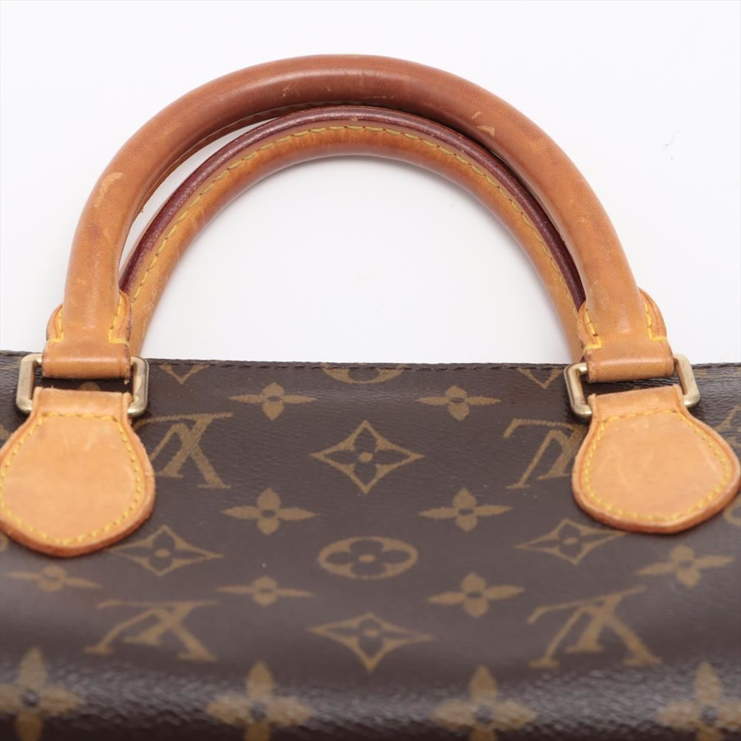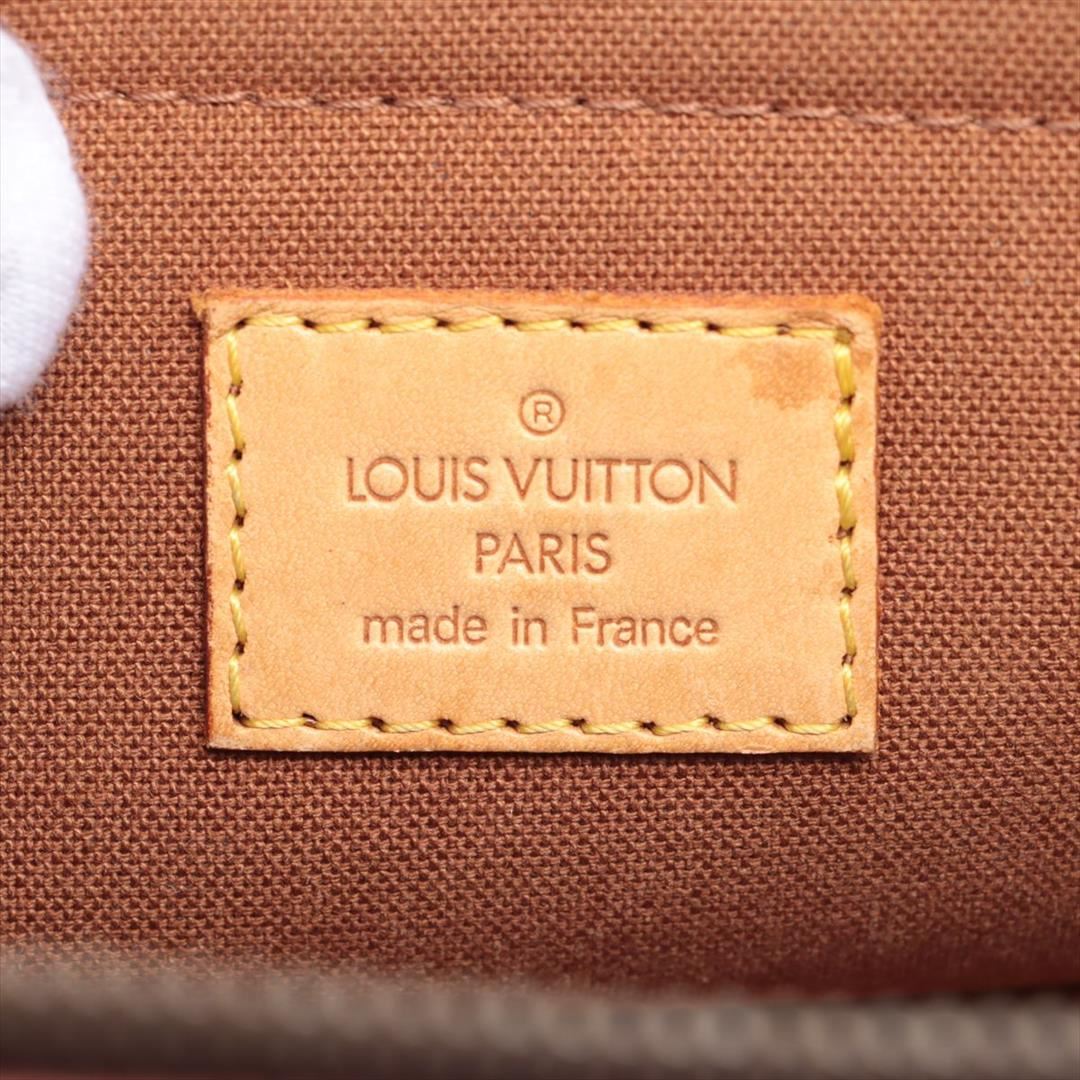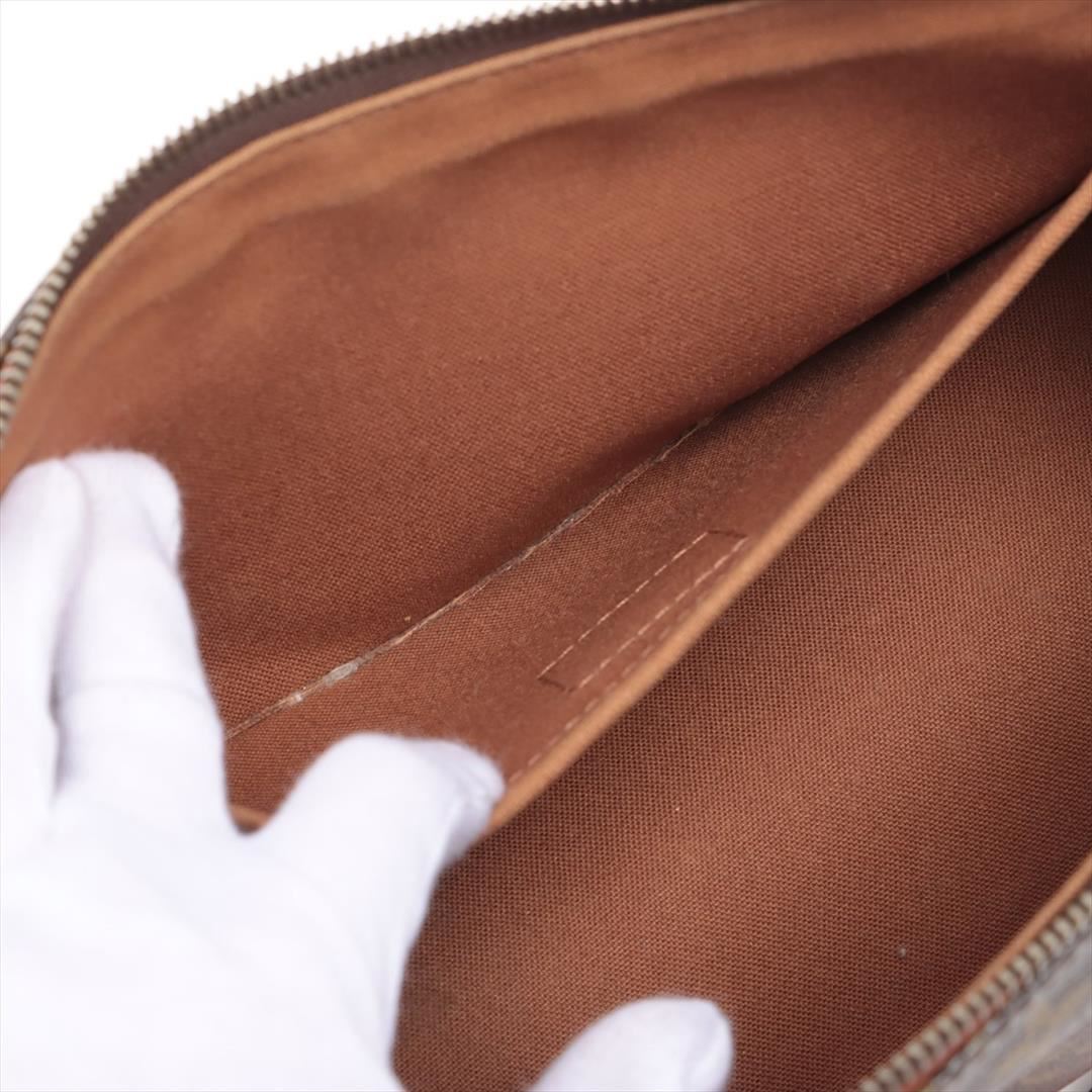 Brown and tan monogram coated canvas Louis Vuitton Popincourt Long handbag with gold-tone hardware, tan vachetta leather trim, tan leather dual rolled handles, brown canvas lining, single slit pocket at interior wall and zip closure at top. 11.5"x4.75"