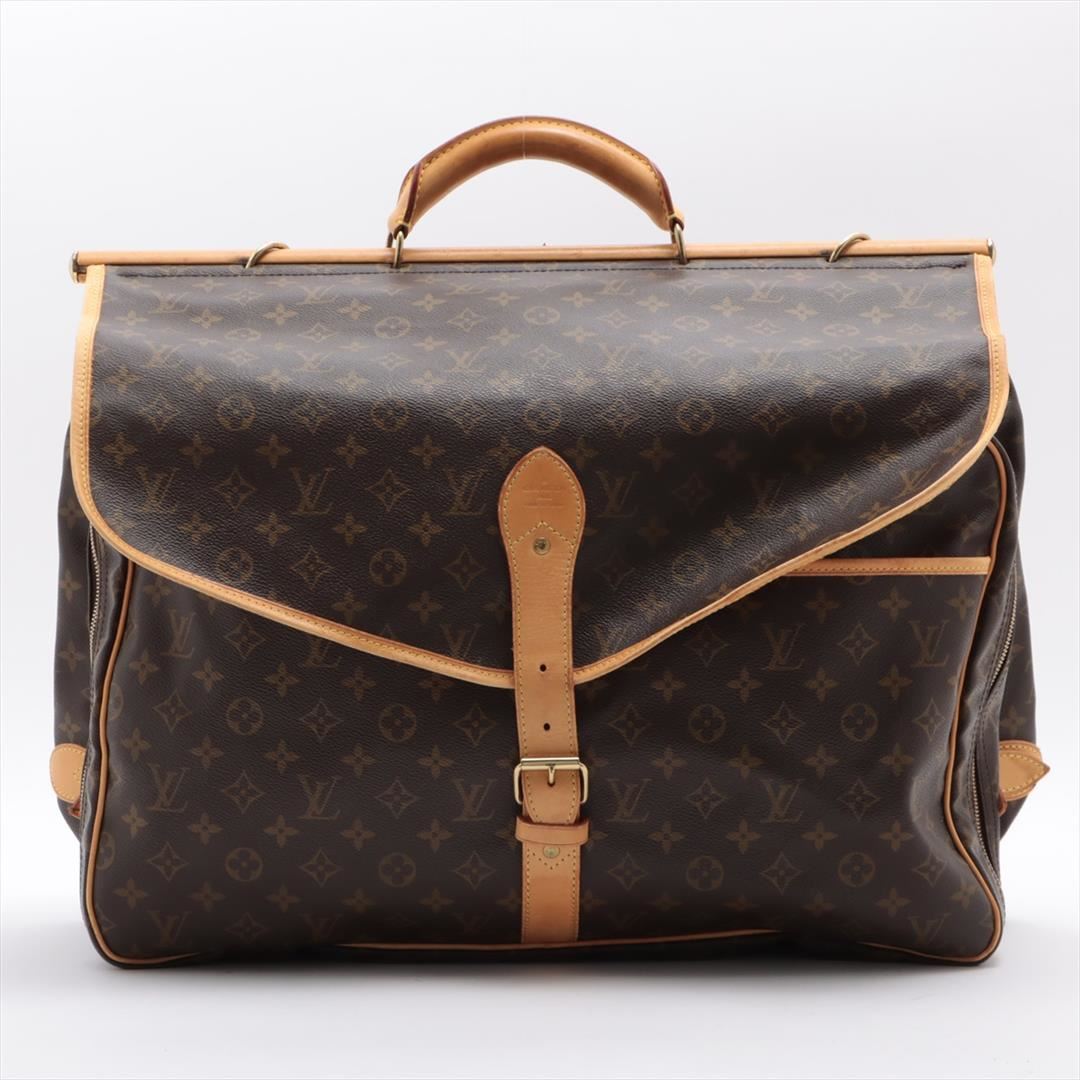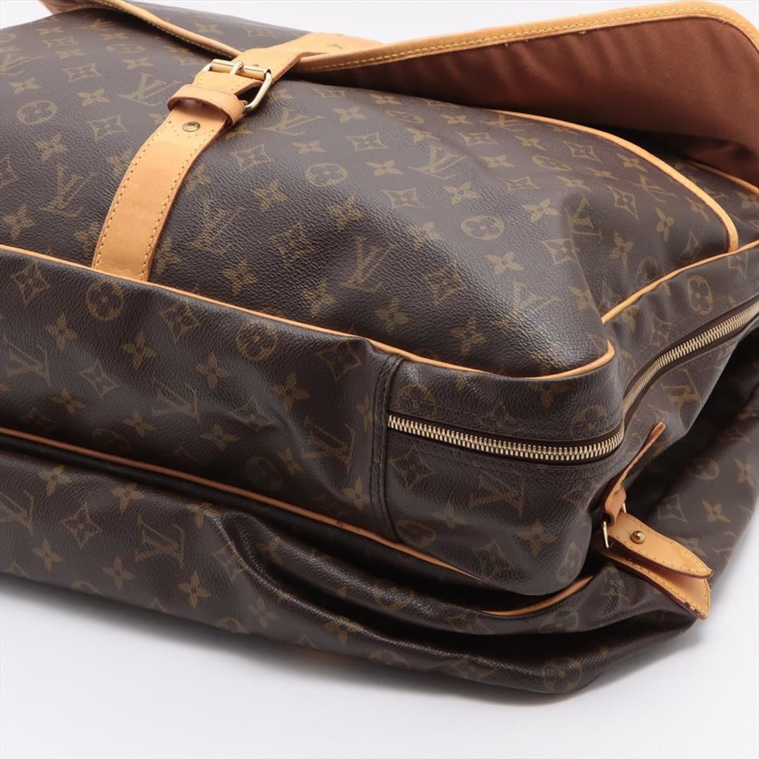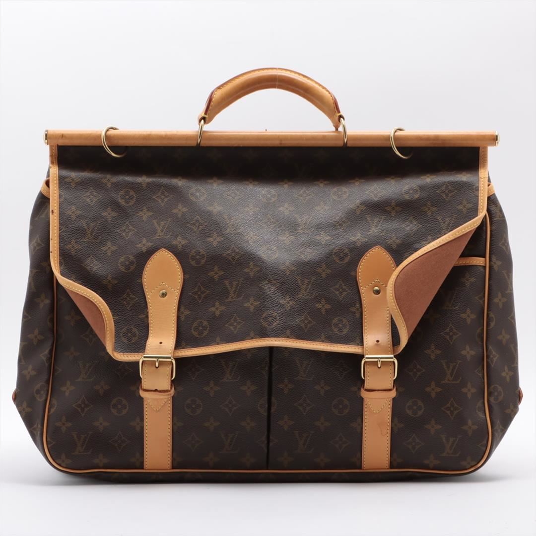 Men's brown and tan monogram coated canvas vintage Louis Vuitton Sac Chasse Hunting bag with brass hardware, single rolled top handle, tan Vachetta leather trim, three slit pockets under flaps, brown canvas lining, dual interior compartments; one with zip