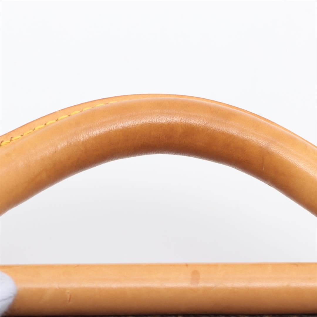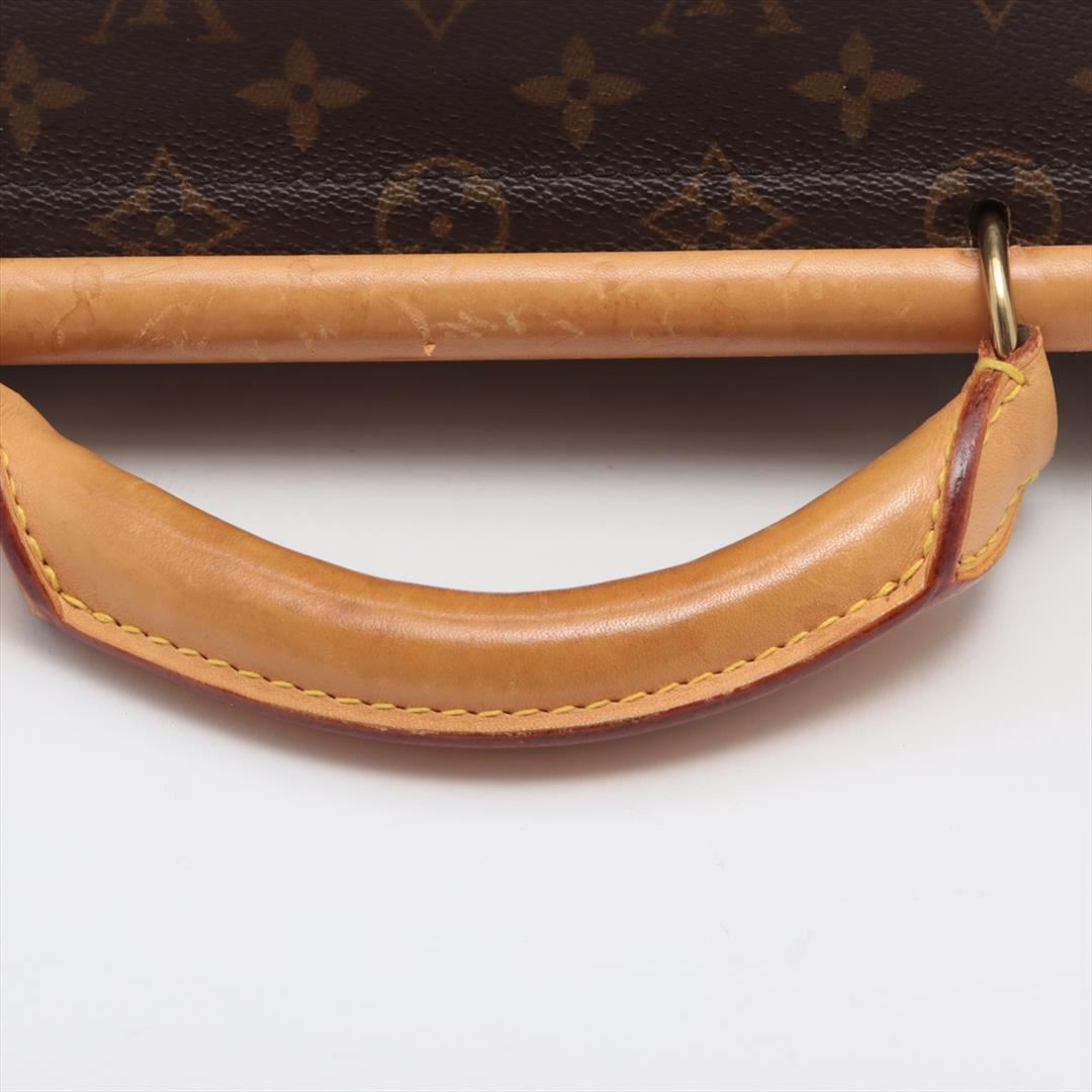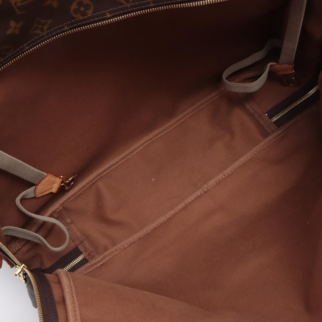 Men's brown and tan monogram coated canvas vintage Louis Vuitton Sac Chasse Hunting bag with brass hardware, single rolled top handle, tan Vachetta leather trim, three slit pockets under flaps, brown canvas lining, dual interior compartments; one with zip
