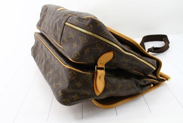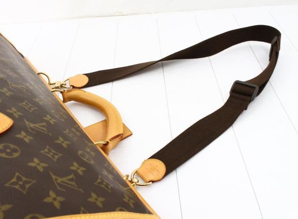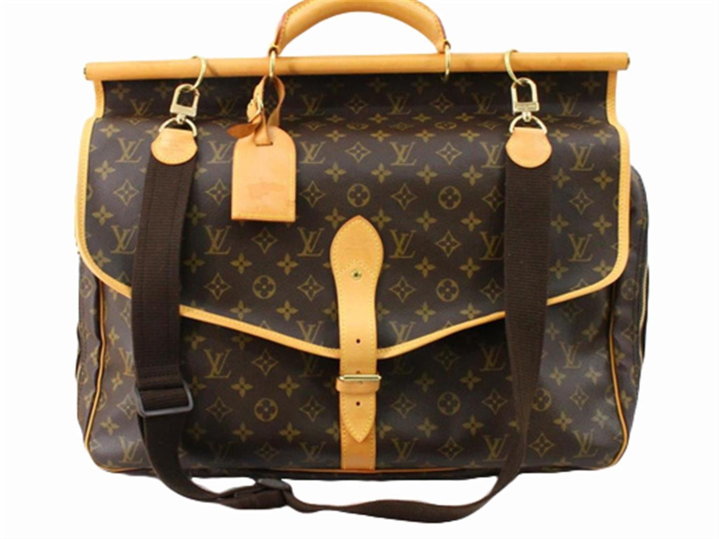 Men's brown and tan monogram coated canvas vintage Louis Vuitton Sac Chasse Hunting bag with brass hardware, single rolled top handle, tan Vachetta leather trim, three slit pockets under flaps, brown canvas lining, dual interior compartments; one with zip
