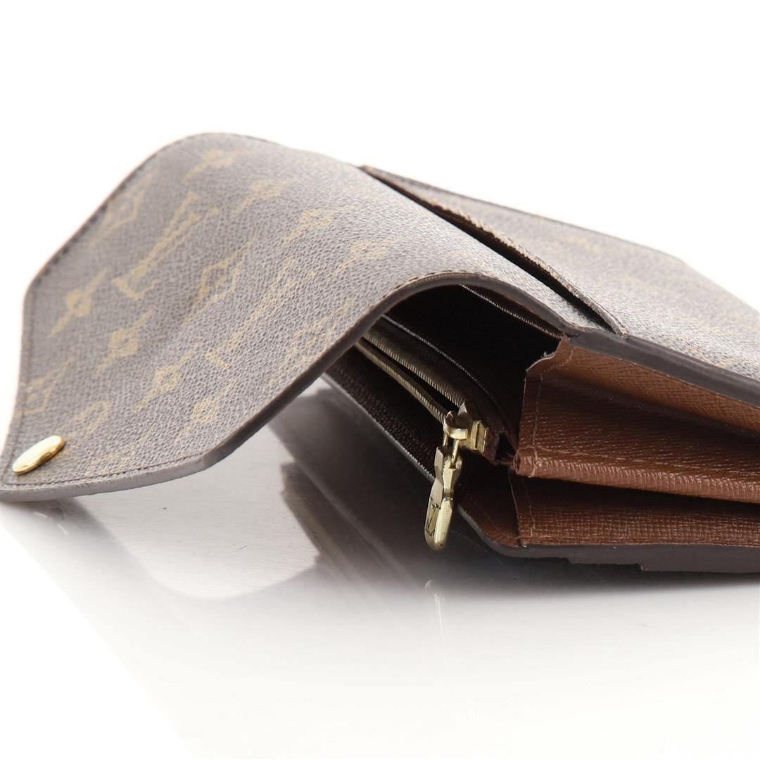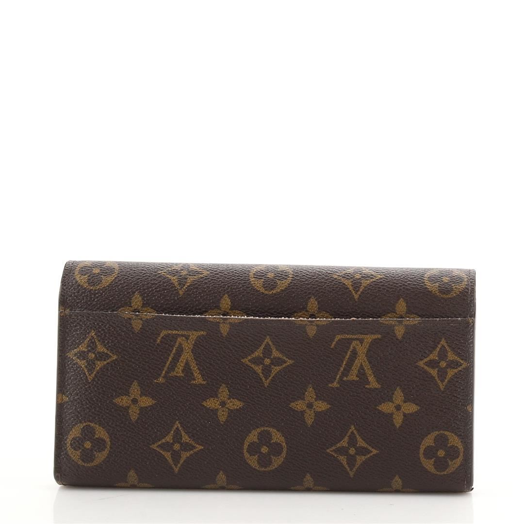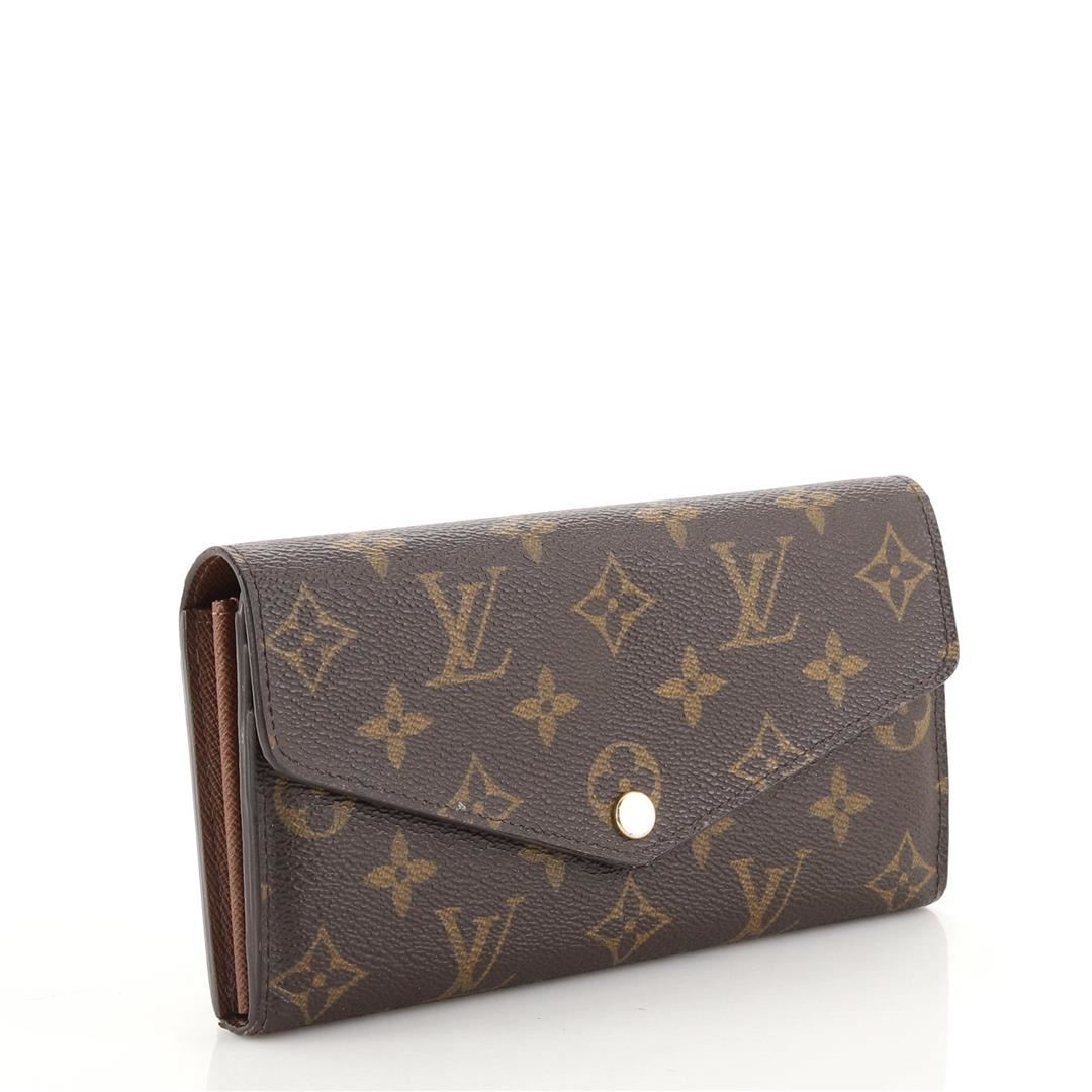 Louis Vuitton Brown Monogram Canvas Leather Sarah Wallet NM Condition Details: Moderate peeling on exterior corners, curling on flap, rear pocket and interior card slot edges. Minor wear in interior, scratches and discoloration on hardware. Measurements: Height 4", Width 7.5", Depth 1", Strap Drop -"