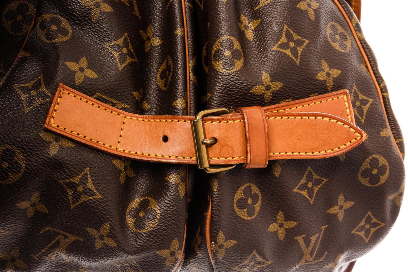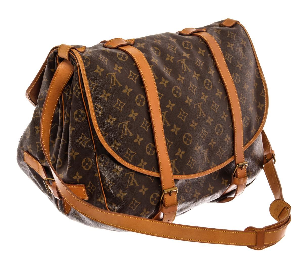 Louis Vuitton Brown Monogram Canvas Leather Saumur 43 Messenger Bag. All available information is listed in the description and shown in the photos. Louis Vuitton Brown Monogram Canvas Leather Saumur 43 Messenger Bag with brown coated canvas, brass hardware, single adjustable shoulder strap, leather trim embellishment, canvas lining & three interior pockets, buckle closure at front. Height: 13.75" Width: 17" Depth: 8.25", Shoulder Strap Drop Max: 16.5-19.5" / 34.92 x 43.18 x 20.95 Cm
