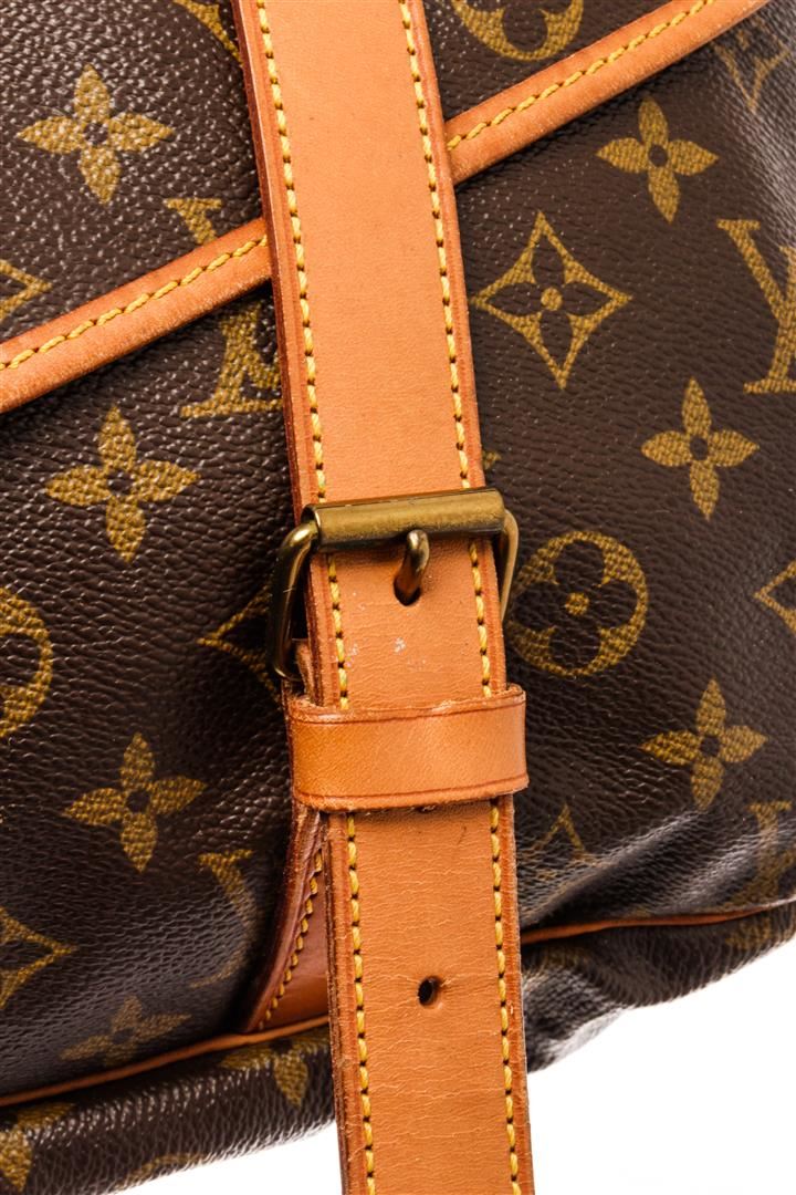 Louis Vuitton Brown Monogram Canvas Leather Saumur 43 Messenger Bag. All available information is listed in the description and shown in the photos. Louis Vuitton Brown Monogram Canvas Leather Saumur 43 Messenger Bag with brown coated canvas, brass hardware, single adjustable shoulder strap, leather trim embellishment, canvas lining & three interior pockets, buckle closure at front. Height: 13.75" Width: 17" Depth: 8.25", Shoulder Strap Drop Max: 16.5-19.5" / 34.92 x 43.18 x 20.95 Cm