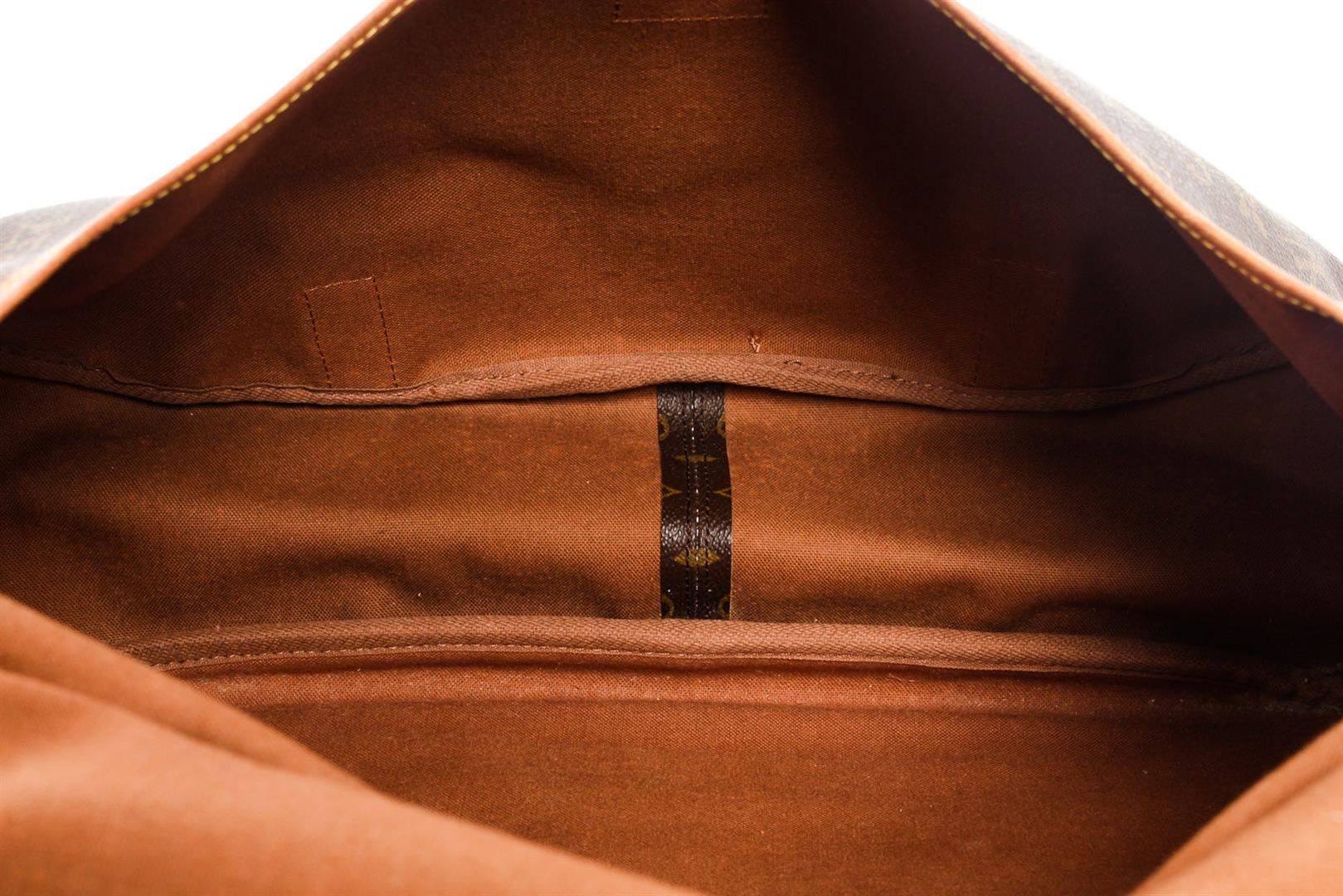 Brown and tan monogram coated canvas Louis Vuitton Saumur th gold-tone hardware, tan vachetta leather accents, adjustable flat shoulder strap, brown canvas interior, dual interior compartments, three pockets at interior walls and four buckle closures at e