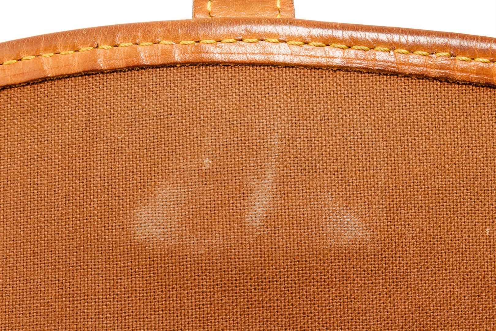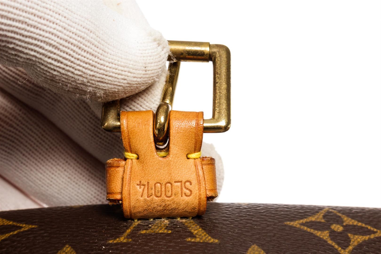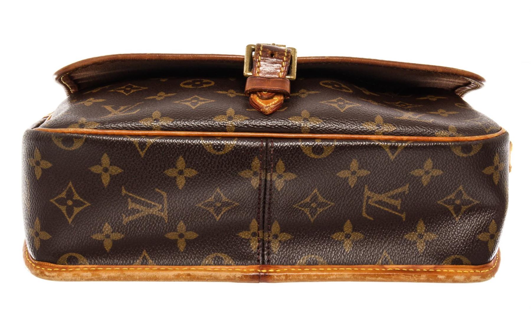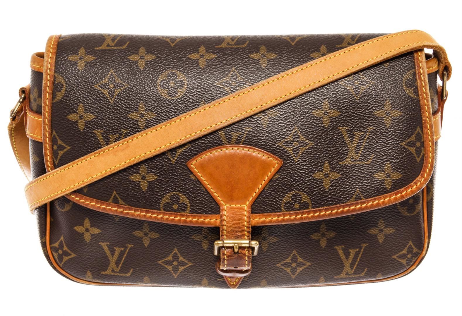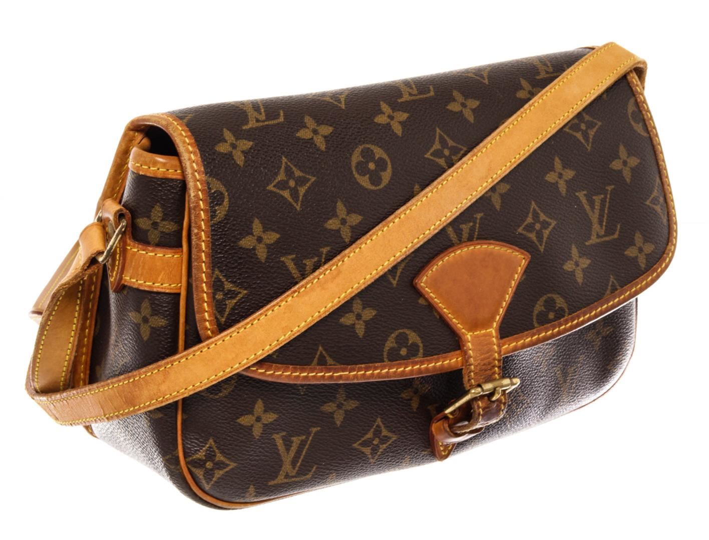 Brown and tan monogram coated canvas Louis Vuitton Sologne bag with brass hardware, tan vachetta leather trim, adjustable flat shoulder strap featuring shoulder pad, exterior slip pocket at back, single pocket at flap underside, brown canvas lining, single zip pocket at interior wall and buckle closure at front flap. 11"x3.5"x7"xBag Drop:24"/27.9cmx8.9cmx17.7cmxBag Drop:60.9cm