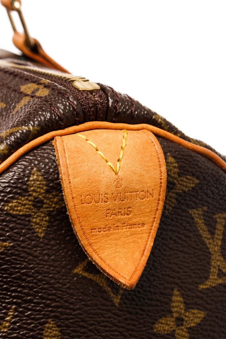 Louis Vuitton Brown Monogram Canvas Leather Speedy 30 Satchel Bag. All available information is listed in the description and shown in the photos. Louis Vuitton Brown Monogram Canvas Leather Speedy 30 Satchel Bag with brass hardware, dual rolled leather top handles, leather trim embellishment, canvas lining & single interior pocket, zip closure at top. Height: 10" Width: 10.25" Depth: 7.5", Handle Drop: 4.5" / 25.4 x 26.03 x 19.05 cm