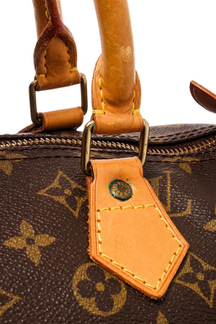 Louis Vuitton Brown Monogram Canvas Leather Speedy 30 Satchel Bag. All available information is listed in the description and shown in the photos. Louis Vuitton Brown Monogram Canvas Leather Speedy 30 Satchel Bag with brass hardware, dual rolled leather top handles, leather trim embellishment, canvas lining & single interior pocket, zip closure at top. Height: 10" Width: 10.25" Depth: 7.5", Handle Drop: 4.5" / 25.4 x 26.03 x 19.05 cm