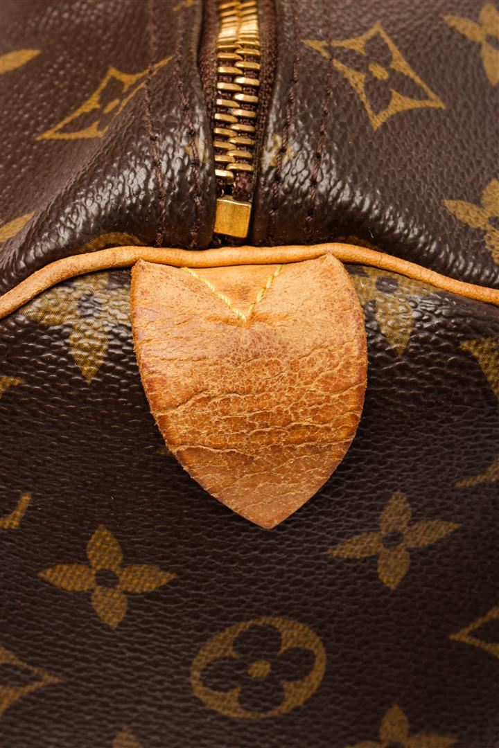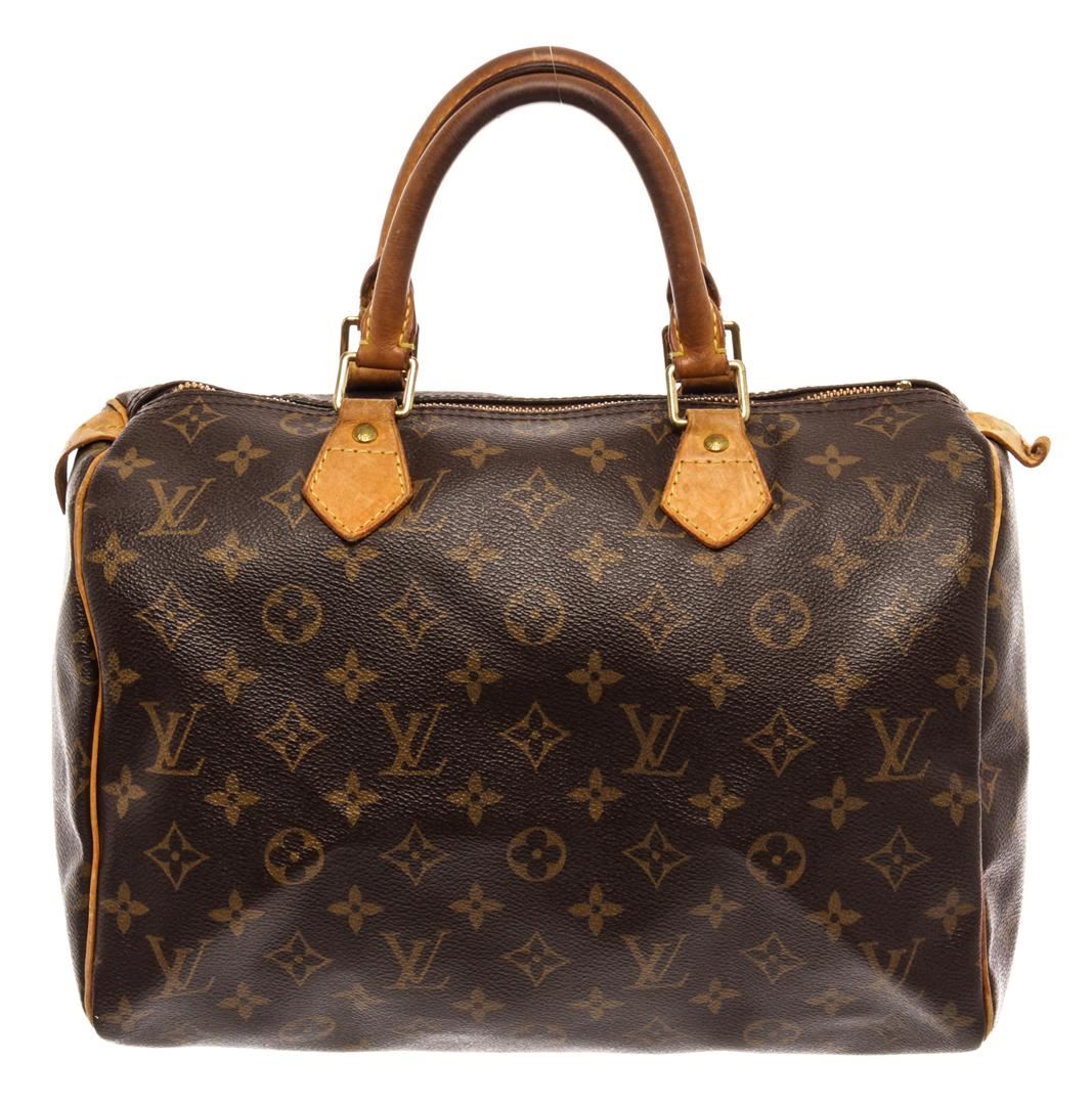Louis Vuitton Brown Monogram Canvas Leather Speedy 30 Satchel Bag. All available information is listed in the description and shown in the photos. Louis Vuitton Brown Monogram Canvas Leather Speedy 30 Satchel Bag with brass hardware, leather trim, rolled handles, canvas lining & single interior pocket, zip closure at top. Height: 9.5" Width: 11.5" Depth: 7", Handle Drop: 3.5" / 24.13 x 29.21 x 17.78 Cm